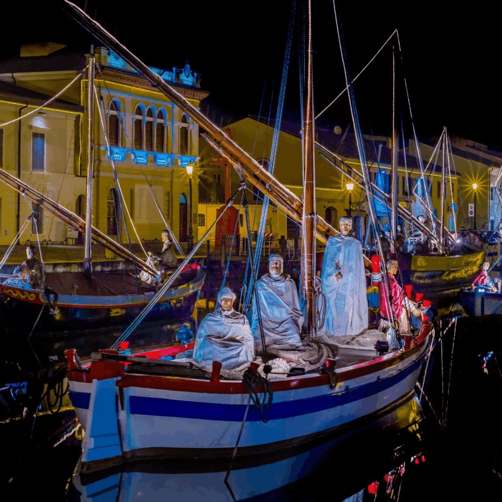 Segue la scoperta del suggestivo Presepe della Marineria, nato nel 1986 da un’idea di Guerrino Gardini con statue lignee scolpite e vestite con materiali tradizionali della marineria. Ogni anno si aggiunge una nuova figura, e oggi il presepe conta circa cinquanta statue illuminate, che al calare della sera creano un’atmosfera teatrale sul porto.
