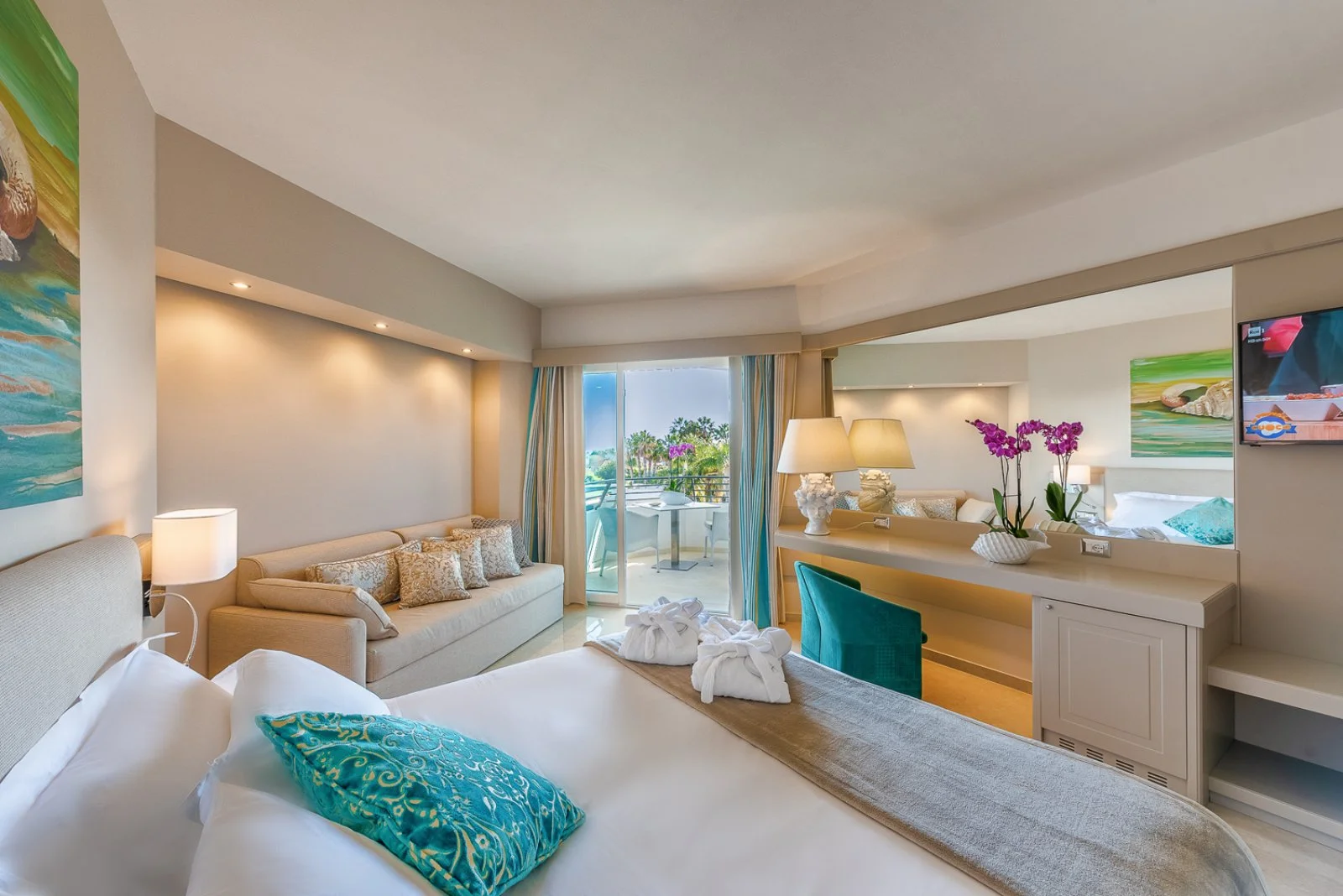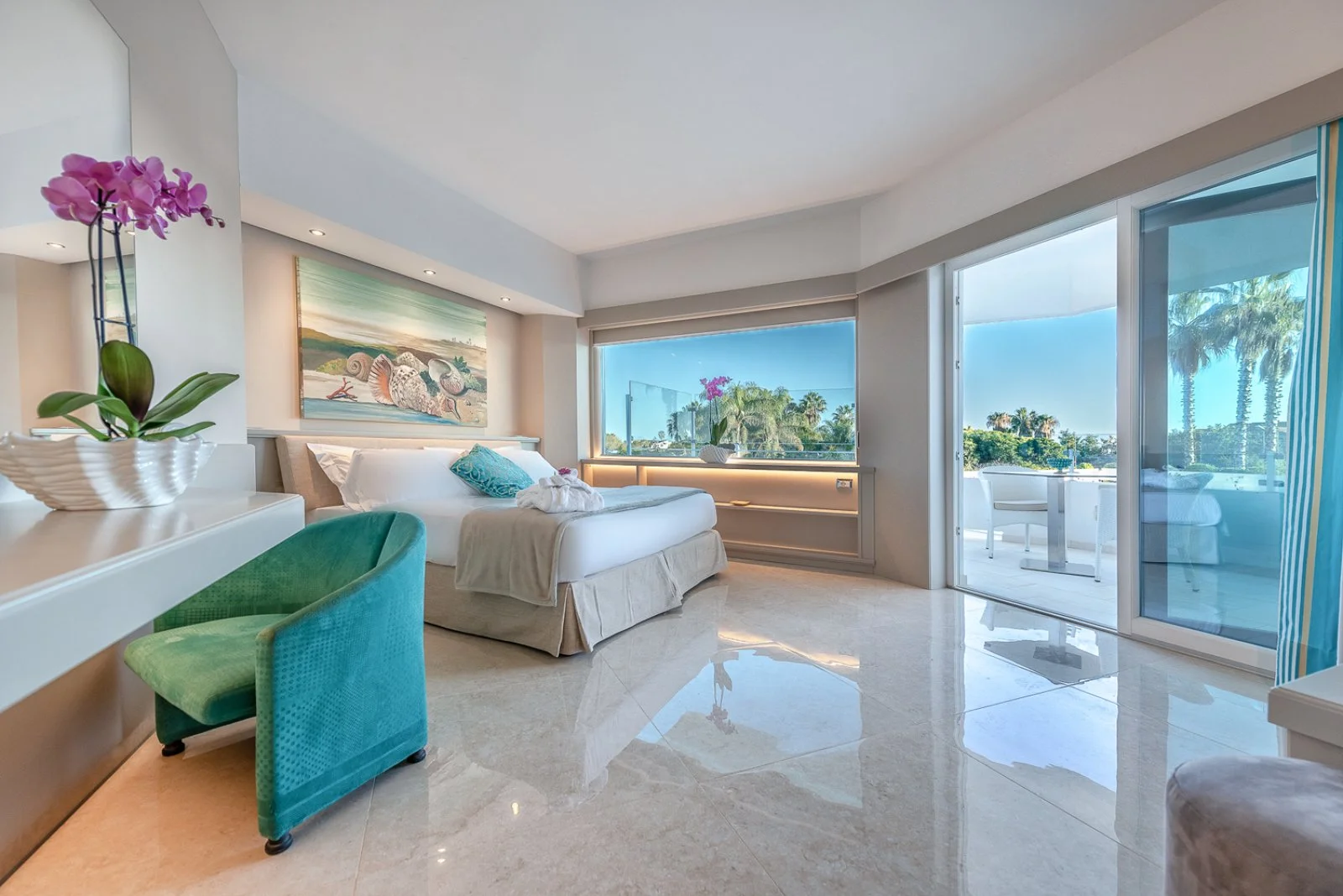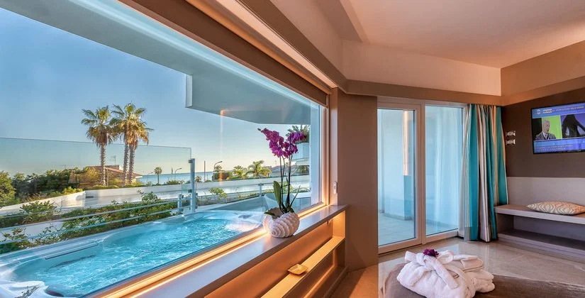 50, arredate in stile moderno e fresco, dispongono di TV, telefono, cassetta di sicurezza, minibar, terrazzino attrezzato. Si dividono in camere deluxe, deluxe vista mare laterale e deluxe vista mare parziale con terrazza e vasca idromassaggio; Suite palace, con vista mare e vasca idromassaggio.