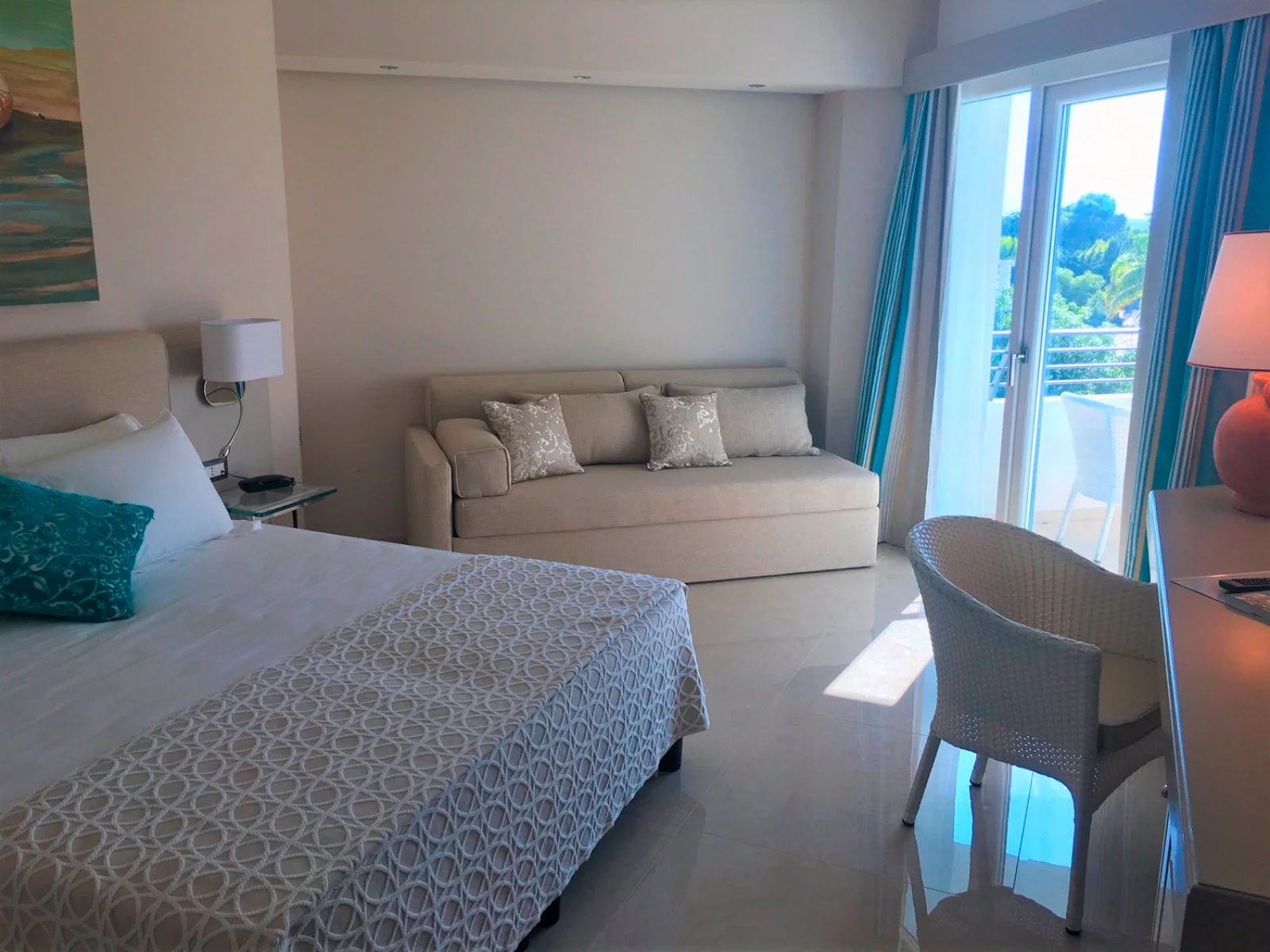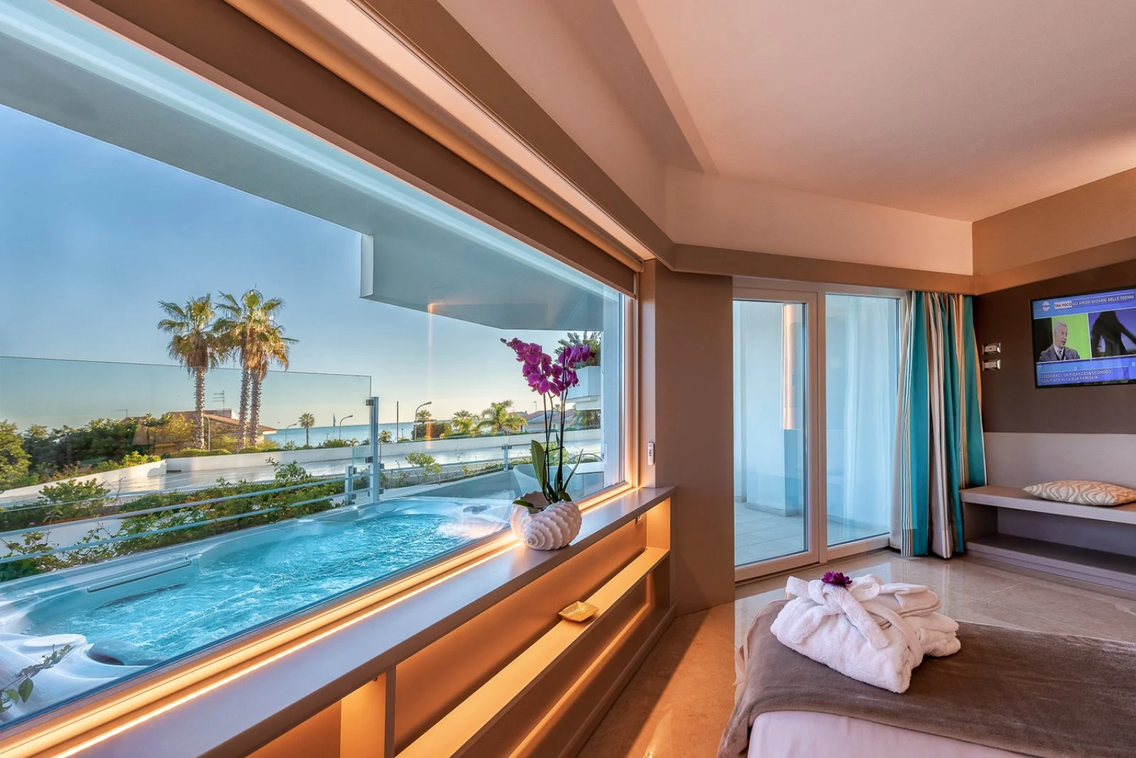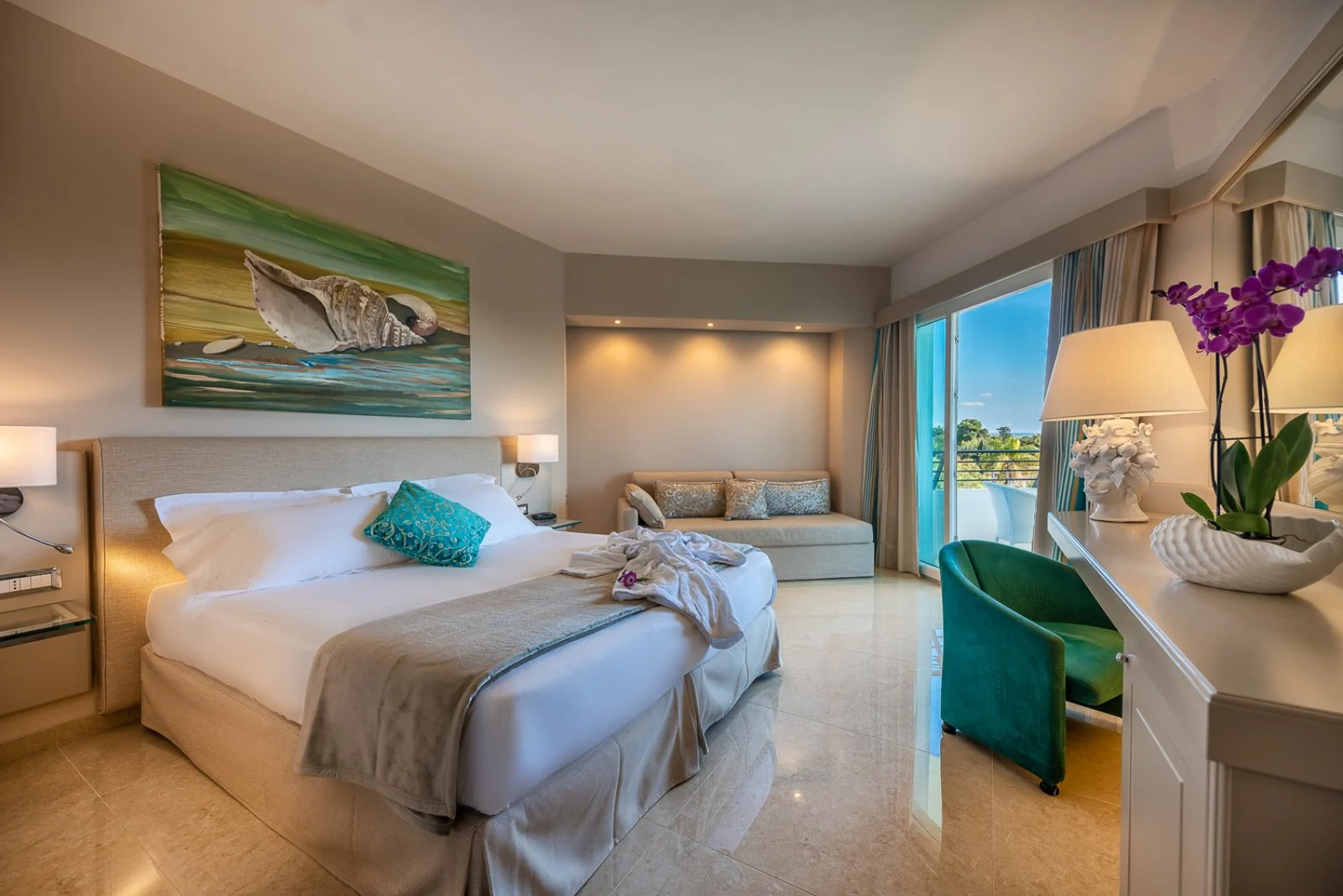 50, arredate in stile moderno e fresco, dispongono di TV, telefono, cassetta di sicurezza, minibar, terrazzino attrezzato. Si dividono in camere deluxe, deluxe vista mare laterale e deluxe vista mare parziale con terrazza e vasca idromassaggio; Suite palace, con vista mare e vasca idromassaggio.