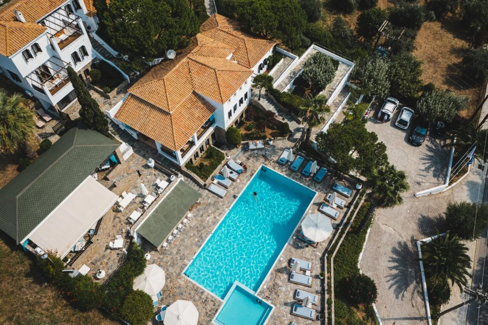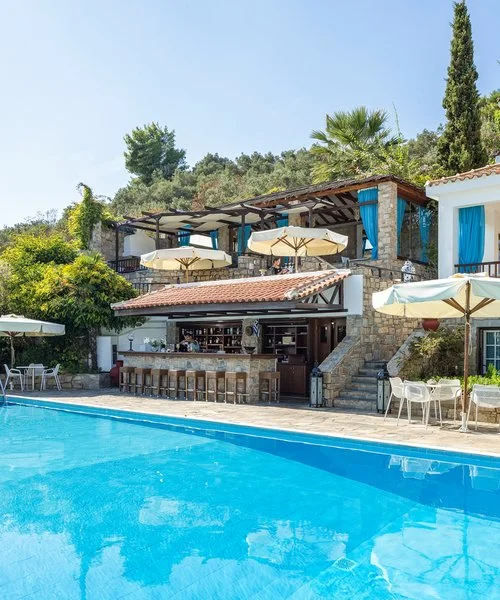 Aegean Suites è un raccolto boutique hotel, just adults, costruito a terrazze su di una piccola collina, situato in posizione panoramica sul mare e immerso tra gli ulivi. Dista circa 1 km dalla bella cittadina di Skiathos, raggiungibile anche a piedi, mentre il porto e l'aeroporto si trovano a circa 4 km. La spiaggia di sabbia di Megali Ammos, attrezzata con ombrelloni e lettini a pagamento, è ubicata oltre la strada litoranea ad appena 200 m. Dispone di una graziosa piscina panoramica con lettini, ombrelloni; teli mare disponibili gratuitamente solo per la piscina.