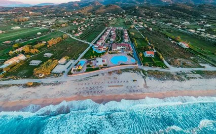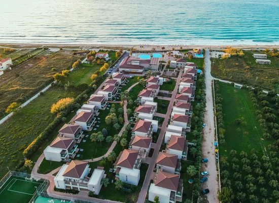 Sorge sulla costa settentrionale dell’isola, a circa 42 km dall’aeroporto e da Corfù città. Il villaggio di Acharavi dista circa 2 km. Affacciato direttamente sulla lunga spiaggia di sabbia e ciottoli che consente piacevoli passeggiate, è costituito da un corpo centrale dove si trovano alcuni dei servizi comuni e 12 edifici a due piani. Le piscine sono 2, di cui una per bambini, oltre a una piscina con scivoli, a pagamento. Uso di lettini, ombrelloni e teli mare gratuito solo in piscina.