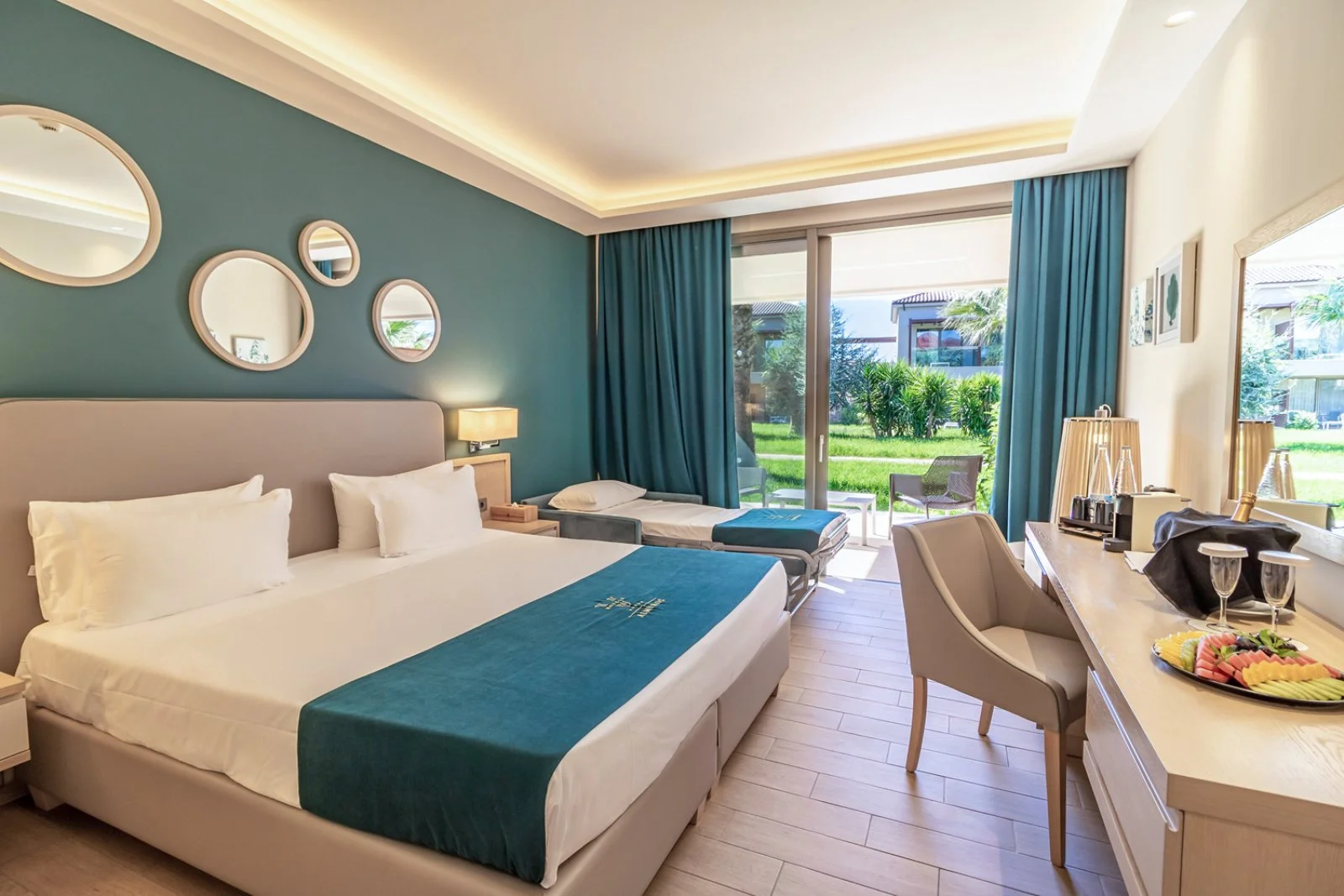 180, con arredi moderni e funzionali dai tenui colori pastello, sono ubicate negli edifici a 2 piani dislocati nei curati giardini. Le deluxe e le più spaziose junior suite sono dotate dei maggiori comfort, quali accappatoio e ciabattine, asciugacapelli, aria condizionata con controllo individuale, TV satellitare, telefono, connessione Wi-Fi, minifrigo (consumazioni minibar a pagamento), asse e ferro da stiro, cassetta di sicurezza, set per tè e caffè, macchina per il caffè espresso (rifornimento capsule a pagamento), balcone o terrazza.