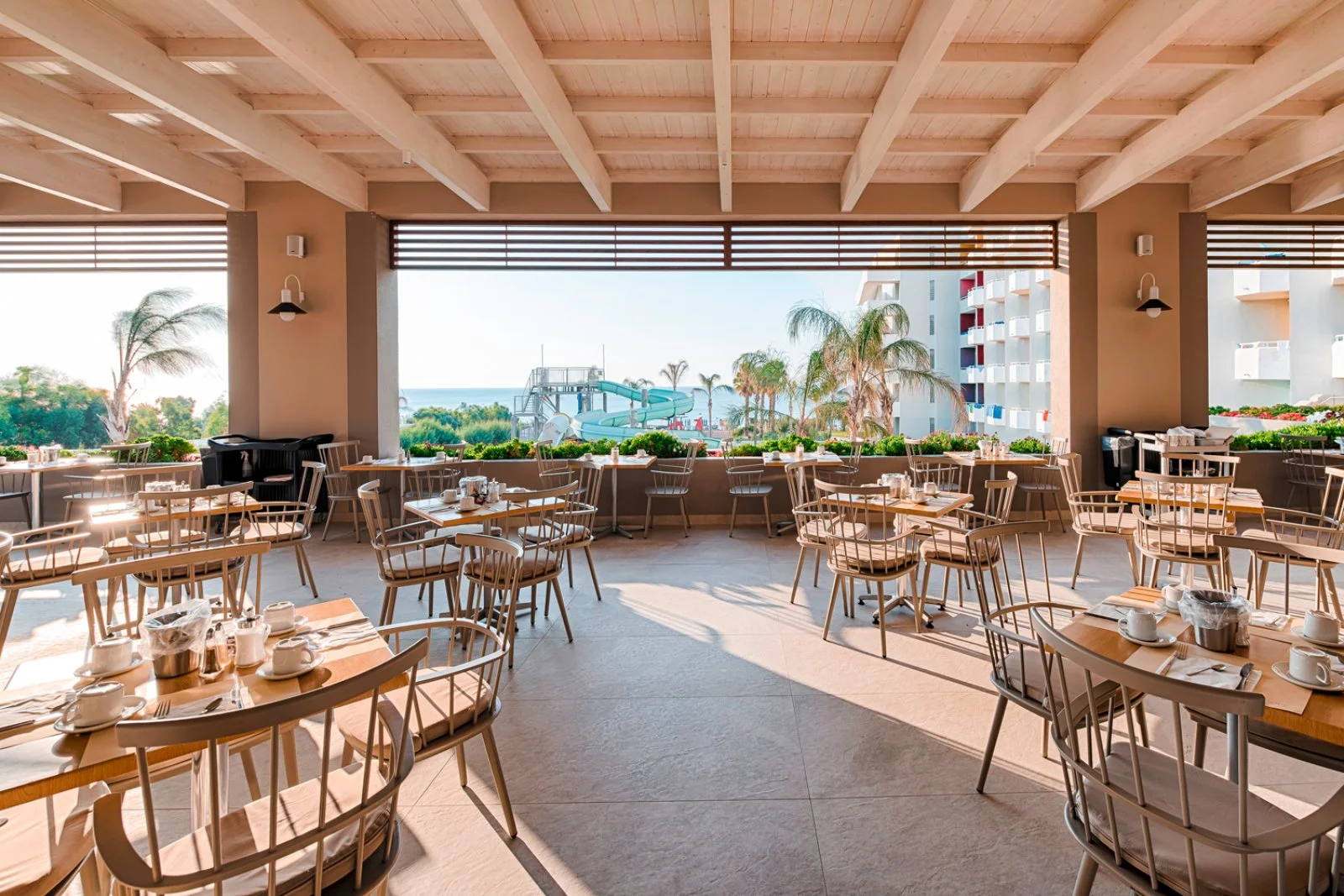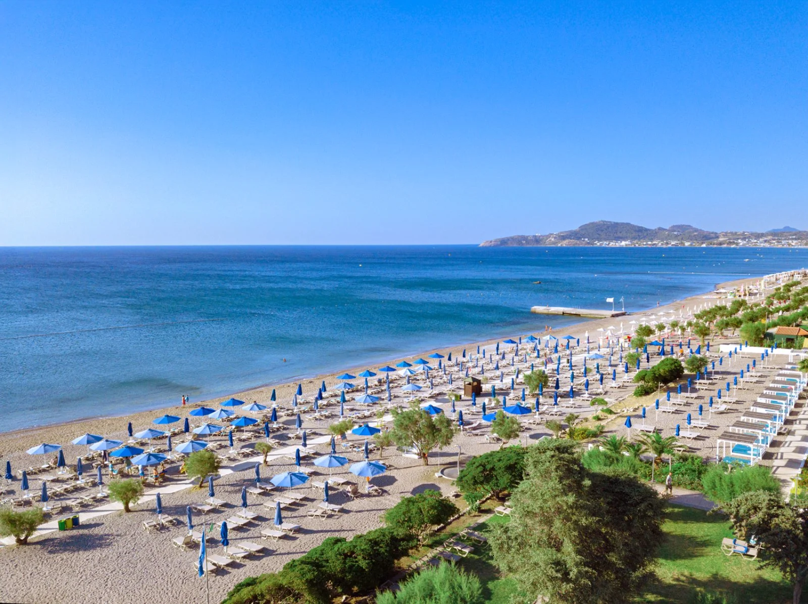Si estende fronte mare, direttamente sulla profonda spiaggia di sabbia e piccoli ciottoli, rinomata per la sua bellezza. Dispone di 3 piscine esterne di cui la principale proprio a bordo spiaggia e una per bambini con area separata per infant, oltre a scivoli d’acqua per adulti e bambini. Uso gratuito di lettini, ombrelloni e teli mare sia in piscina che in spiaggia (fino a esaurimento).