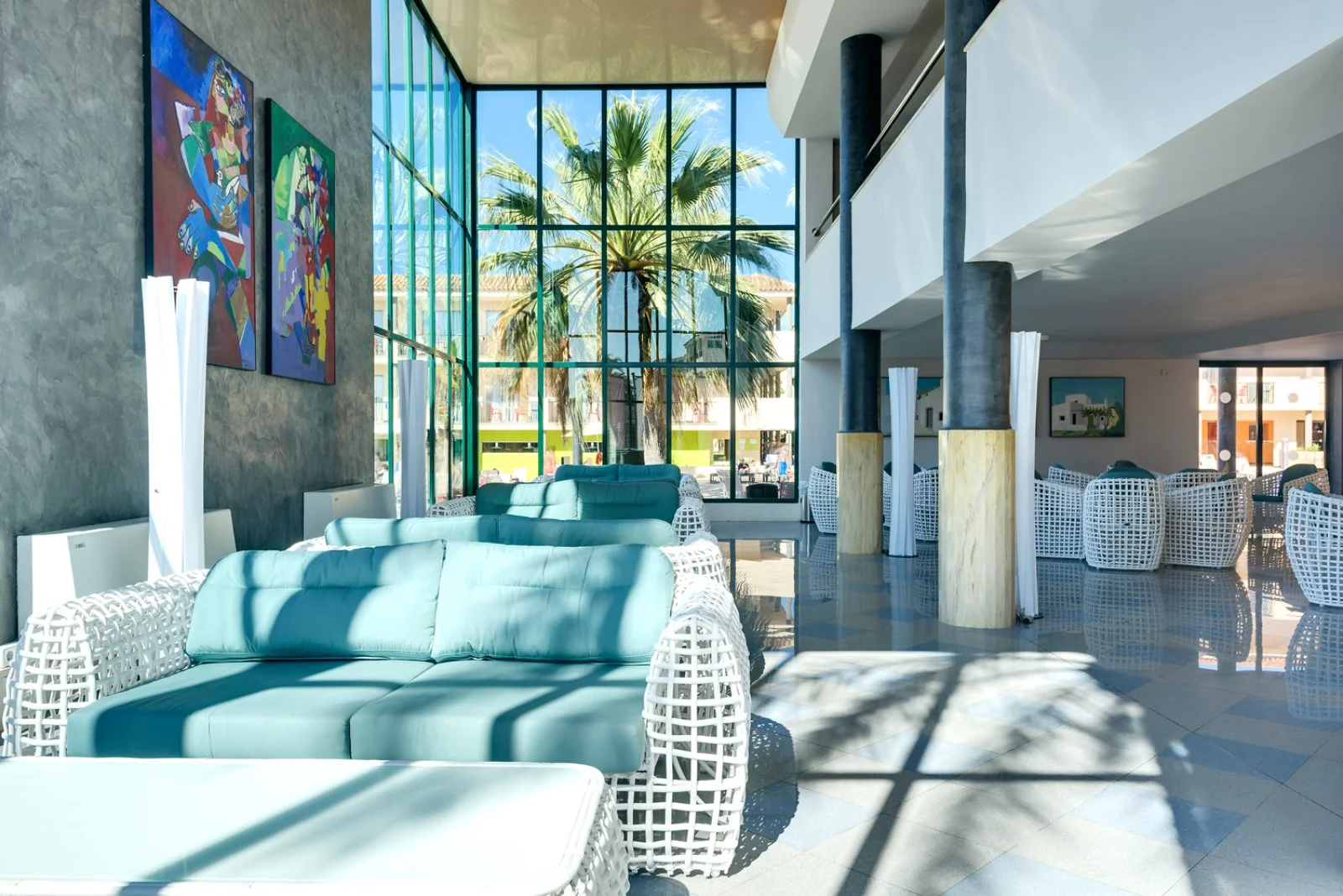 Dista 18 km dall'aeroporto, 20 km da Ibiza città e dal suo centro storico "Dalt Villa" e soli 7 km da San Antonio il cui centro cittadino è in gran parte area pedonale, animato di bar, ristoranti e negozi di ogni tipo. Il resort, in stile moderno e funzionale con ampie vetrate, si compone di un edificio principale con parte dei servizi comuni e di un gruppo di edifici che si sviluppano attorno alle piscine e ai giardini.
