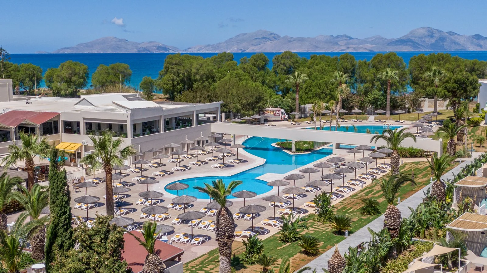 La bella e lunga spiaggia sabbiosa di Marmari su cui si affaccia è raggiungibile attraversando la strada litoranea. Dispone di 4 piscine esterne, di cui due con area separata per bambini e una splash dedicata solo a loro con divertenti scivoli, oltre alle piscine ad uso esclusivo di alcune camere. Uso di ombrelloni, lettini e teli mare gratuito sia in piscina sia in spiaggia.
