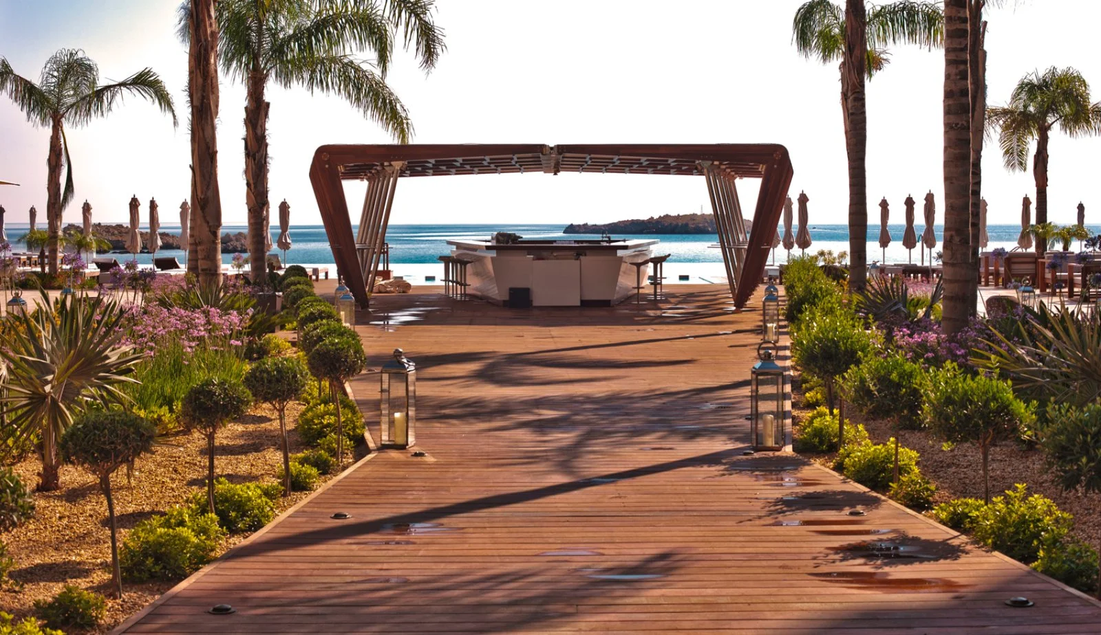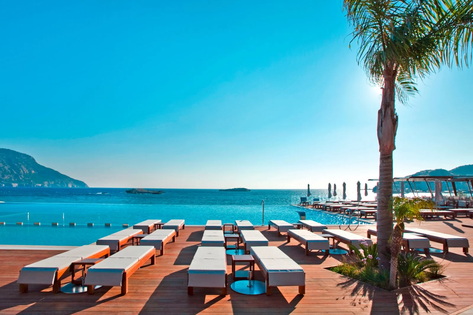 Il corpo centrale si affaccia direttamente sulla lunga spiaggia di sabbia e ciottoli da cui l’edificio annesso dista circa 100 m. Dispone di una scenografica piscina infinity di 700 m2 proprio a ridosso della spiaggia con area riservata ai bambini. Uso gratuito di lettini, ombrelloni e teli mare sia presso la piscina che in spiaggia.