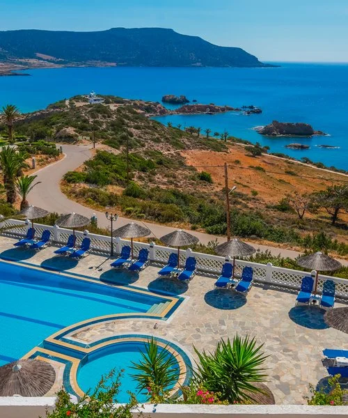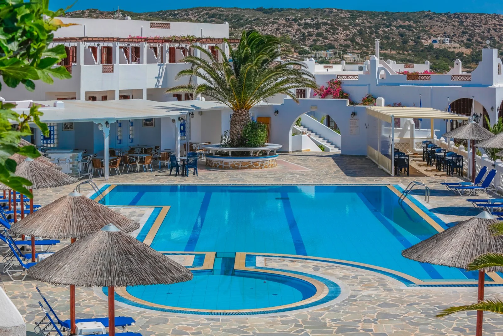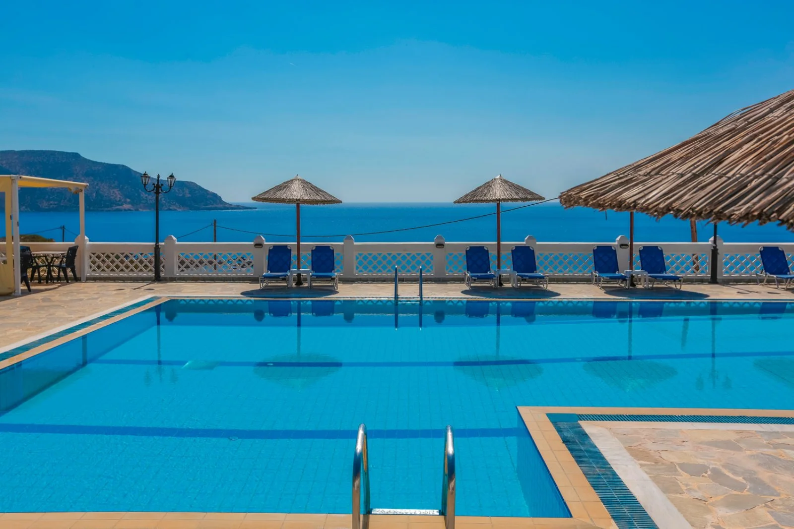 In suggestiva posizione panoramica, a breve distanza dalla baia di Amoopi e dai suoi tipici ristoranti, bar e taverne, a circa 7 km da Pigadia e 8 km dall’aeroporto. Fermata bus di linea di fronte all’hotel. Si compone di un edificio a due piani, dalla gradevole architettura locale rivisitata in chiave moderna.