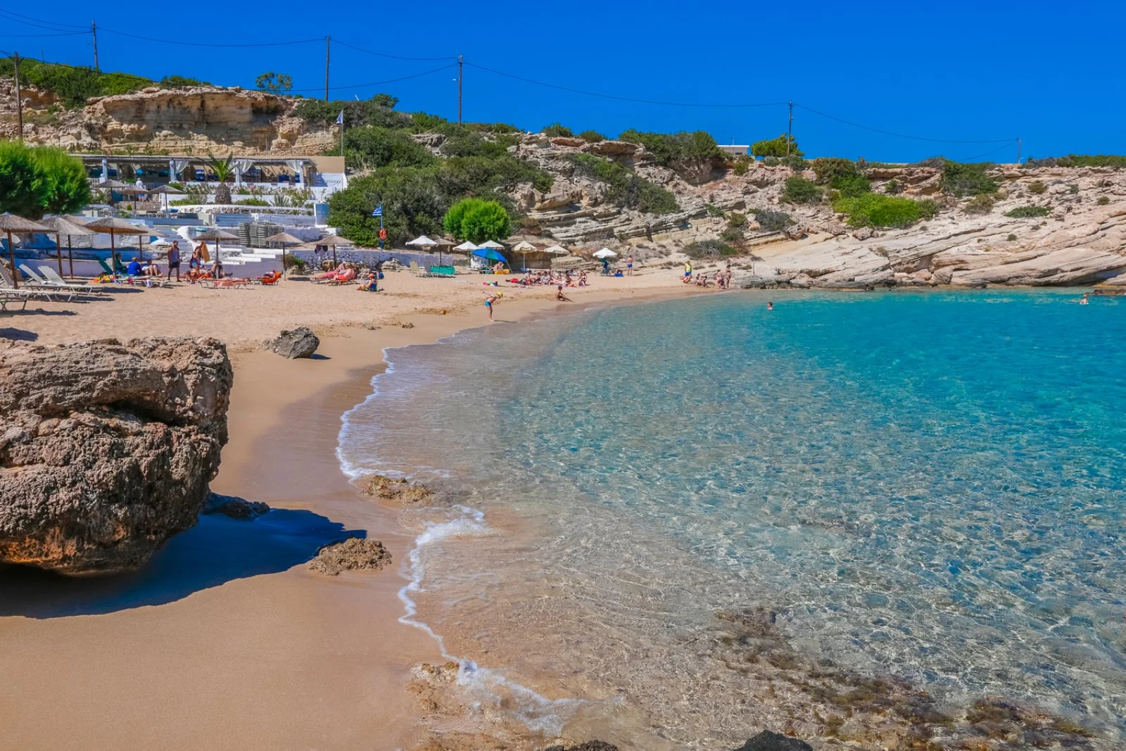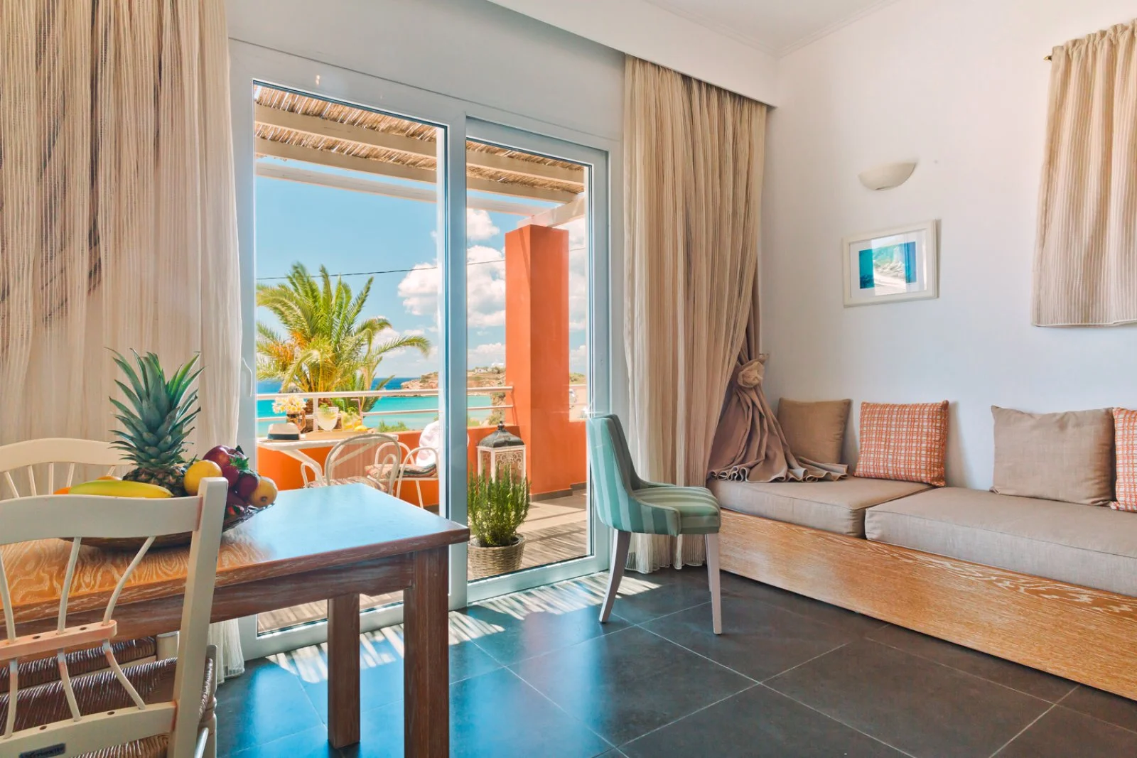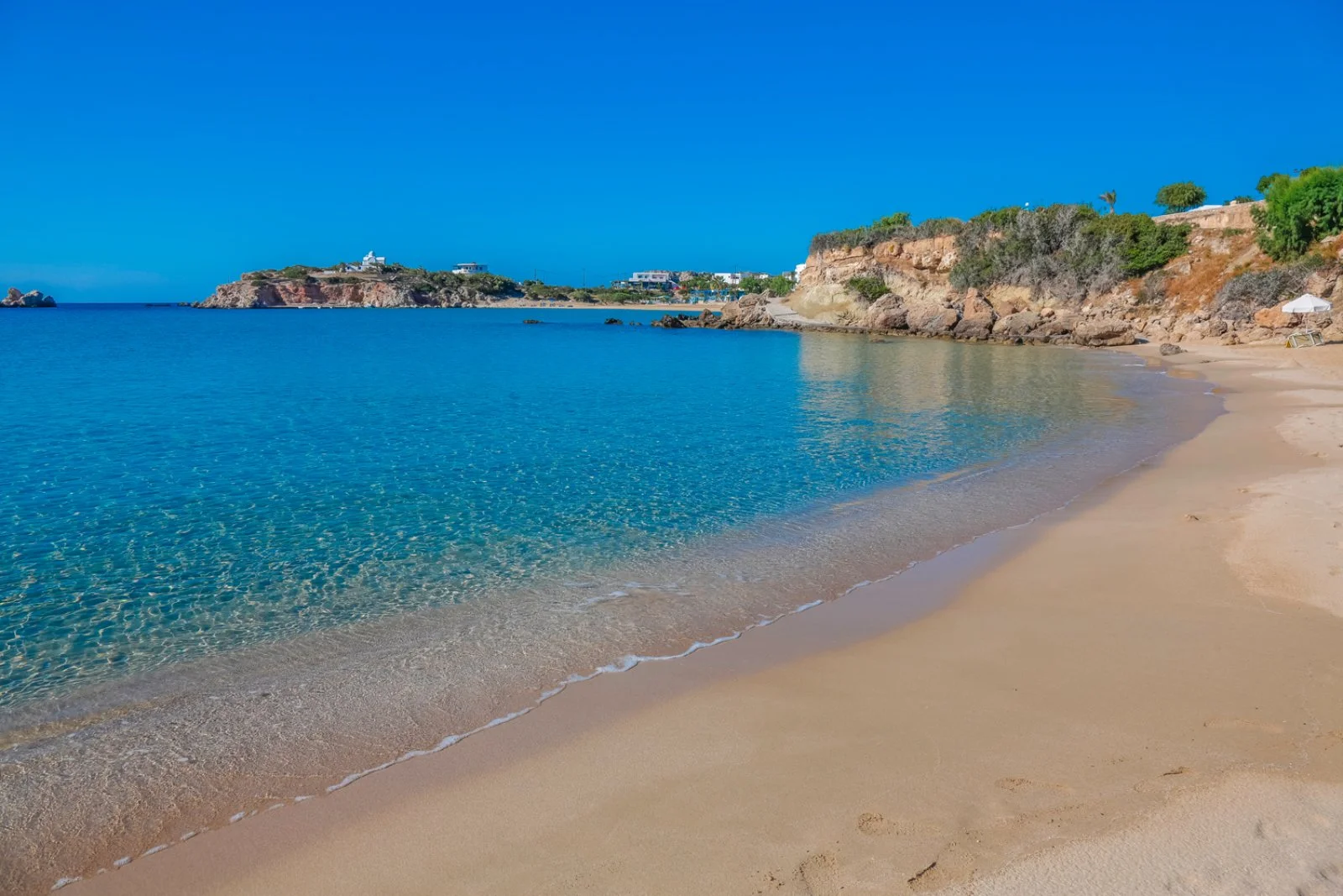 La bellissima spiaggia sabbiosa di Mikri Amoopi, dalle acque cristalline e protetta dai venti, dista circa 10 m. A disposizione degli ospiti una deliziosa piscina a sfioro, situata a circa 150 m presso l’Amoopi Nymfes Royal appartenente alla stessa proprietà, che vanta una magnifica vista panoramica sulla baia. Uso di ombrelloni e lettini gratuito solo in piscina, teli mare disponibili su richiesta.