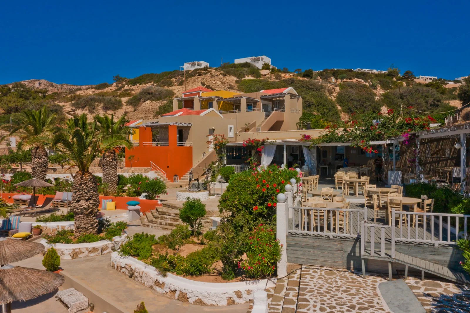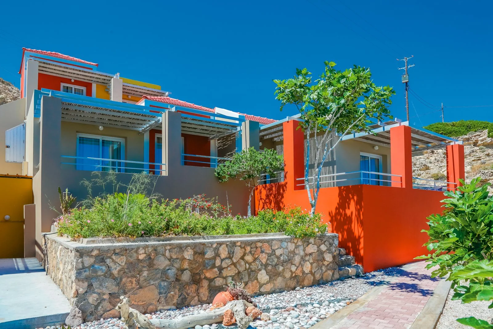 Ad Amoopi, a circa 5 km da Pigadia e 10 km dall’aeroporto. Fermata bus di linea a circa 120 m. Unica costruzione a un piano su livelli diversi dai caldi colori pastello praticamente in riva al mare.