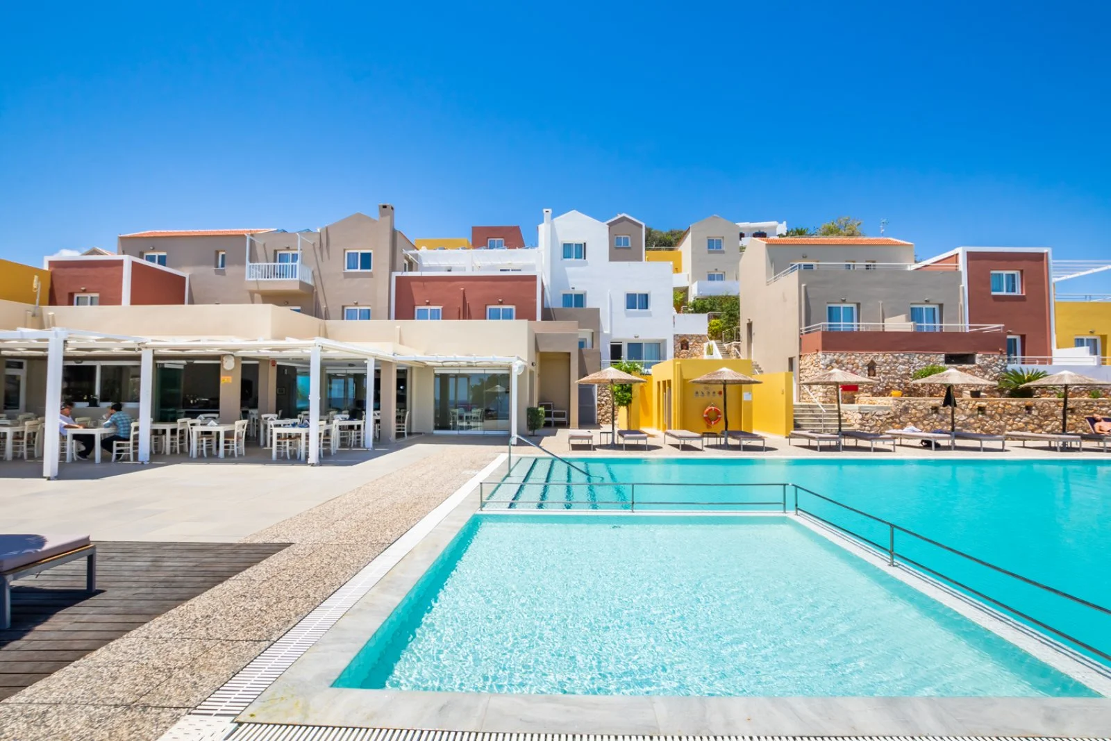 Ristorante con servizio a buffet per la prima colazione continentale e servizio al tavolo con menù fisso di 3 portate (antipasto o insalata, piatto principale, dolce o frutta) da scegliere tra più proposte per ogni portata, per il pranzo o la cena: la cucina dell’hotel è sempre molto apprezzata, assaggerete piatti preparati con materie prime di qualità combinando innovazione e tradizione. Inoltre, per chi prenota la mezza pensione, ogni sera a cena sono presenti sul menù specialità tipiche karpathiane o greche per approfondire la conoscenza dell’isola anche dal punto di vista gastronomico. A pagamento: lobby bar, bar a bordo piscina.