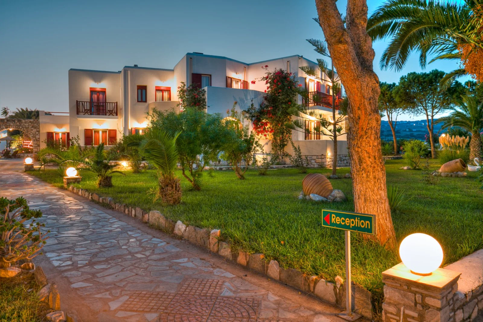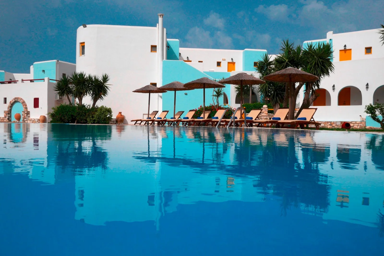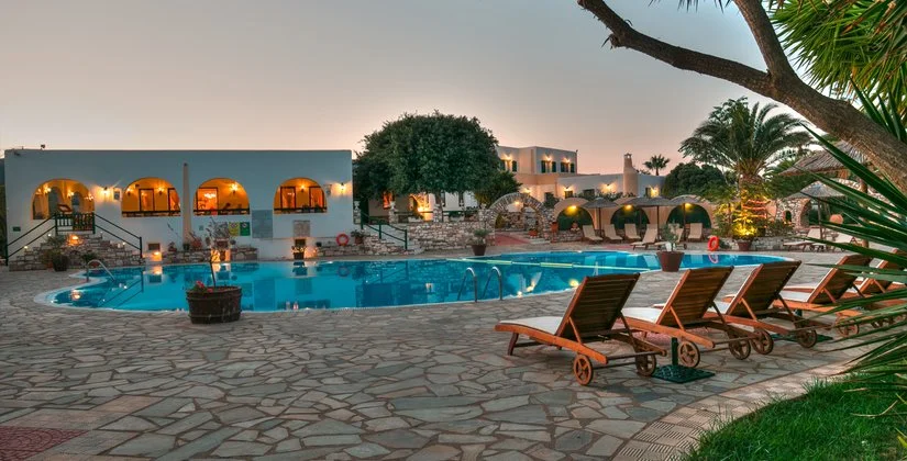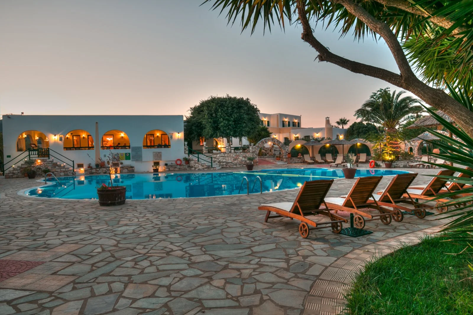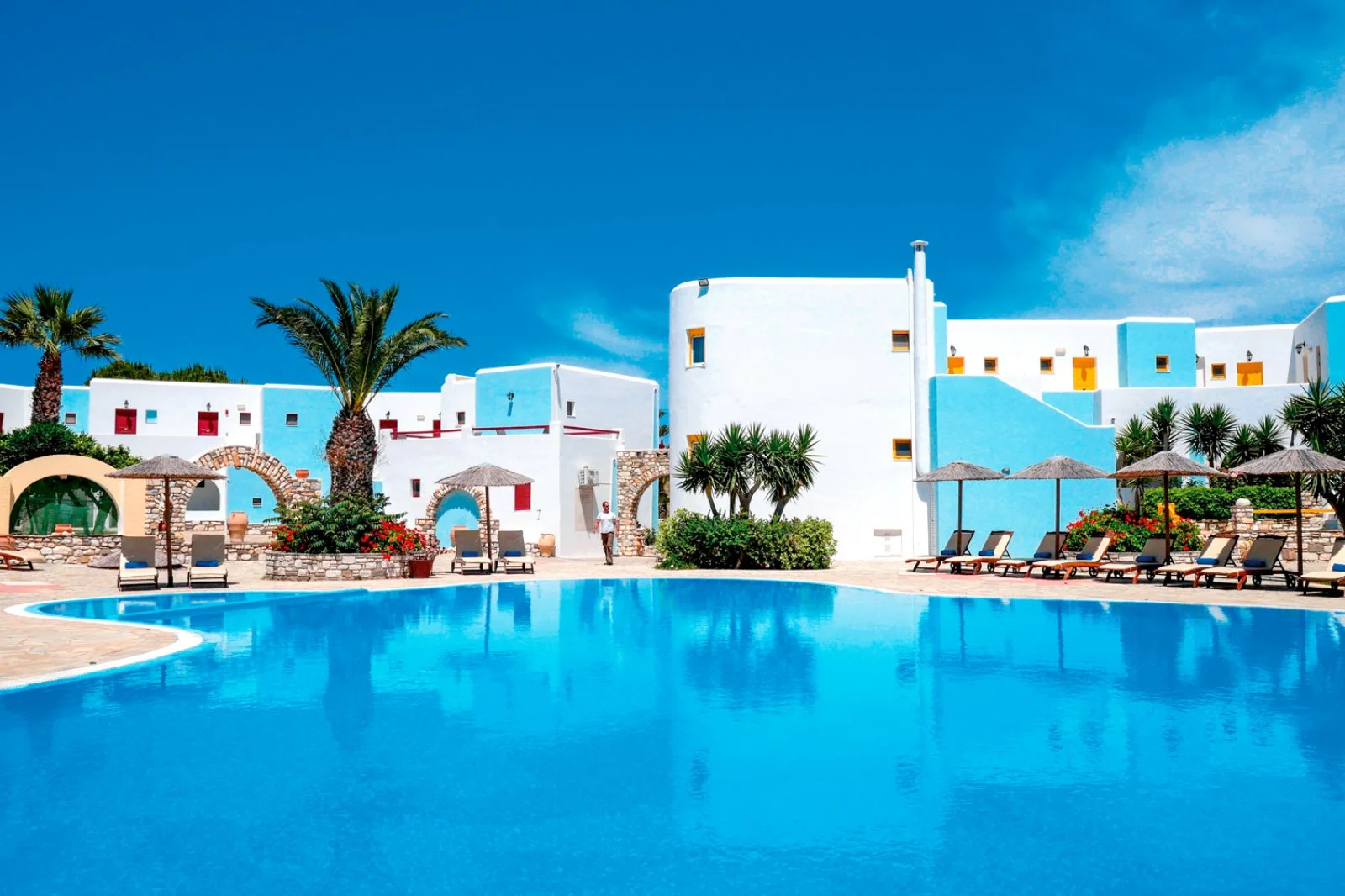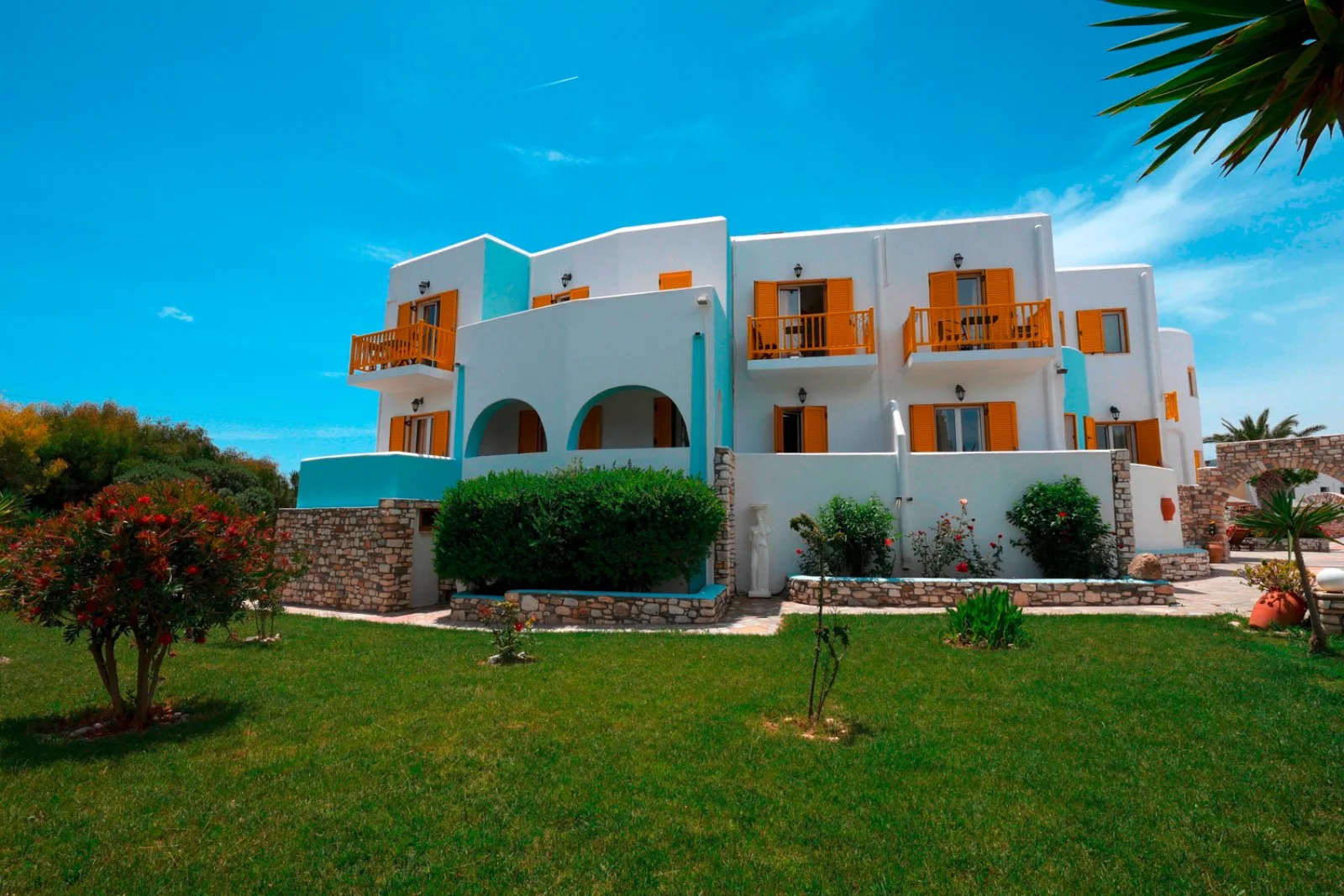 Con una passeggiata di poco più di 1 km si raggiunge la spiaggia di sabbia e ciottoli di Glyfades (non attrezzata), mentre poco più distante è possibile trascorrere giornate di sole e mare in alcune delle più note spiagge dell’isola come Logaras e Chryssi Akti. Dispone di 2 piscine di cui una per bambini. Uso gratuito di lettini e ombrelloni solo in piscina, teli mare disponibili su cauzione.