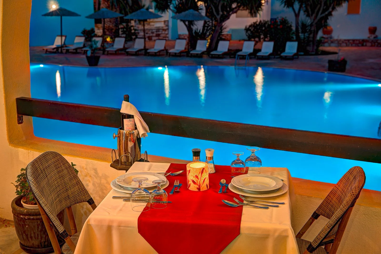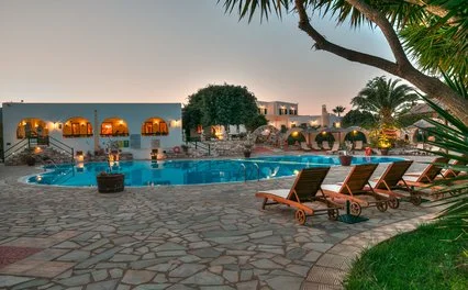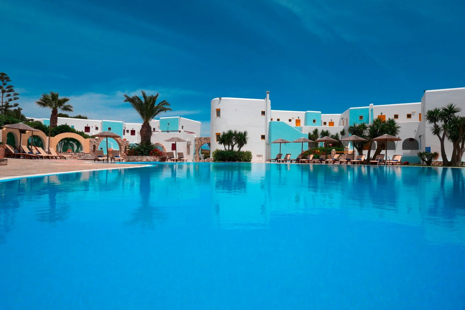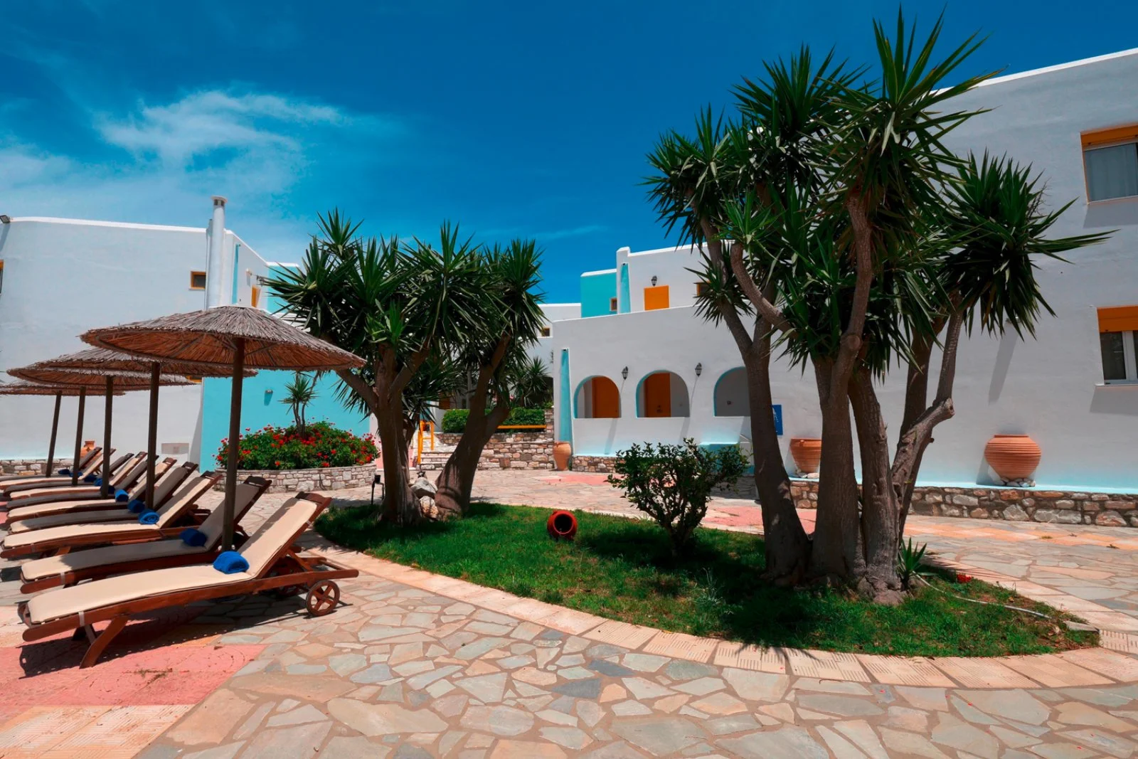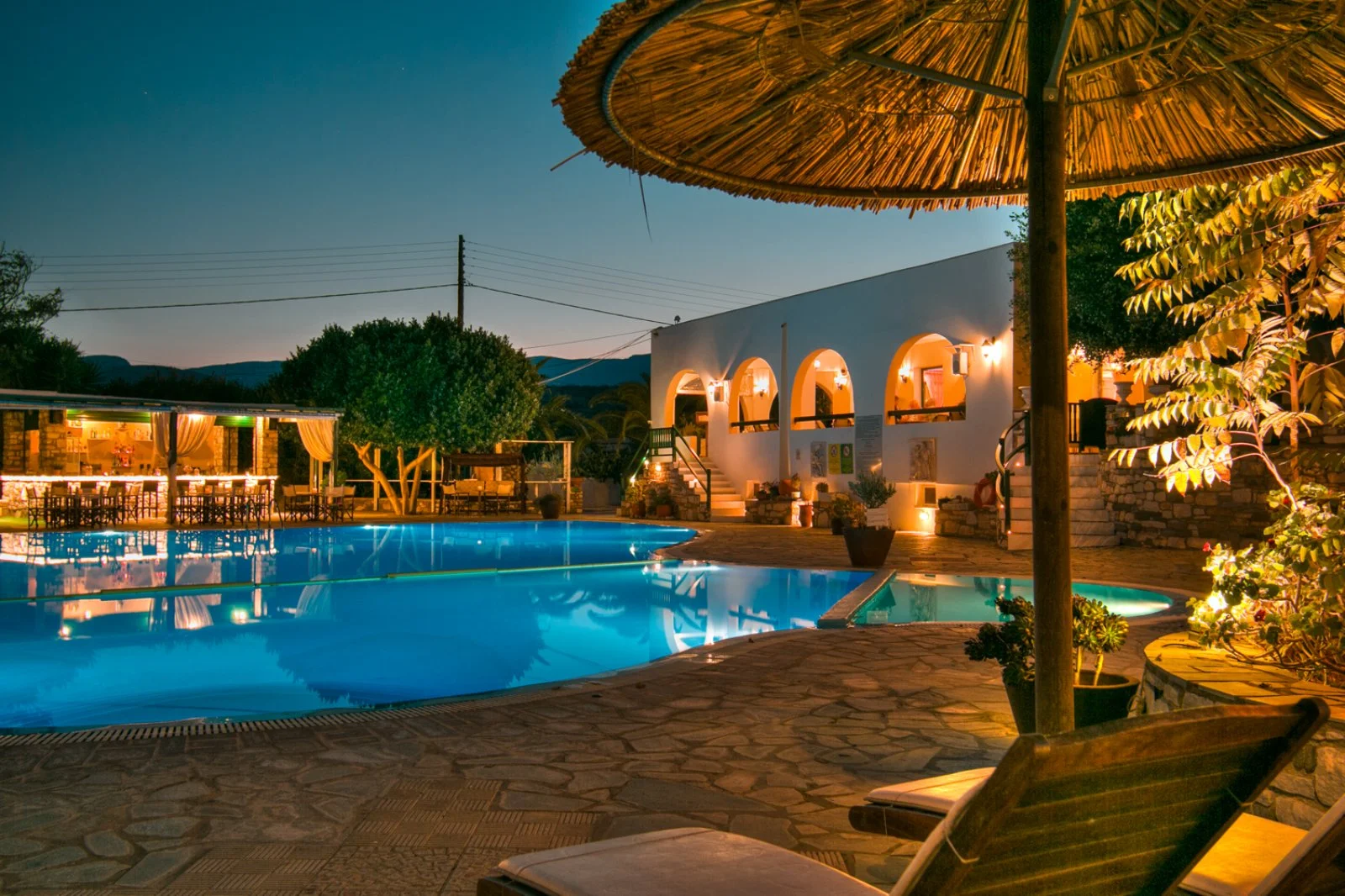 Con una passeggiata di poco più di 1 km si raggiunge la spiaggia di sabbia e ciottoli di Glyfades (non attrezzata), mentre poco più distante è possibile trascorrere giornate di sole e mare in alcune delle più note spiagge dell’isola come Logaras e Chryssi Akti. Dispone di 2 piscine di cui una per bambini. Uso gratuito di lettini e ombrelloni solo in piscina, teli mare disponibili su cauzione.