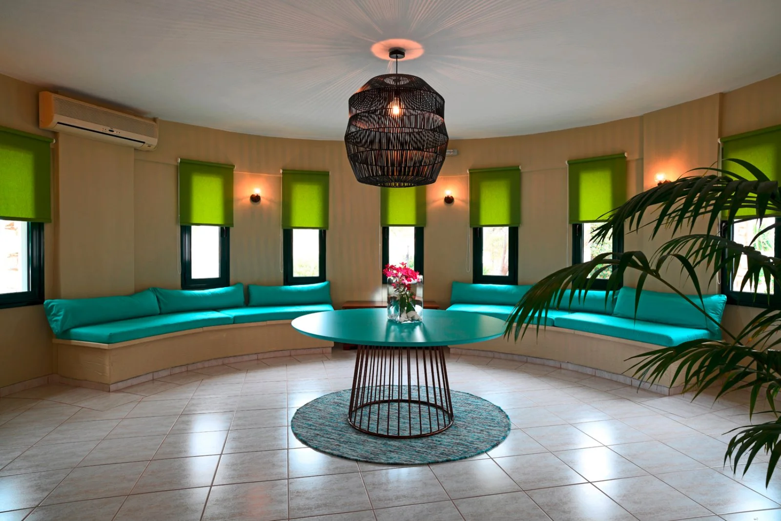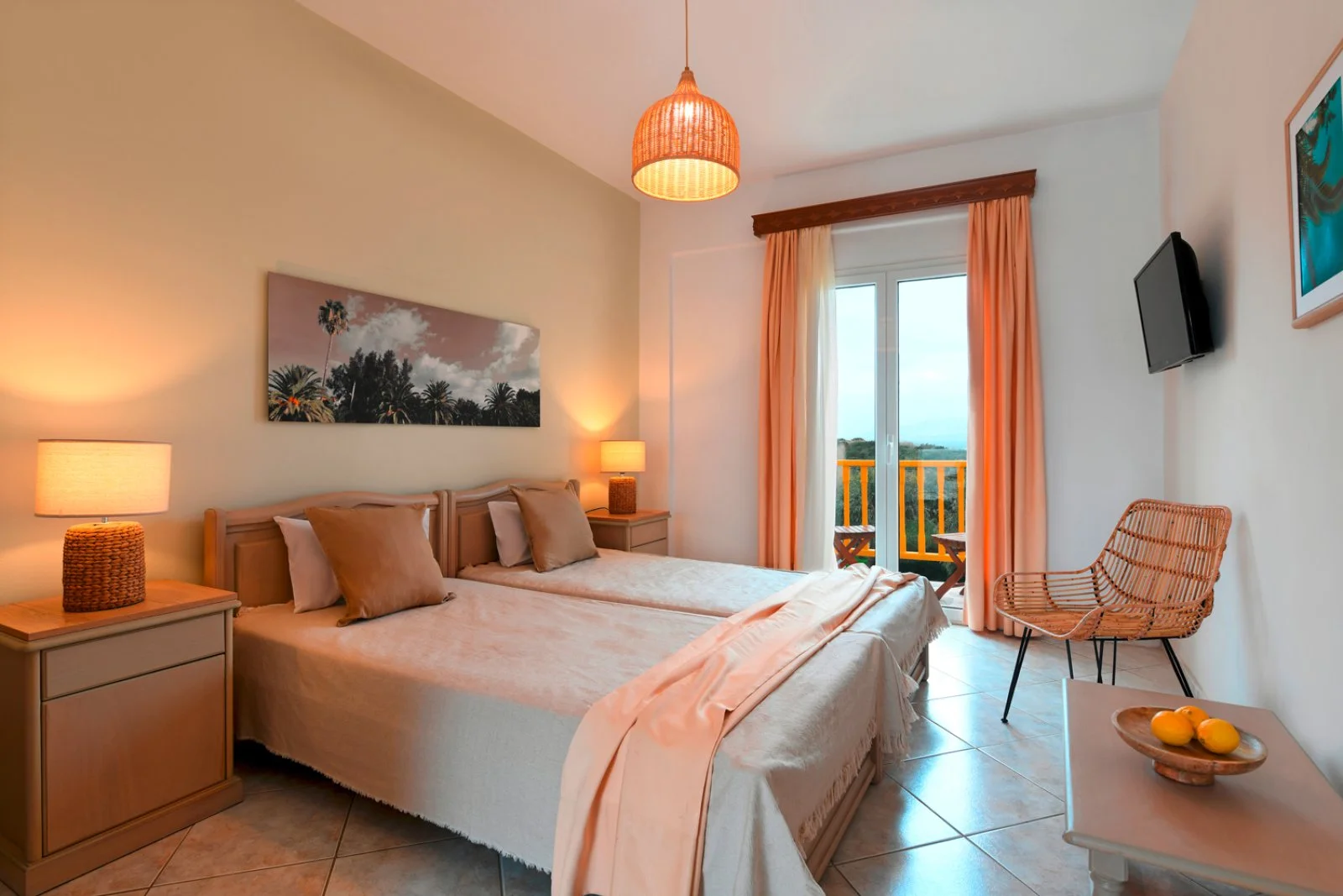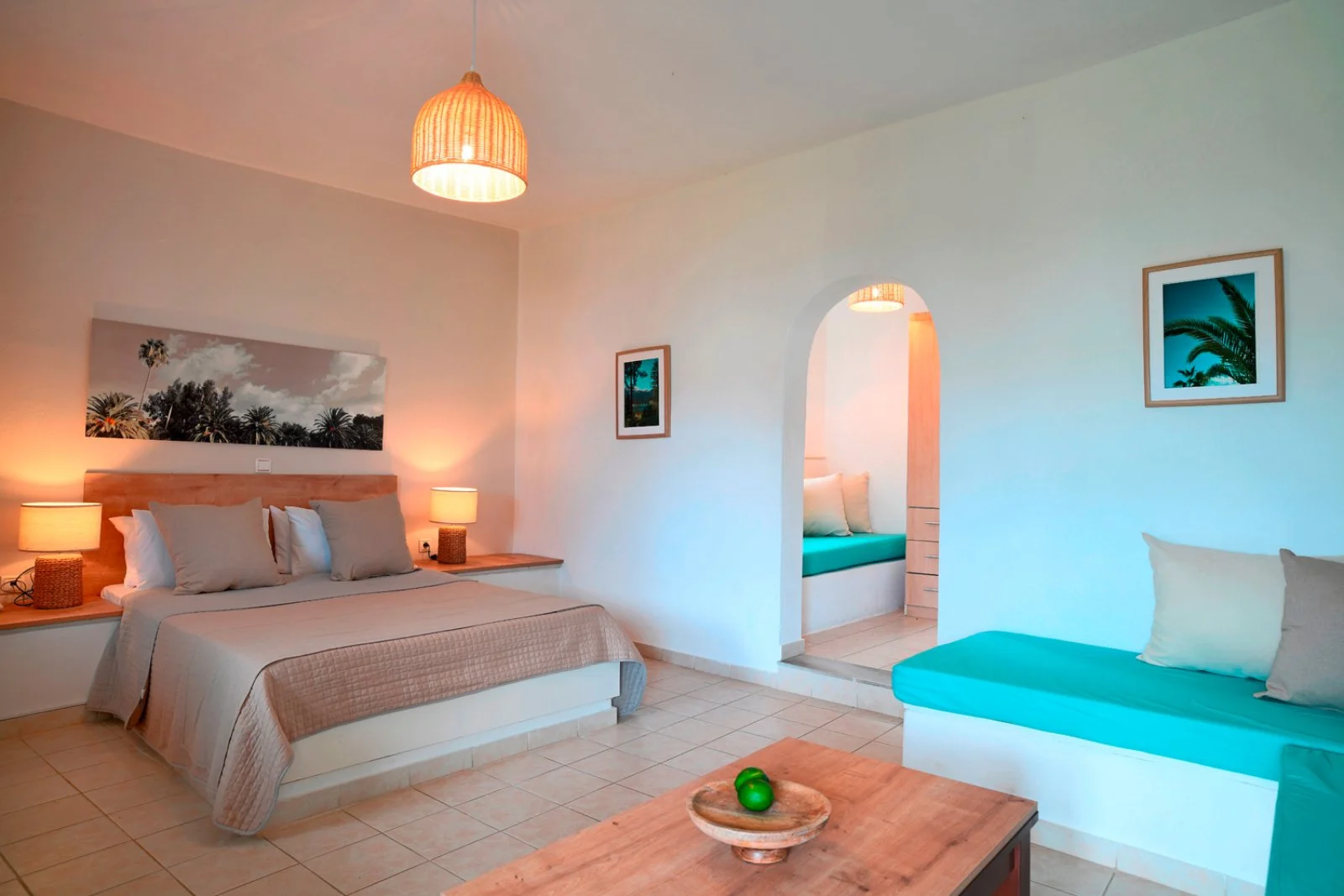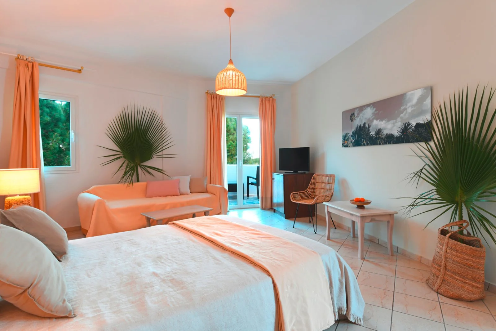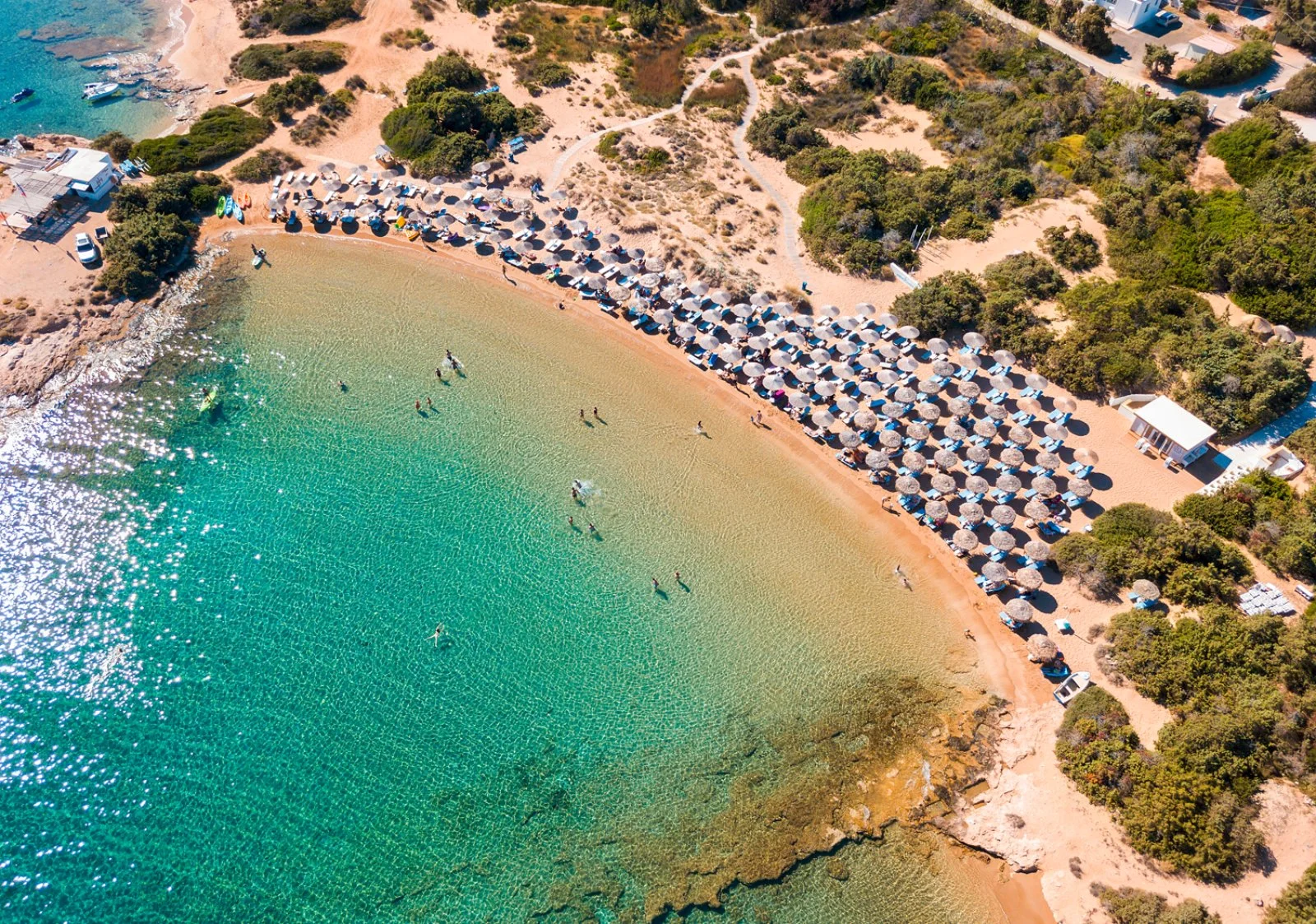 Con una passeggiata di poco più di 1 km si raggiunge la spiaggia di sabbia e ciottoli di Glyfades (non attrezzata), mentre poco più distante è possibile trascorrere giornate di sole e mare in alcune delle più note spiagge dell’isola come Logaras e Chryssi Akti. Dispone di 2 piscine di cui una per bambini. Uso gratuito di lettini e ombrelloni solo in piscina, teli mare disponibili su cauzione.