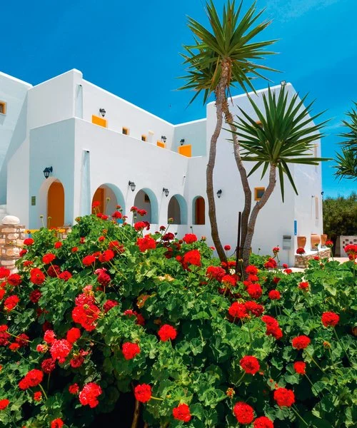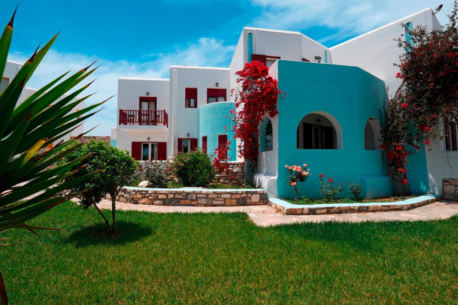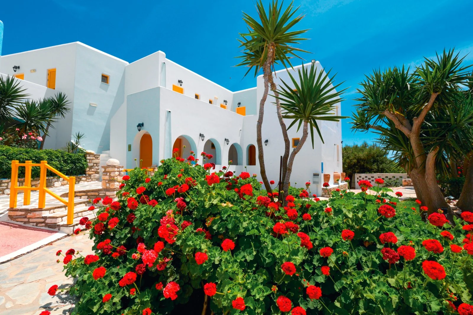 Situata nella tranquilla periferia di Naoussa, dista circa 6 km dal centro della città e dal suo porto, mentre il porto di Parikia si trova a circa 16 km. Fermata di bus di linea fronte hotel. Armoniosamente inserito in ampie zone verdi con maestosi ulivi, palme e pini marittimi, l’hotel si compone di vari edifici a due piani che circondano la piscina. L'architettura è quella tipica cicladica caratterizzata da muri bianchi e infissi colorati a contrasto.