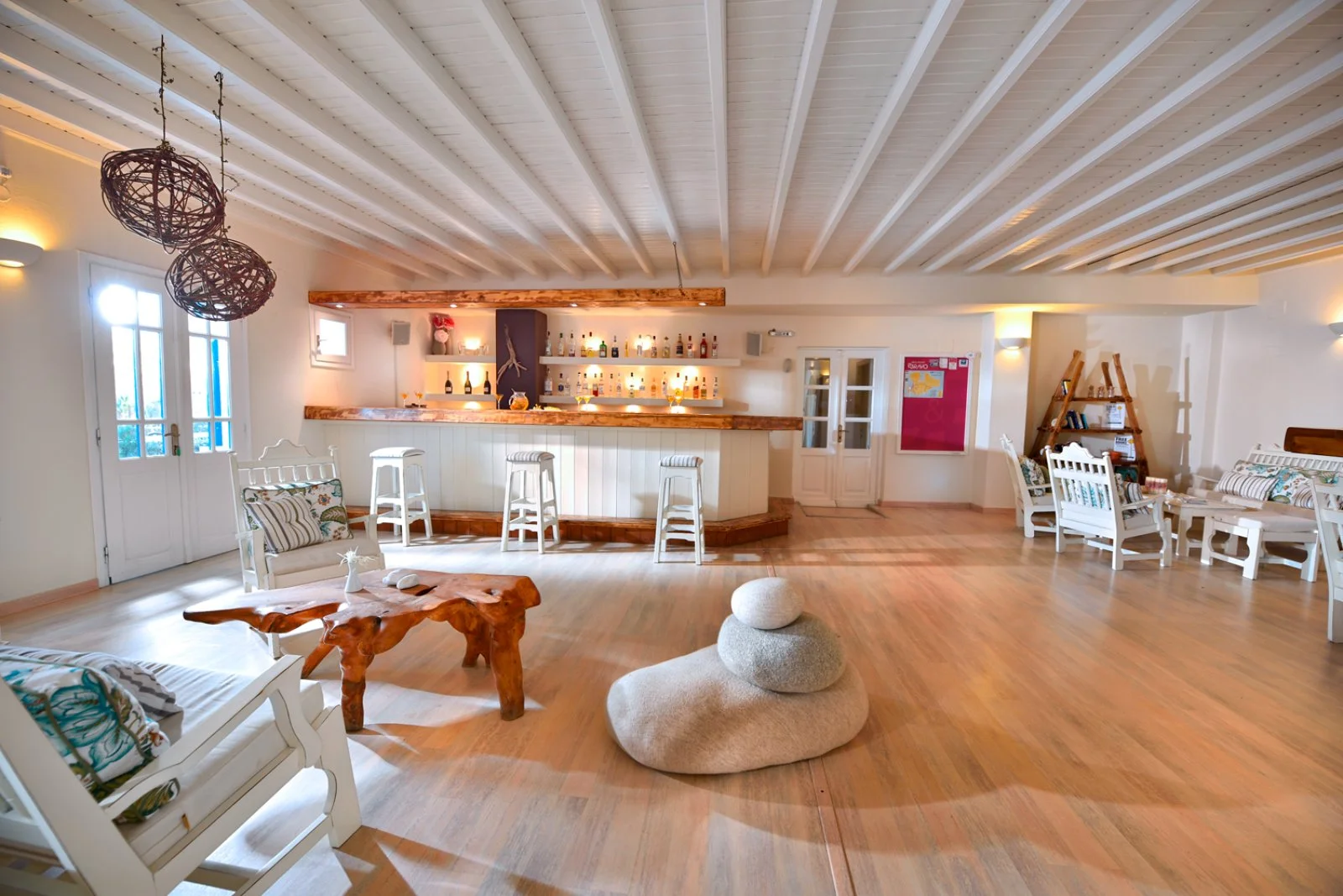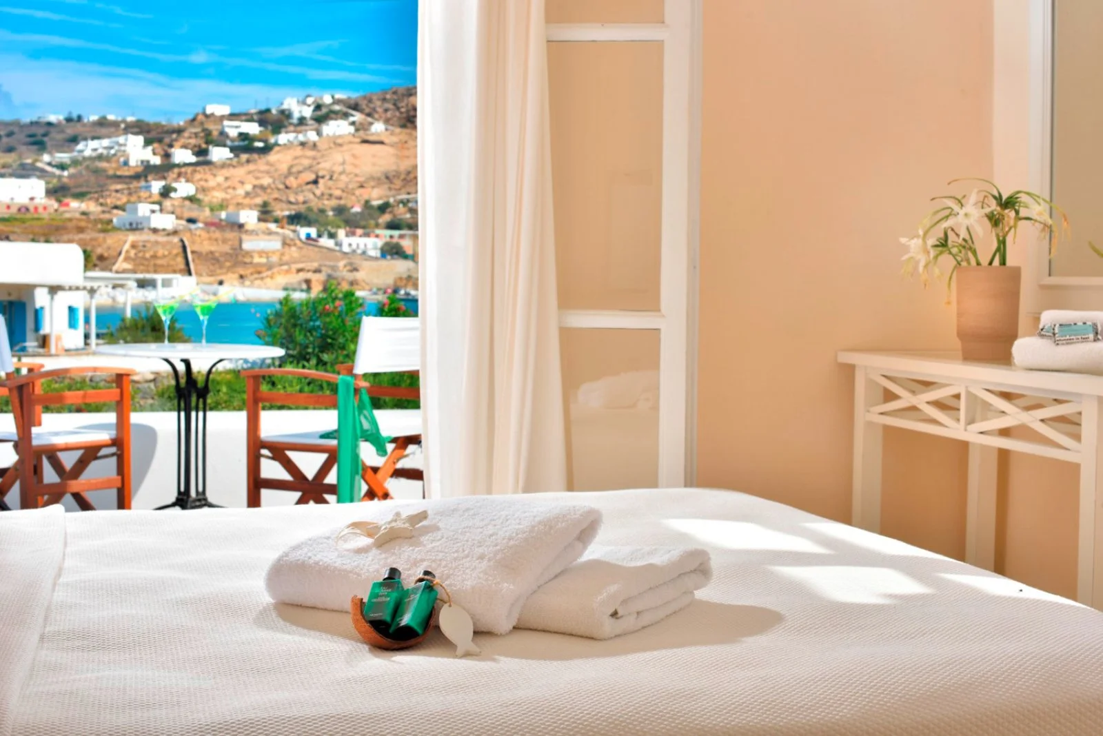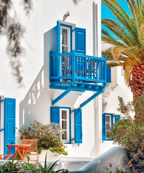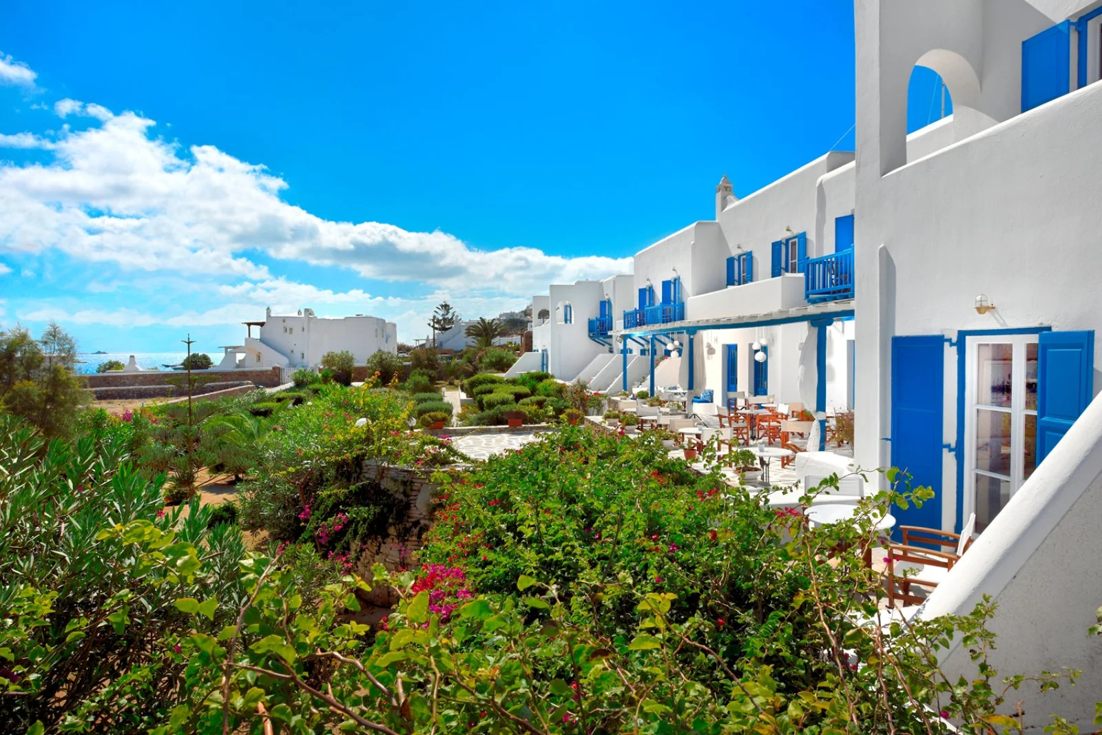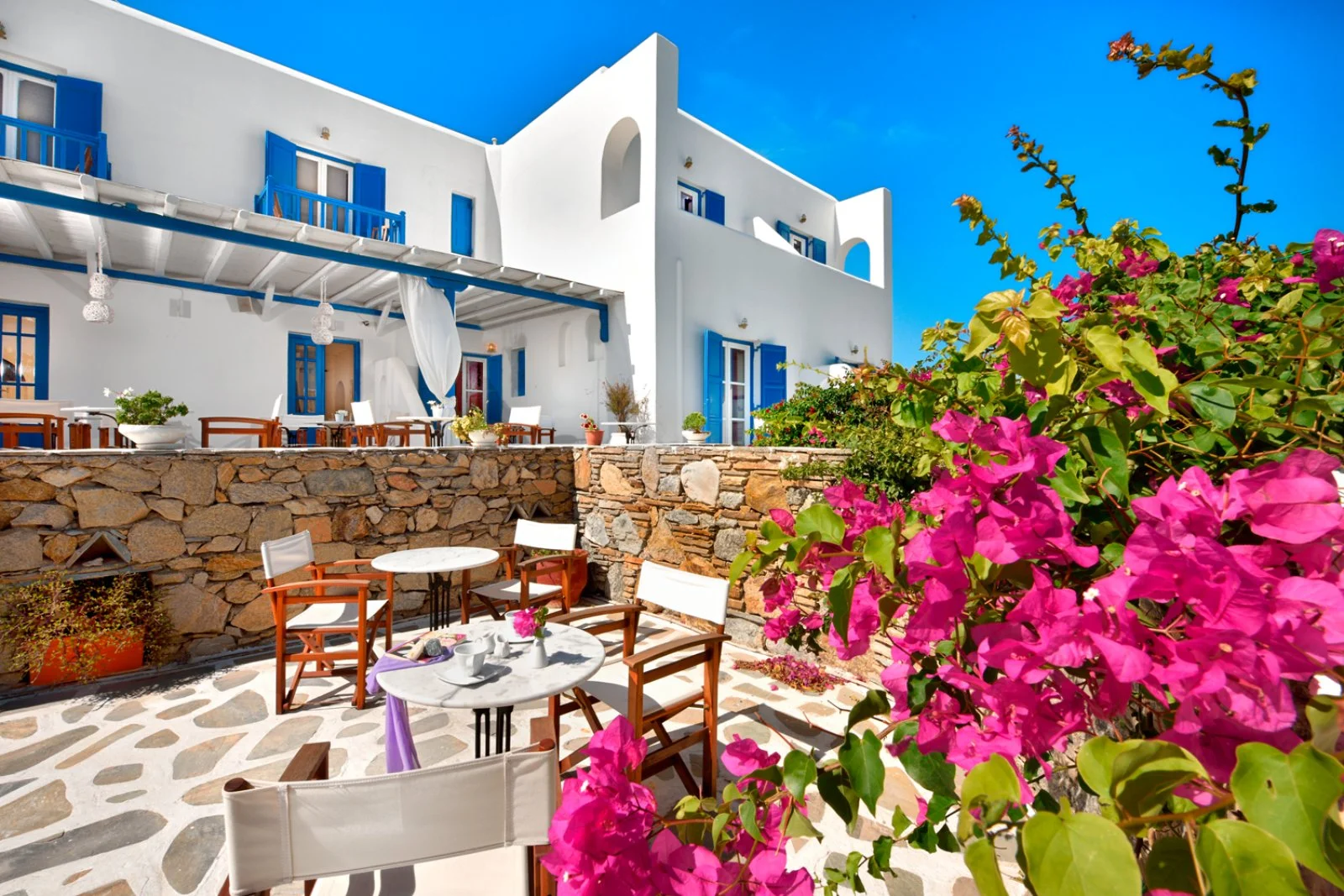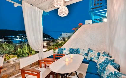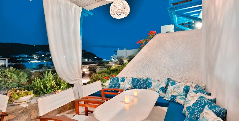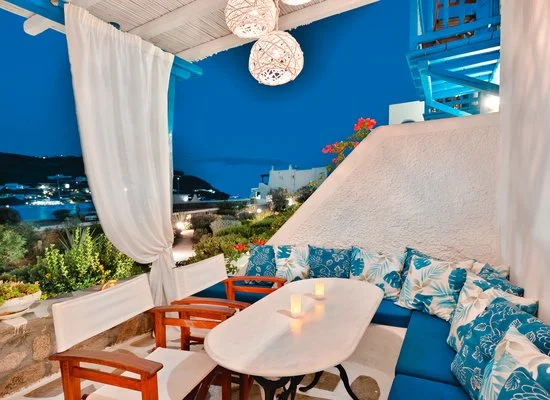 Nel centro di Ornos, punto di partenza delle caratteristiche barchette che raggiungono le spiagge più famose dell’isola. Dista circa 2,5 km da Mykonos città e 4 km dall’aeroporto. Struttura raccolta e accogliente, si compone di un unico edificio a due piani che esternamente vede primeggiare il bianco candido interrotto solo dai tipici infissi blu, cari all’architettura locale. Gli ambienti comuni e le camere, sebbene semplici, sono arricchiti da dettagli decorativi che denotano cura del particolare, che si respira anche nel grazioso giardino che separa la struttura dalla spiaggia.