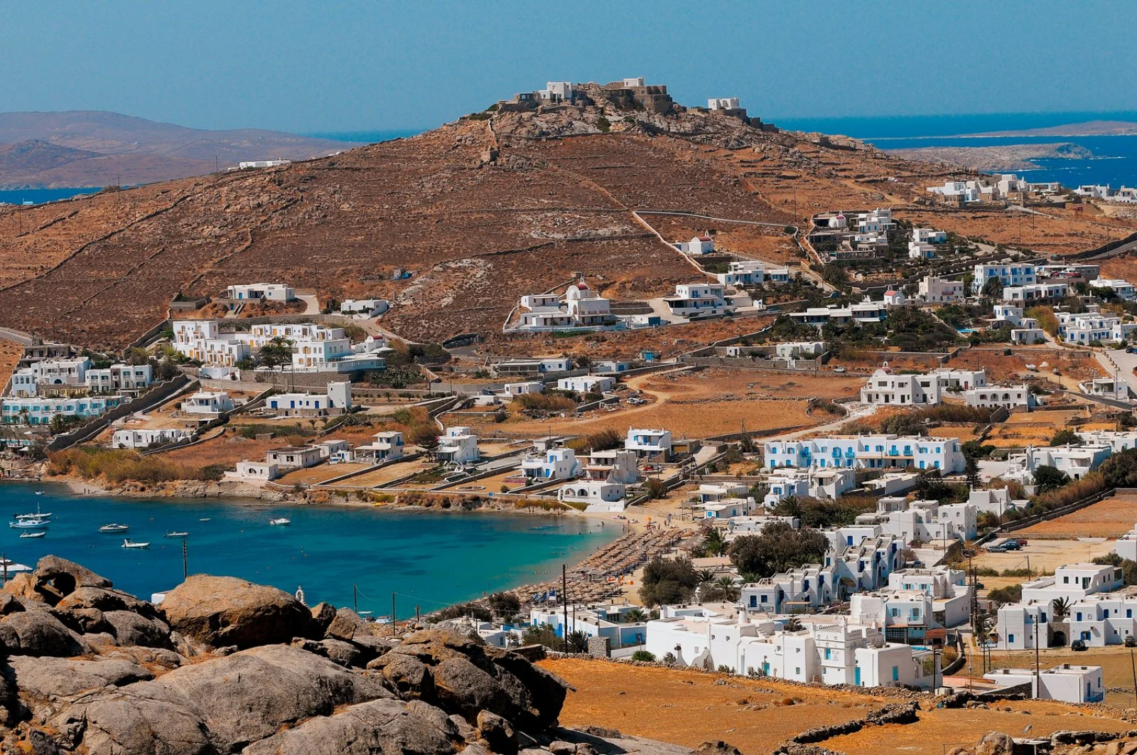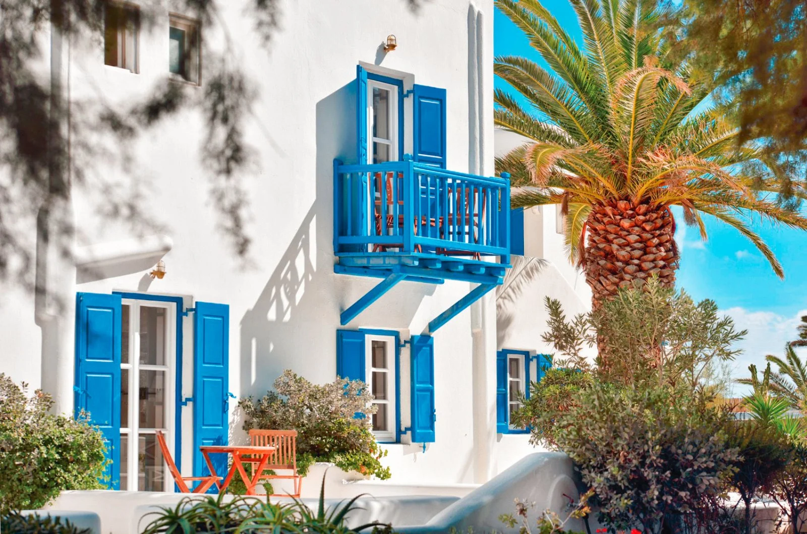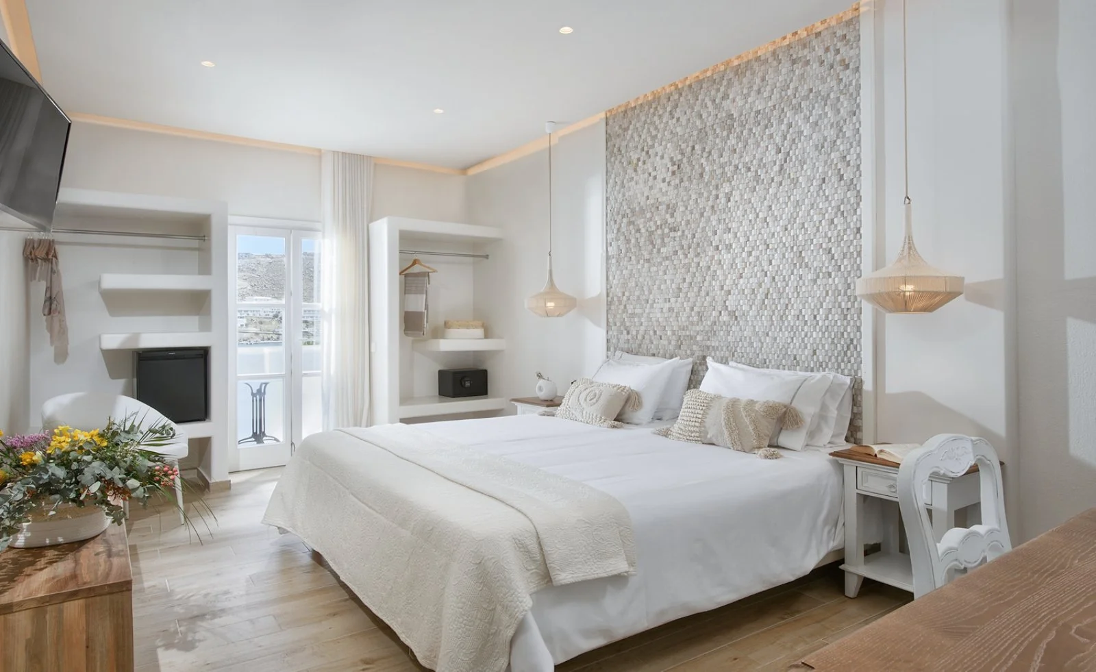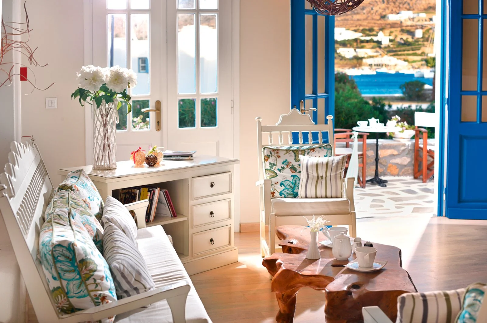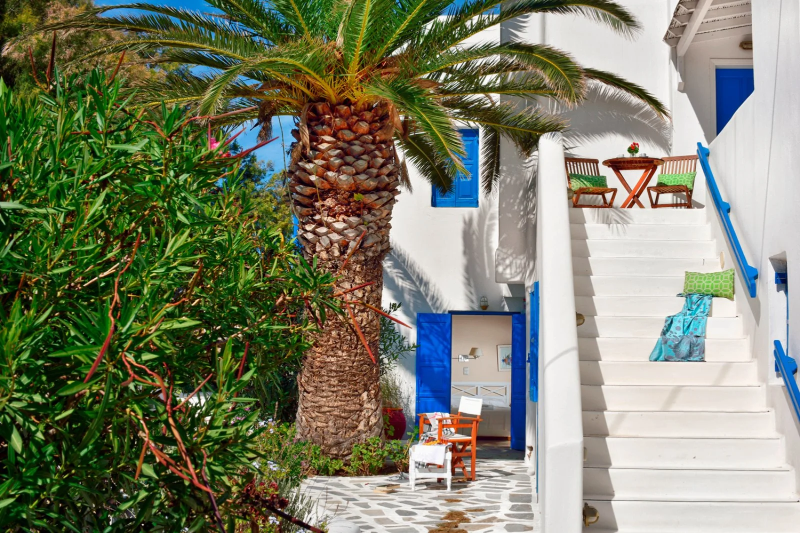 Nel centro di Ornos, punto di partenza delle caratteristiche barchette che raggiungono le spiagge più famose dell’isola. Dista circa 2,5 km da Mykonos città e 4 km dall’aeroporto. Struttura raccolta e accogliente, si compone di un unico edificio a due piani che esternamente vede primeggiare il bianco candido interrotto solo dai tipici infissi blu, cari all’architettura locale. Gli ambienti comuni e le camere, sebbene semplici, sono arricchiti da dettagli decorativi che denotano cura del particolare, che si respira anche nel grazioso giardino che separa la struttura dalla spiaggia.