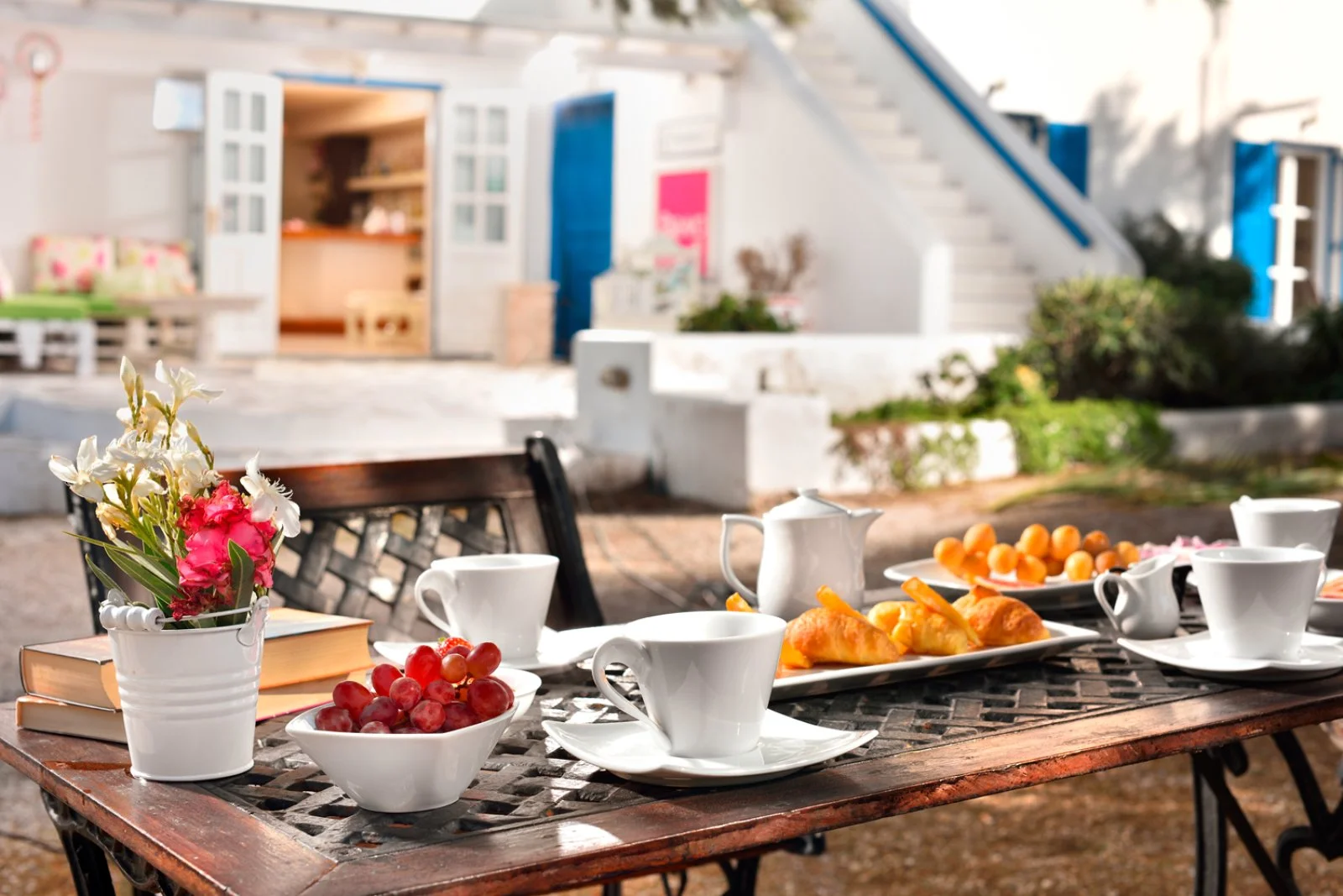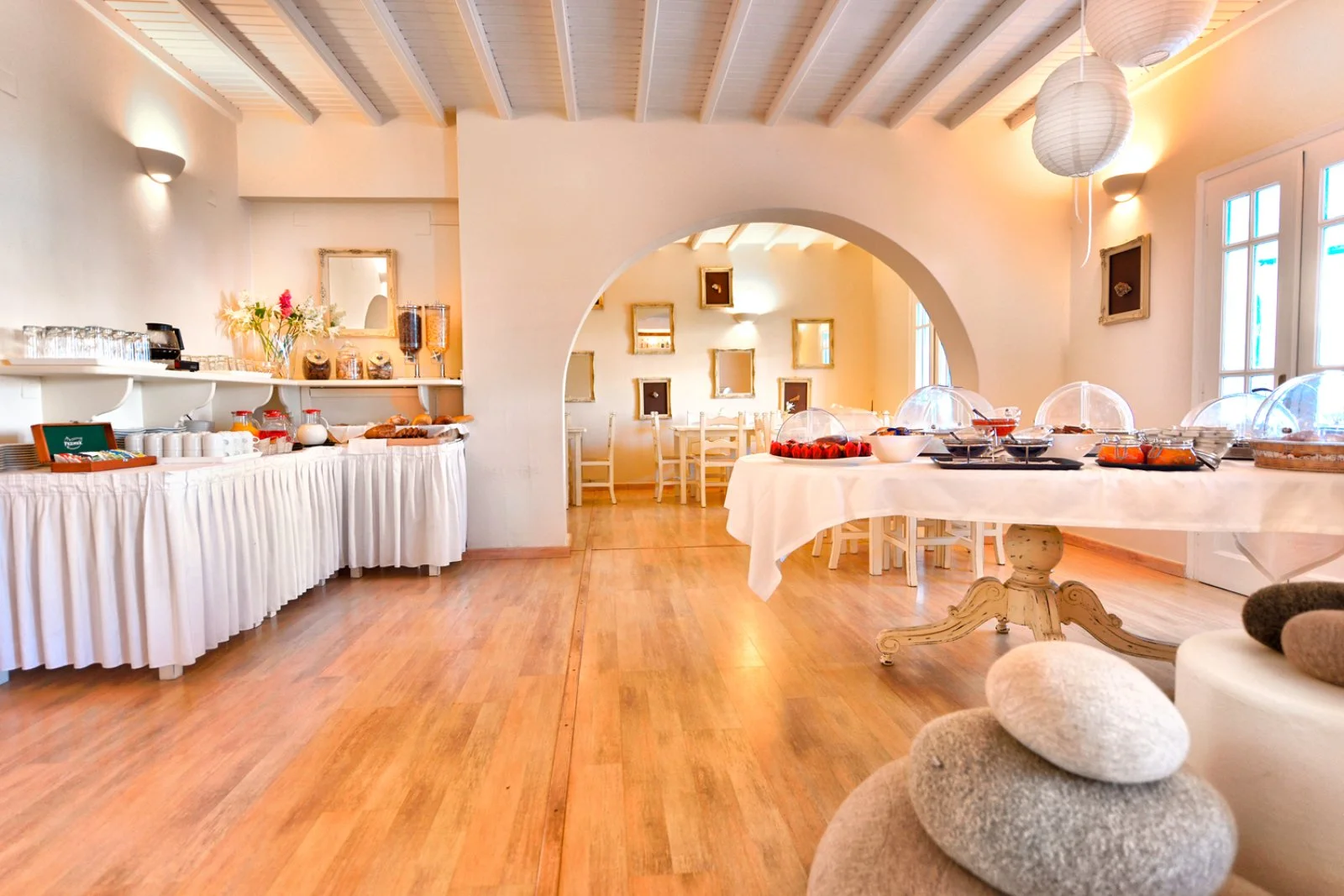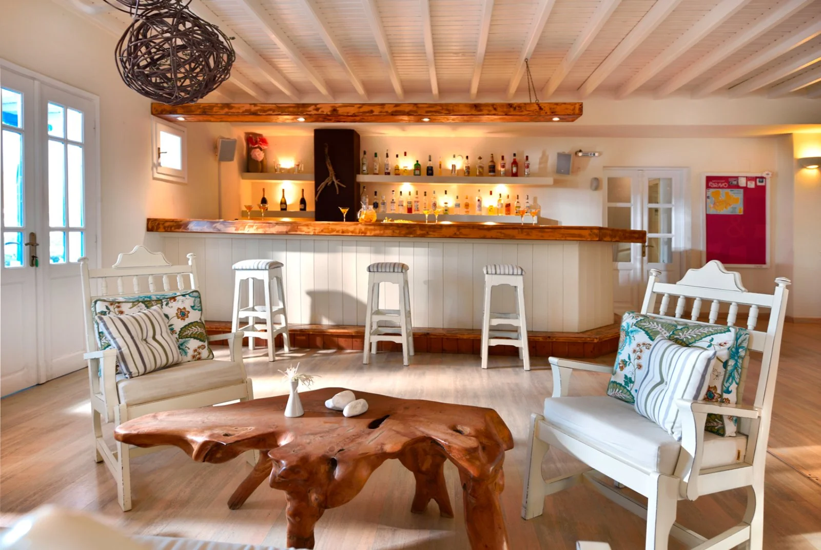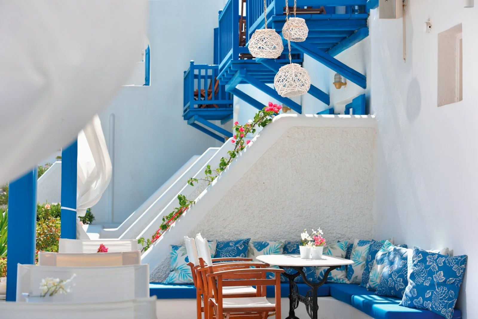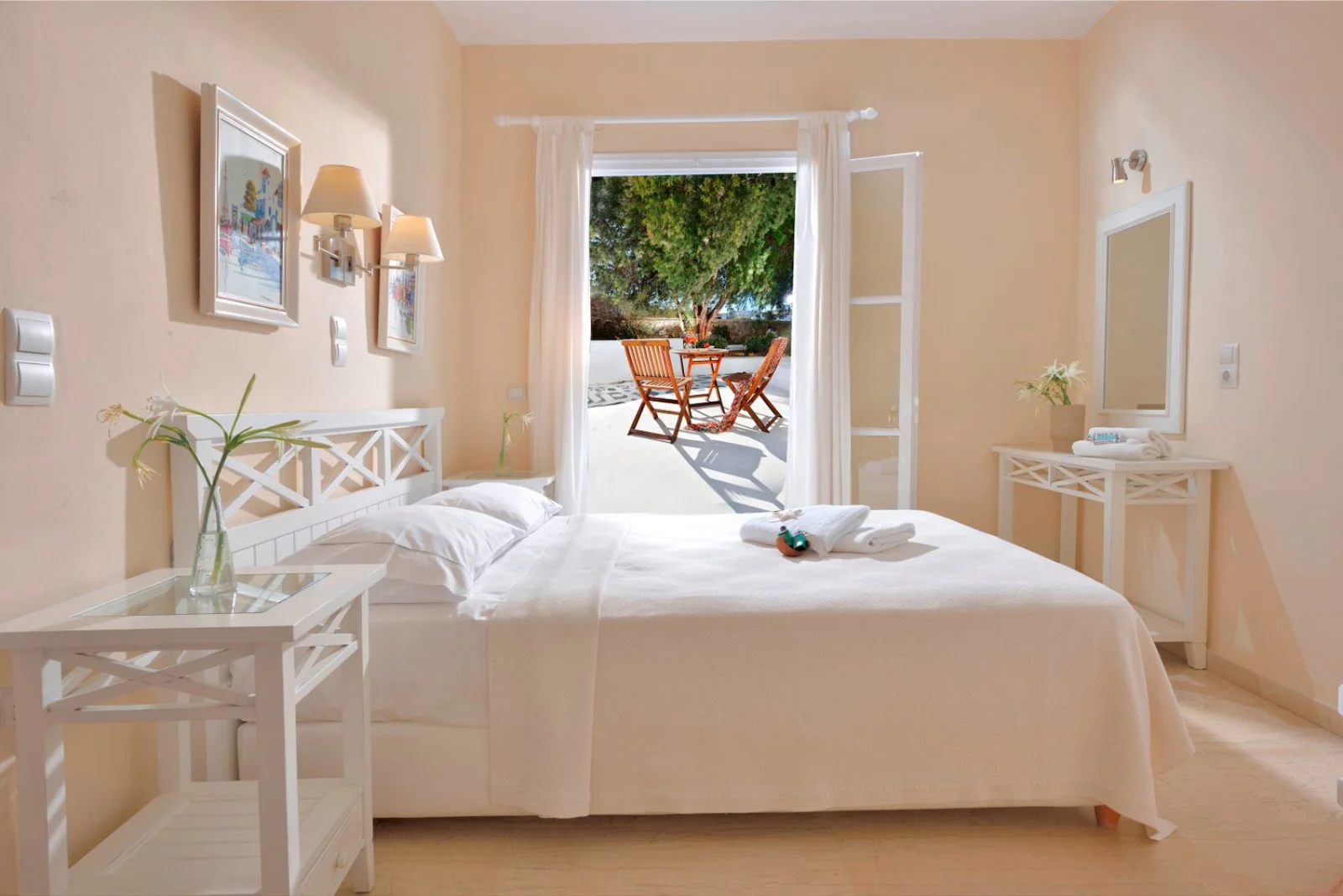 Nel centro di Ornos, punto di partenza delle caratteristiche barchette che raggiungono le spiagge più famose dell’isola. Dista circa 2,5 km da Mykonos città e 4 km dall’aeroporto. Struttura raccolta e accogliente, si compone di un unico edificio a due piani che esternamente vede primeggiare il bianco candido interrotto solo dai tipici infissi blu, cari all’architettura locale. Gli ambienti comuni e le camere, sebbene semplici, sono arricchiti da dettagli decorativi che denotano cura del particolare, che si respira anche nel grazioso giardino che separa la struttura dalla spiaggia.