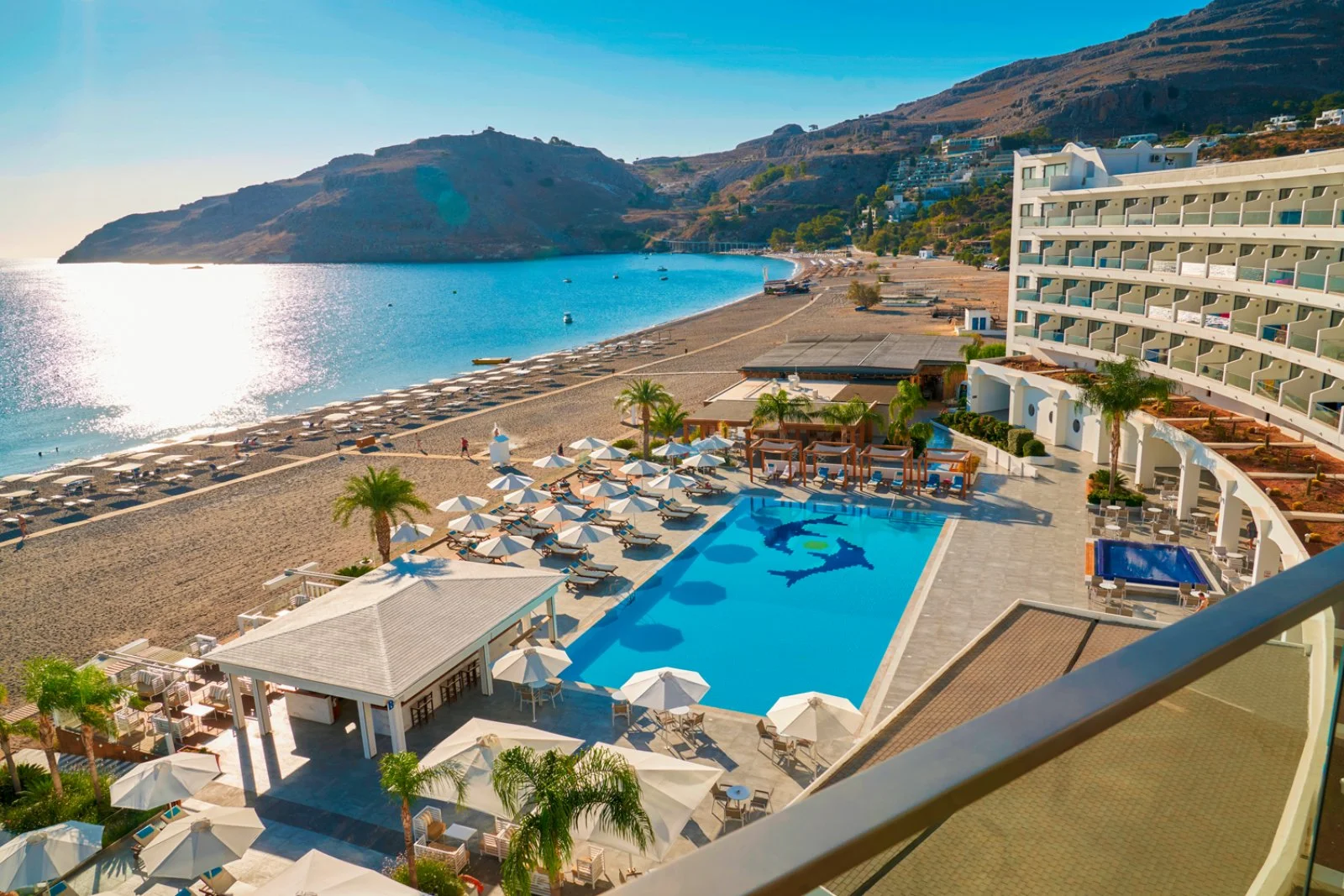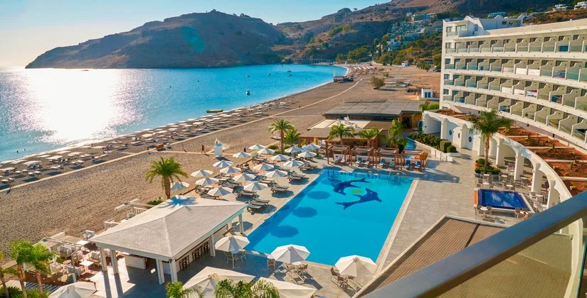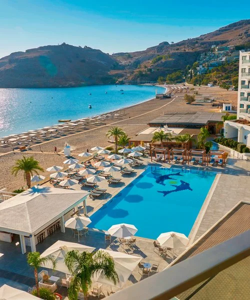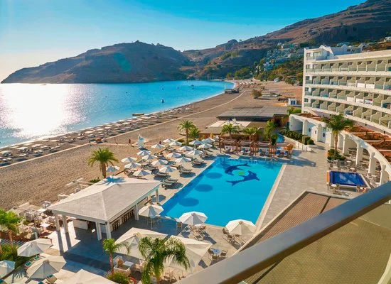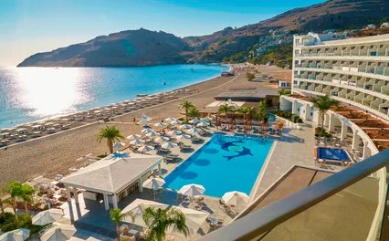 Sorge direttamente sulla stupenda spiaggia di sabbia e ciottoli di Vlicha, una delle più belle di Rodi. Dispone di 2 piscine, una esterna a bordo spiaggia e una coperta, incorniciata da ampie vetrate, presso la SPA. Uso gratuito di ombrelloni, lettini e teli mare in spiaggia e in piscina fino a esaurimento.