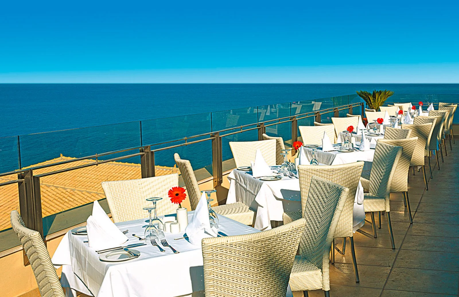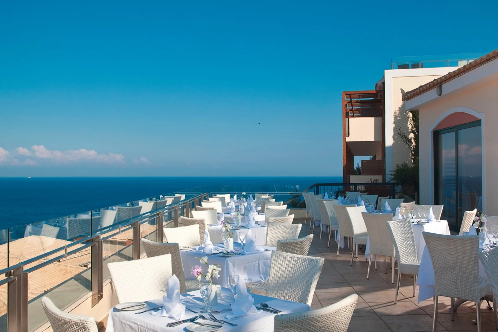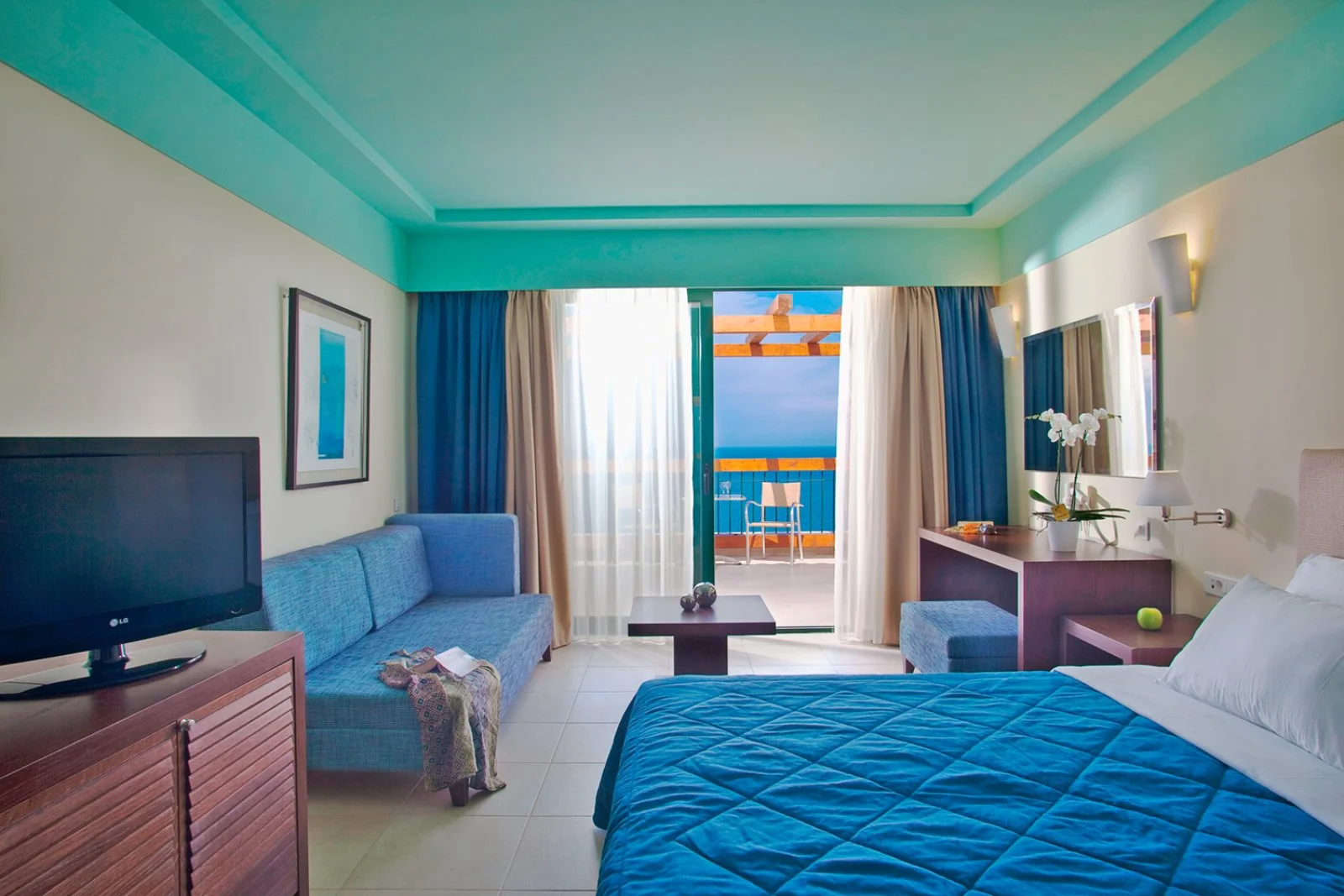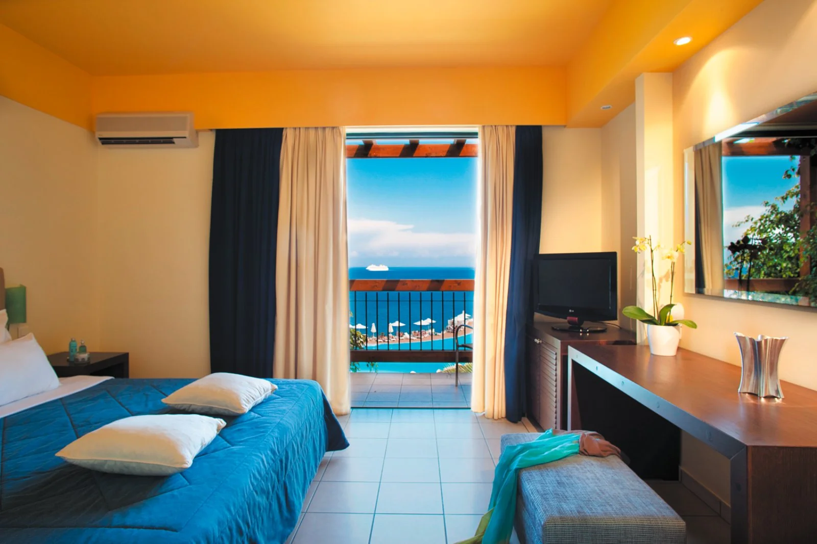 166, tutte dotate di asciugacapelli, aria condizionata, TV satellitare, cassetta di sicurezza, minifrigo (consumazioni minibar a pagamento), set per tè e caffè (con rifornimento omaggio all’arrivo), accesso internet Wi-Fi, balcone o terrazzo. Le doppie vista mare ospitano massimo 2 adulti, le più spaziose superior vista mare fino a 3 adulti, mentre le deluxe family vista mare con ambiente unico fino a 4 adulti. Inoltre, sono disponibili suite vista mare con idromassaggio o con piscina privata, entrambe costituite da camera da letto e zona giorno separate da porta scorrevole e con massima occupazione 3 adulti. Le superior e le suite dispongono anche di accappatoio e ciabattine.