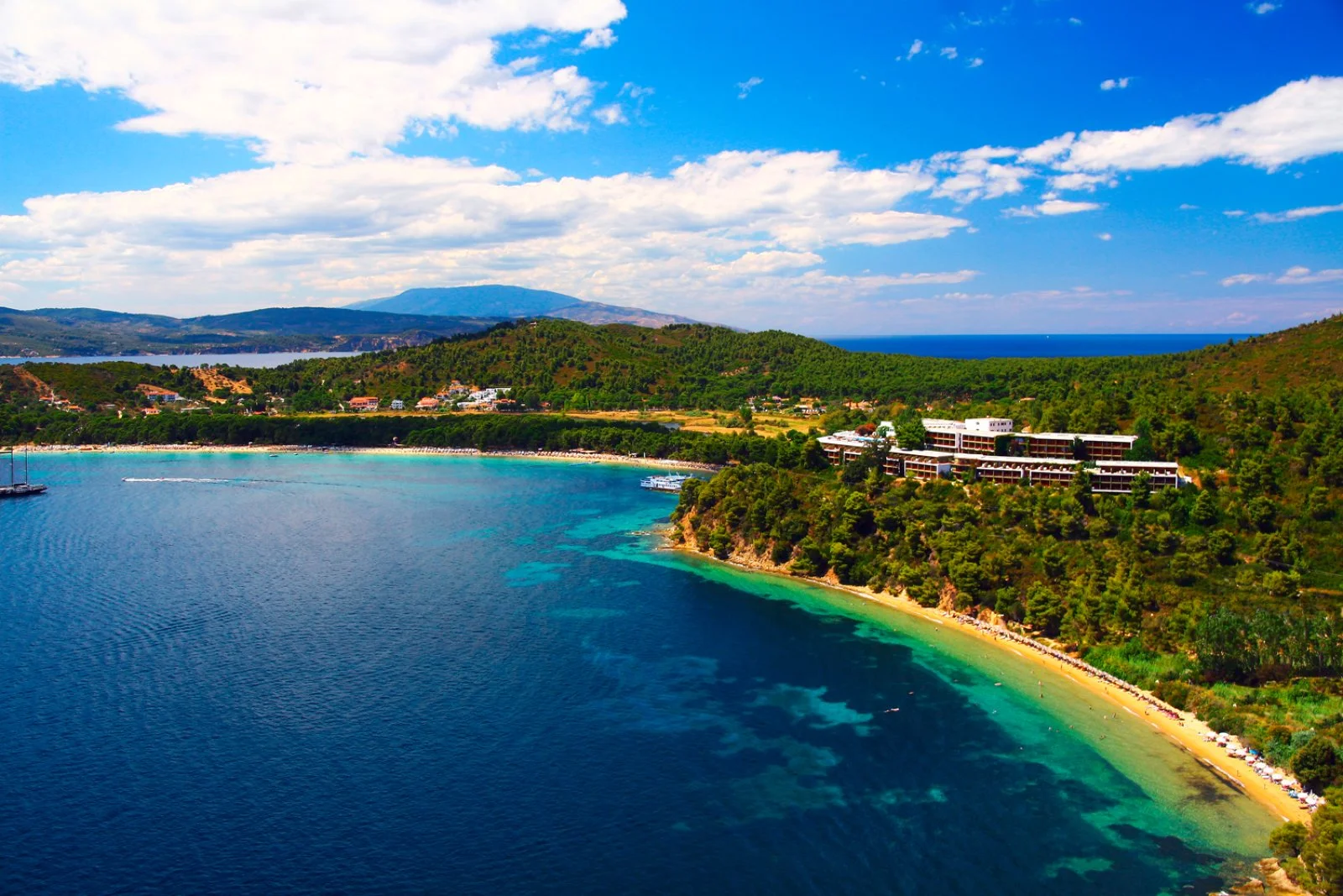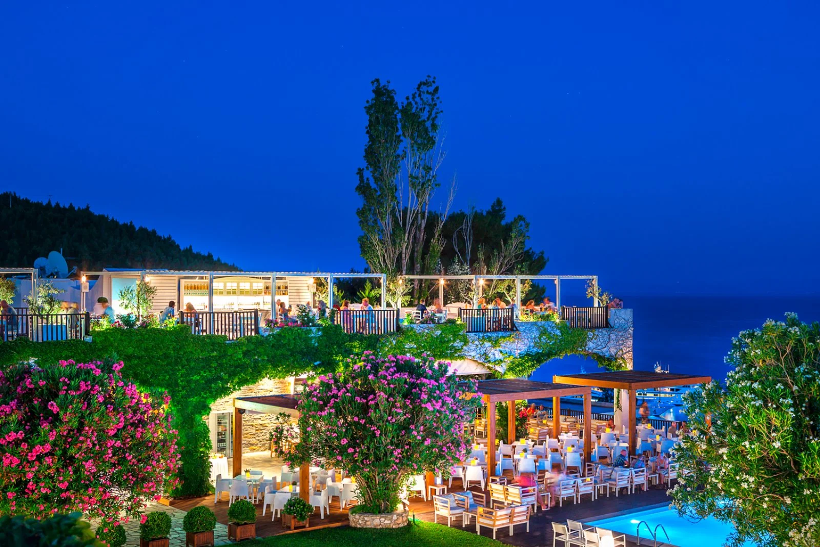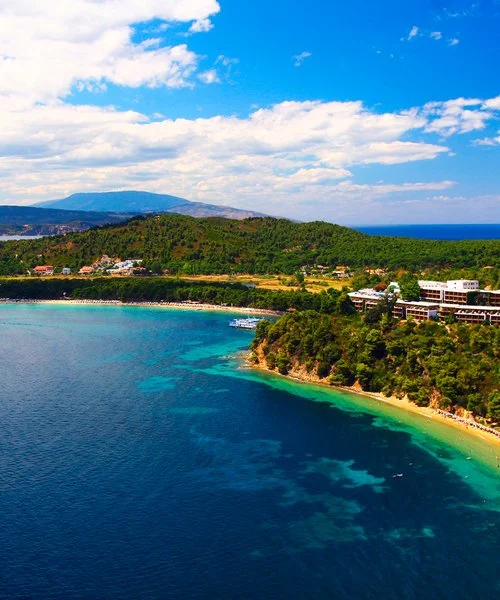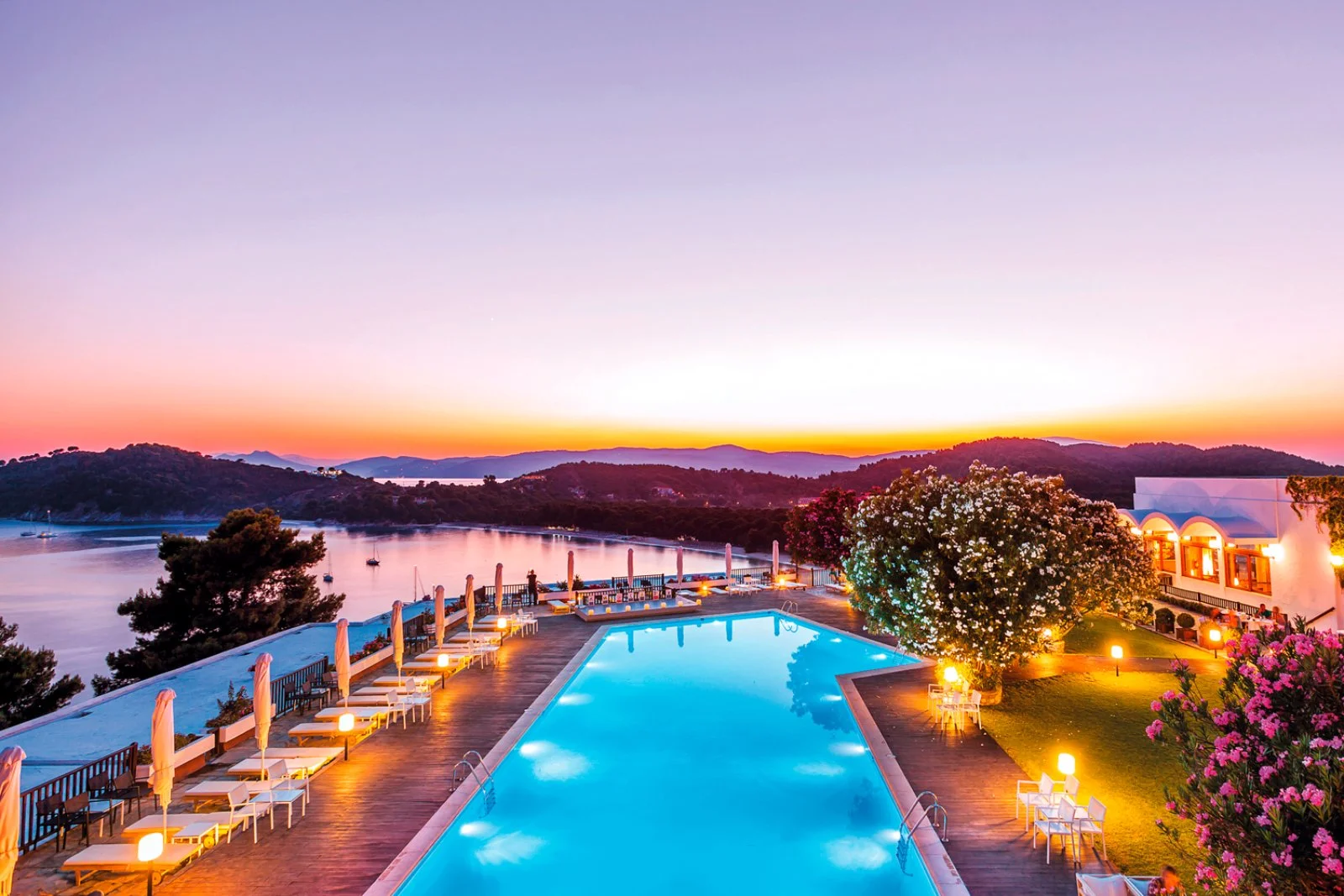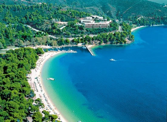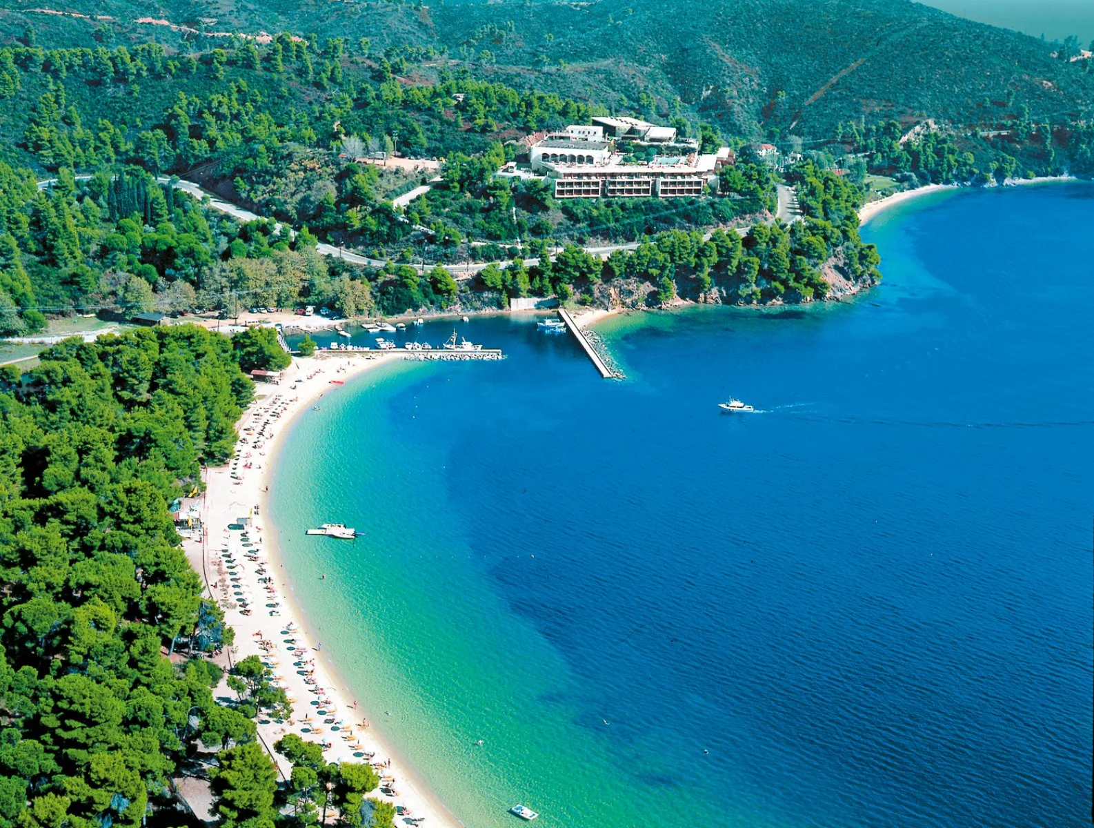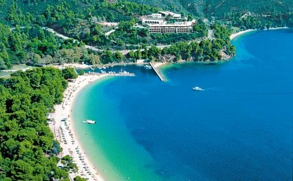 Sulla baia di Koukounaries, dista circa 10 km da Skiathos città e 12 km dall’aeroporto. Servizio navetta gratuito a orari fissi per/da le spiagge di Maratha e Koukounaries e per/da Skiathos città. La struttura è collocata in un contesto naturalistico molto interessante, circondata da una pineta, in invidiabile posizione panoramica sulla baia di Koukounaries.