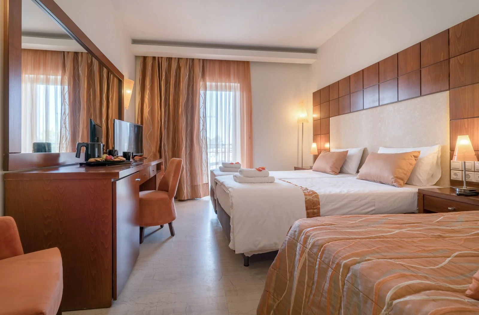 145, arredate in stile classico e tutte dotate dei maggiori comfort, tra cui asciugacapelli, accappatoio e ciabattine, aria condizionata con controllo individuale, telefono, TV satellitare, minifrigo, bollitore e set per tè e caffè, accesso internet Wi-Fi, balcone o terrazza. Tra le varie tipologie di camere, Alpitour propone doppie standard (massimo 3 adulti), superior (massimo 2 adulti + 1 bambino) e doppie standard con piscina privata (massimo 3 adulti e 1 bambino). Disponibili su richiesta le premium e le premium swim-up, queste ultime con accesso diretto ad una piscina condivisa con altre 6 camere. Entrambe si trovano nell'edificio annesso e ospitano fino a 3 adulti e 1 bambino. A pagamento e su richiesta: cassetta di sicurezza e consumazioni minibar.