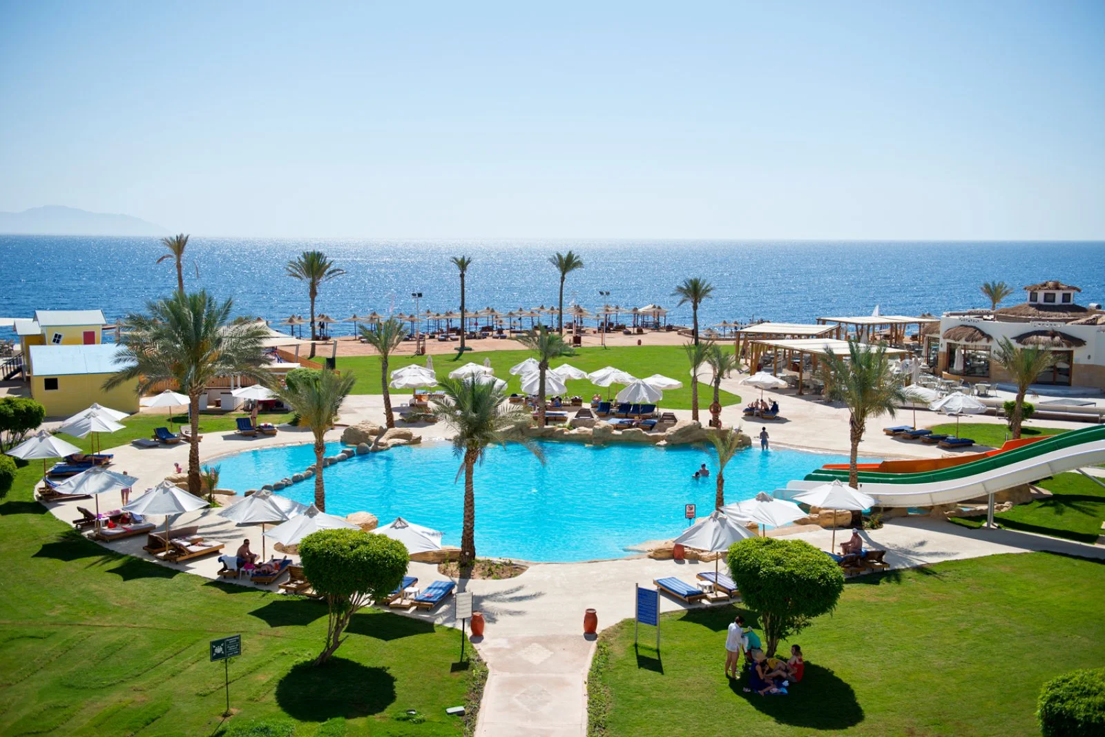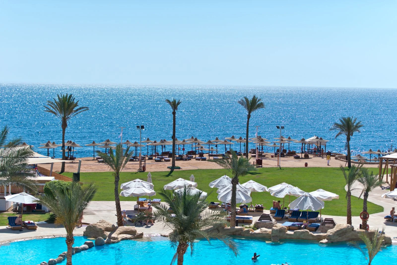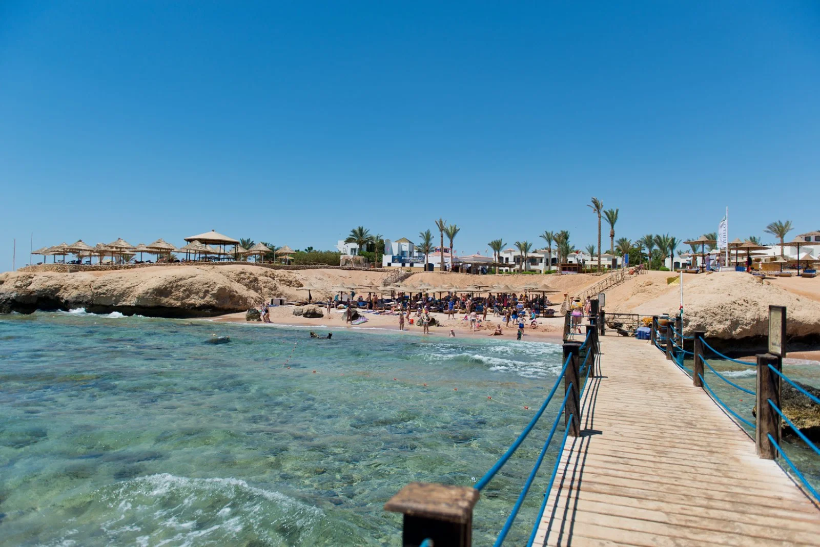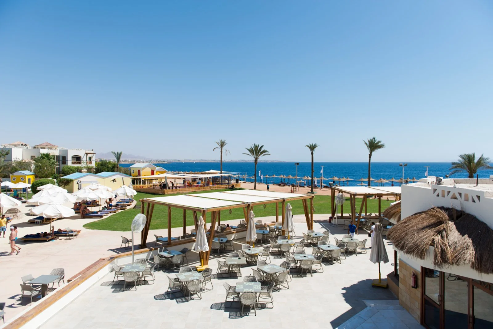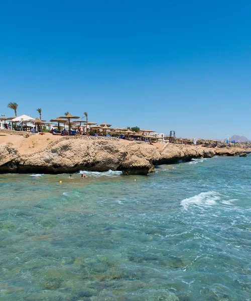 Amphoras Beach sorge in posizione scenografica sulla Ras Umm Sid, con un layout ampio e curato che rende semplici gli spostamenti interni e l’accesso alle principali aree del resort. La spiaggia, estesa e ben attrezzata, offre 300 metri di litorale e un pontile che permette di entrare in mare in tutta sicurezza e raggiungere la barriera corallina, uno dei tratti più affascinanti del Mar Rosso e molto apprezzato da chi pratica snorkeling e immersioni.