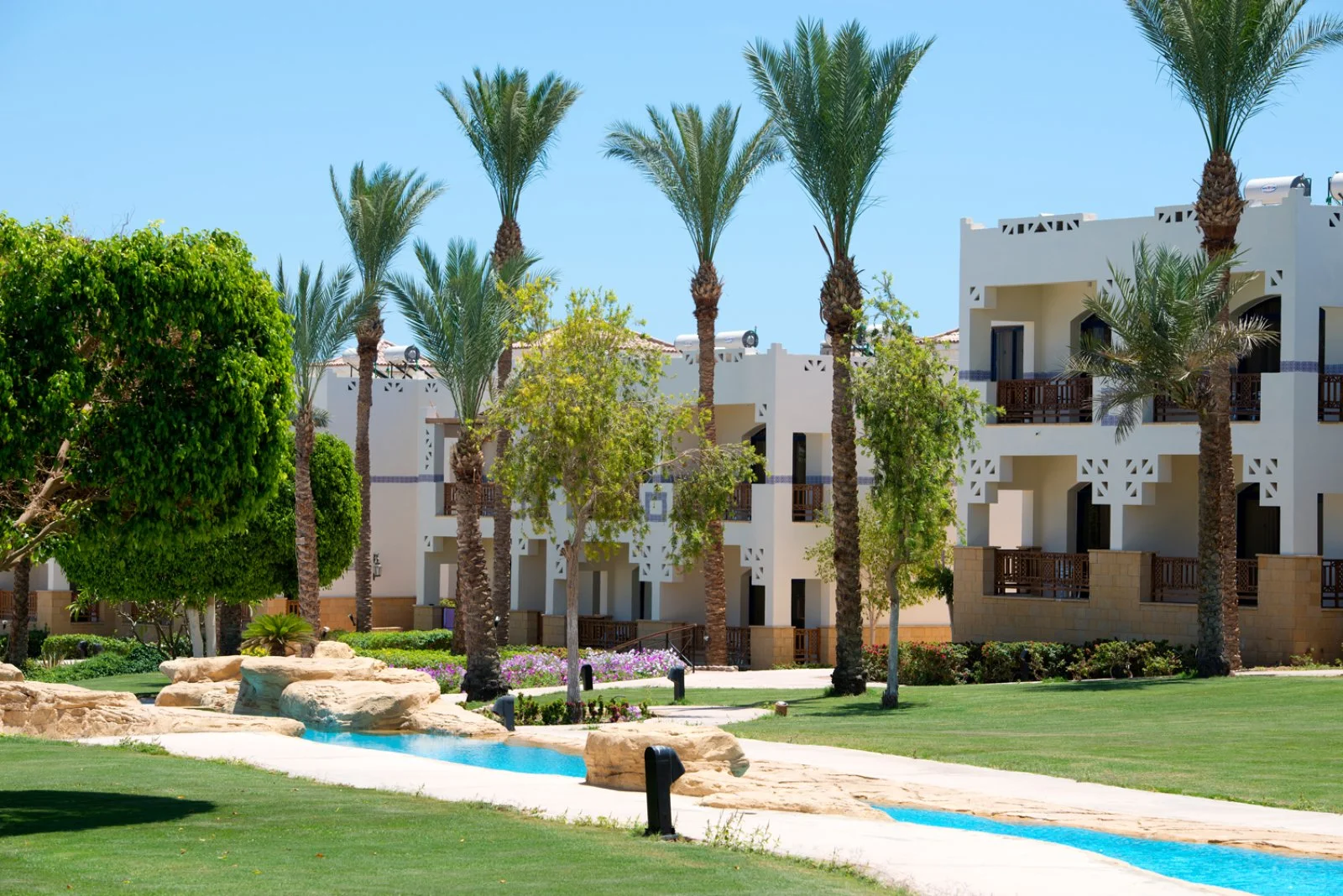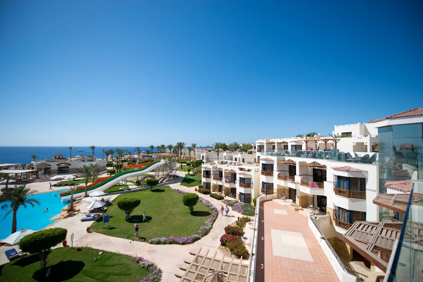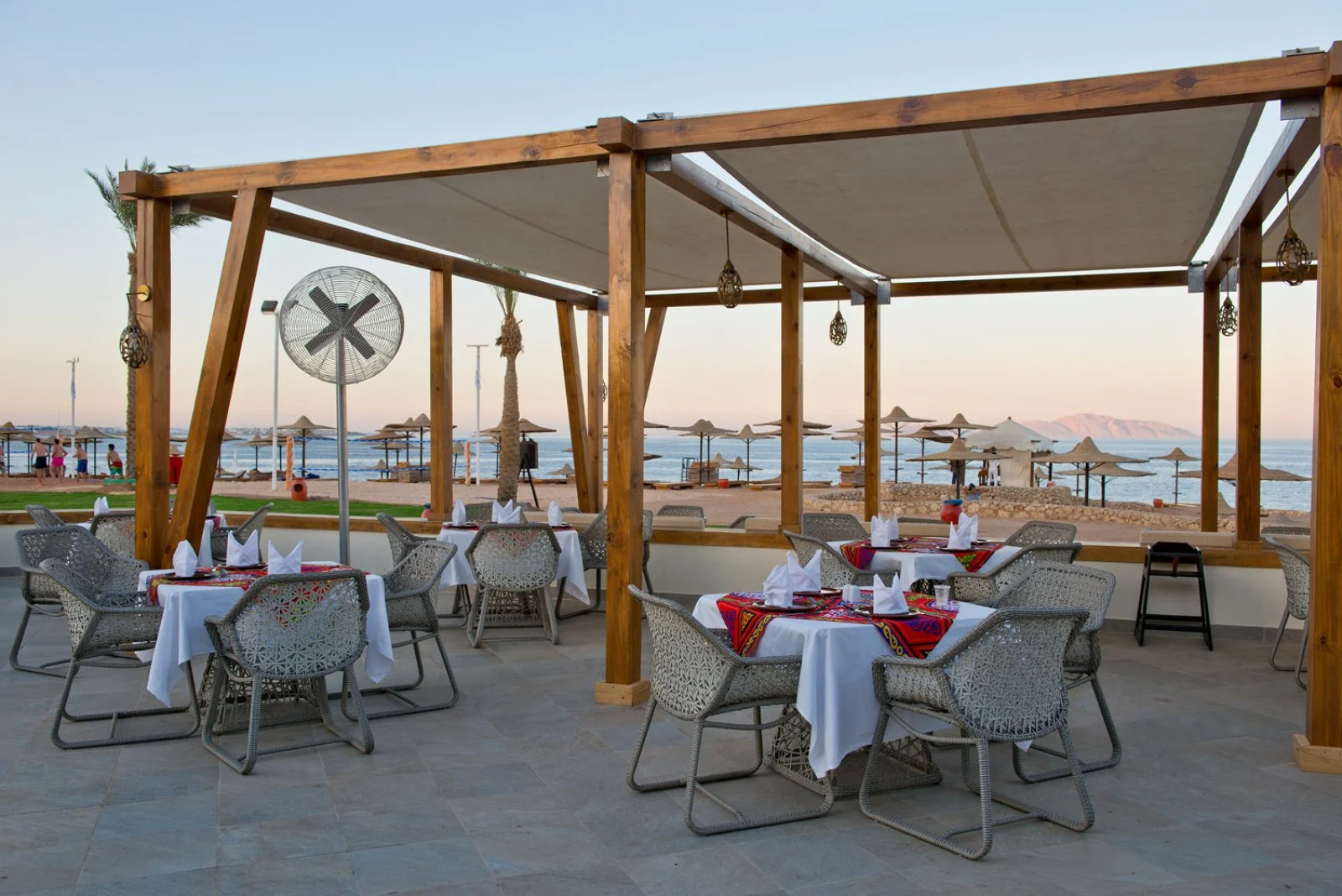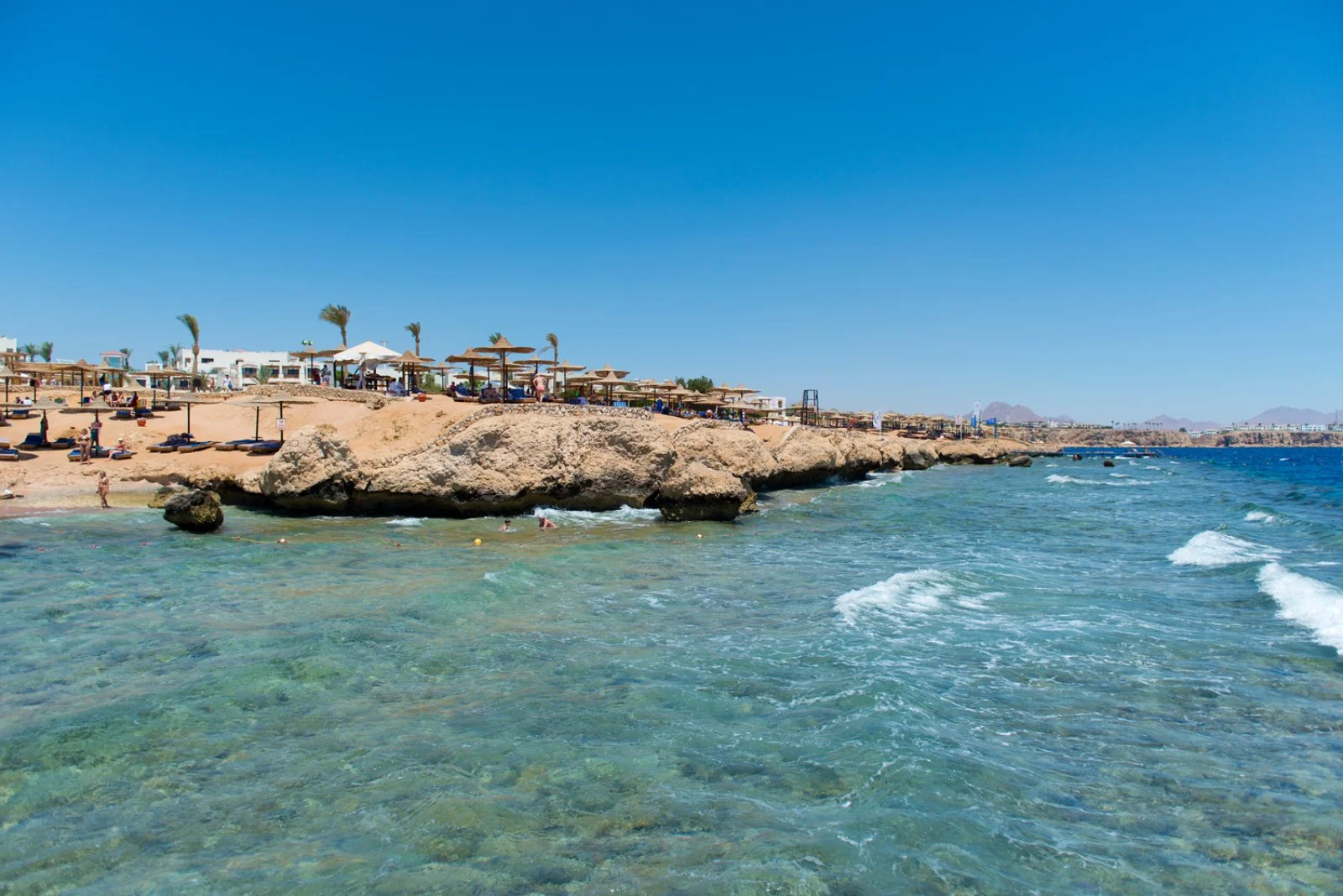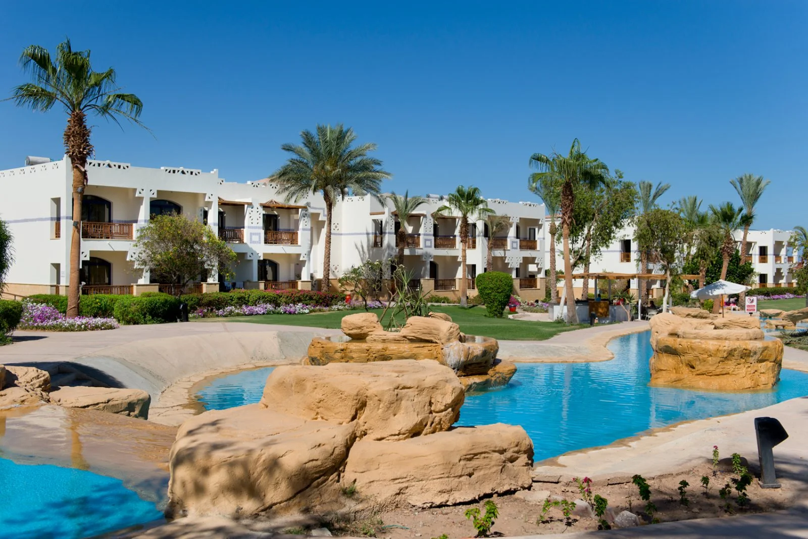 Amphoras Beach sorge in posizione scenografica sulla Ras Umm Sid, con un layout ampio e curato che rende semplici gli spostamenti interni e l’accesso alle principali aree del resort. La spiaggia, estesa e ben attrezzata, offre 300 metri di litorale e un pontile che permette di entrare in mare in tutta sicurezza e raggiungere la barriera corallina, uno dei tratti più affascinanti del Mar Rosso e molto apprezzato da chi pratica snorkeling e immersioni.