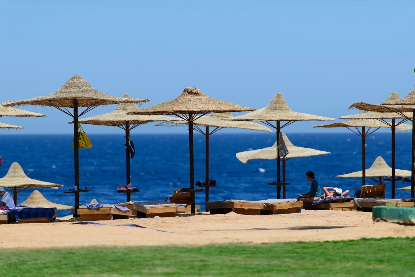 spiaggia corallina ricavata da terrazzamento sabbioso sulla roccia, con lettini, ombrelloni e teli mare a disposizione. Accesso al mare oltre la barriera con apposito pontile (25m).