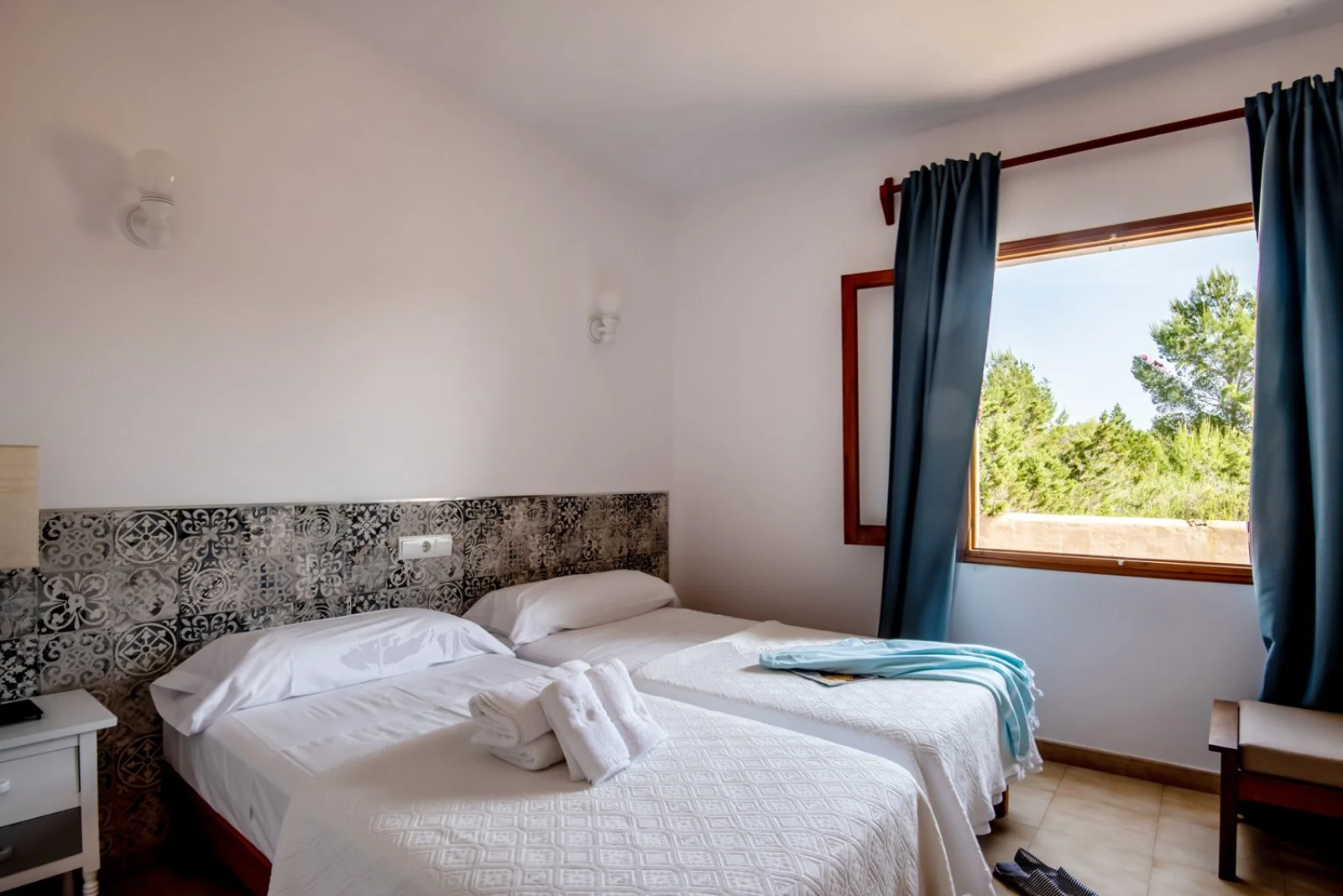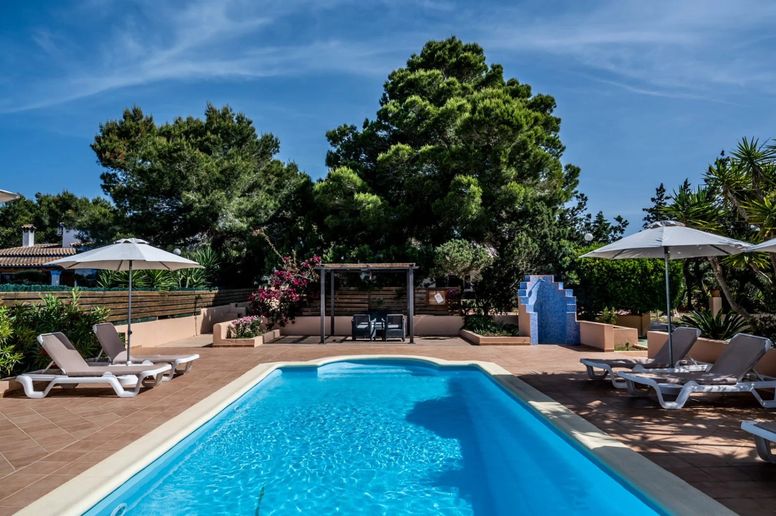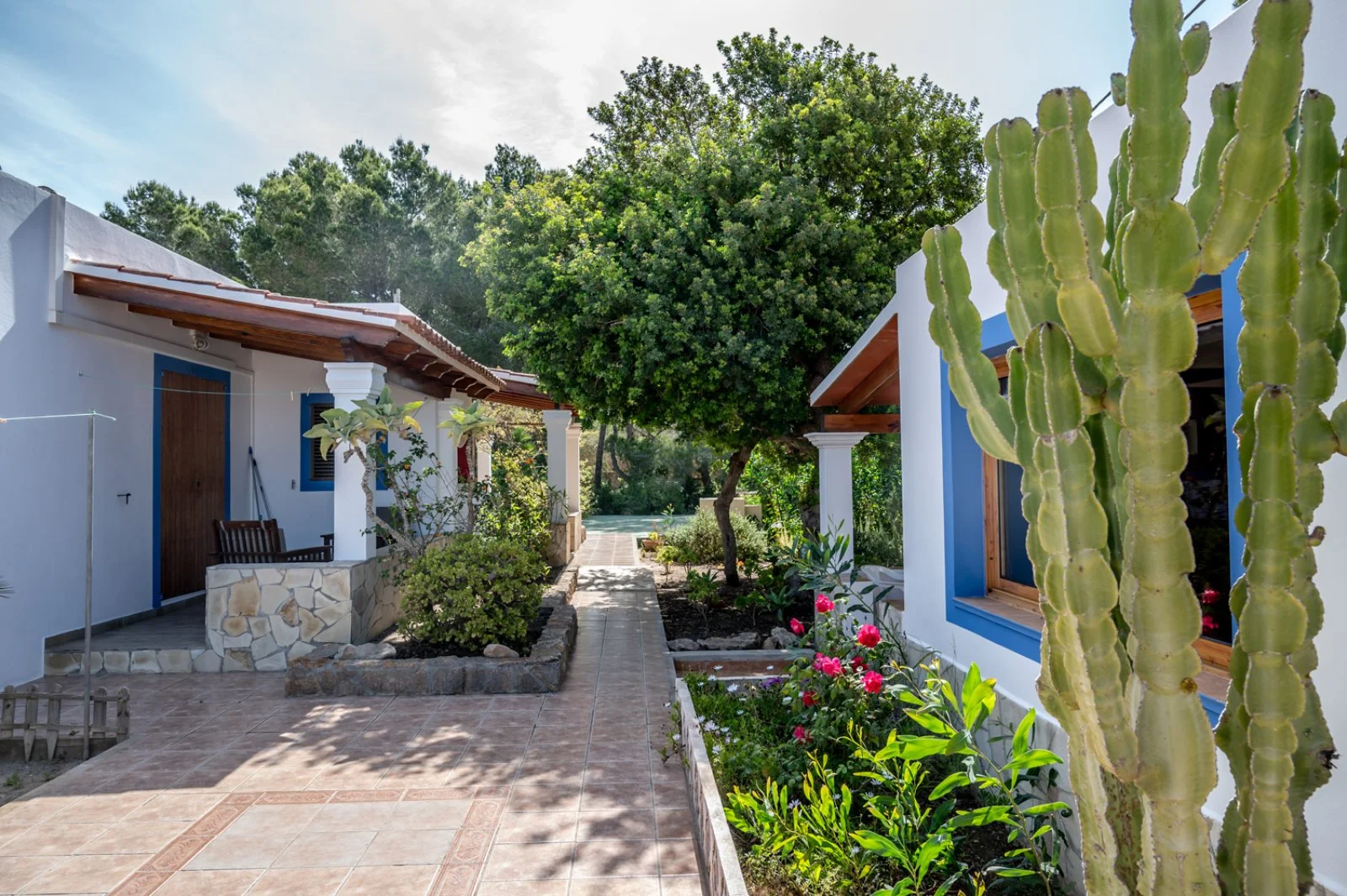 Mitjorn, a 300 m dall’omonima spiaggia, a 4 km da Es Pujols e dal capoluogo Sant Francesc, 9 dal porto de La Savina.