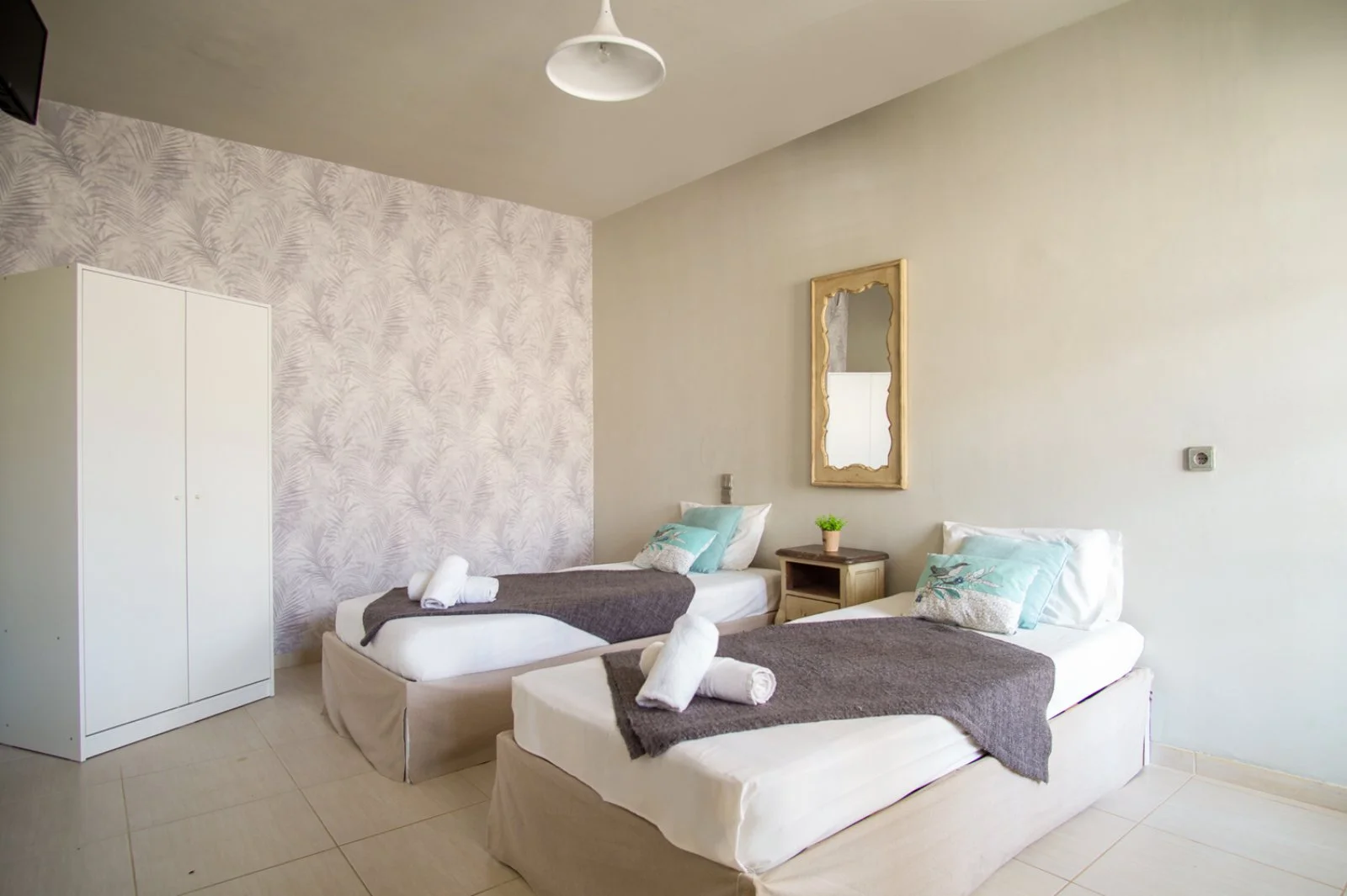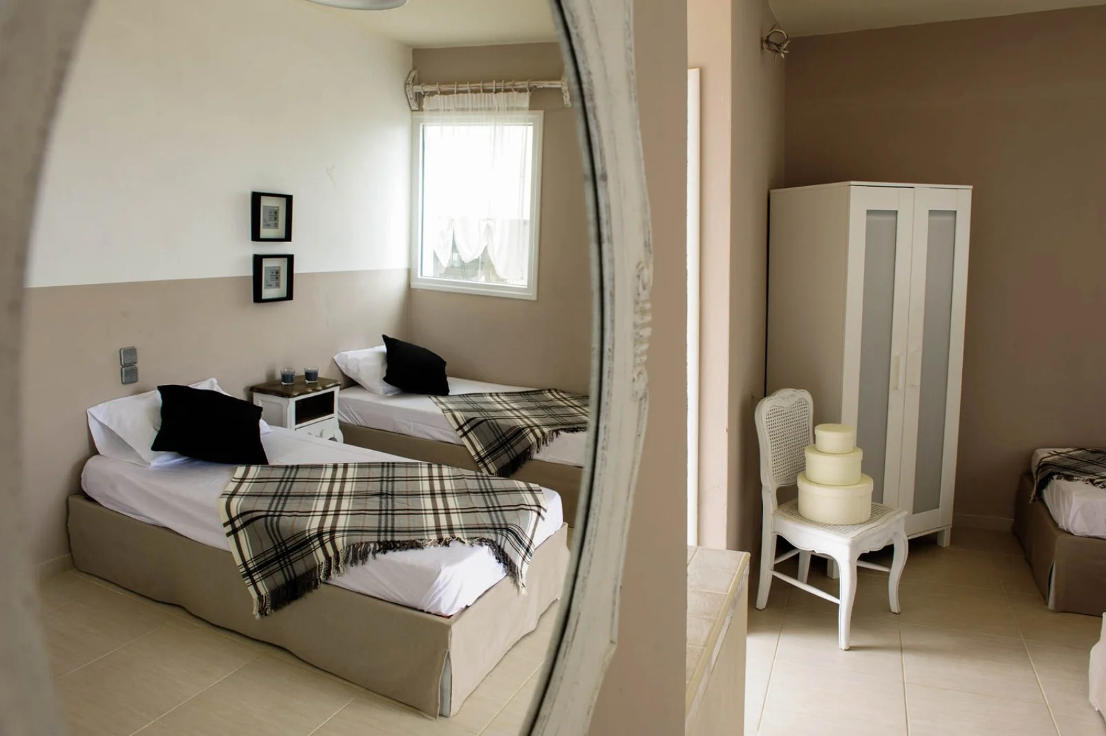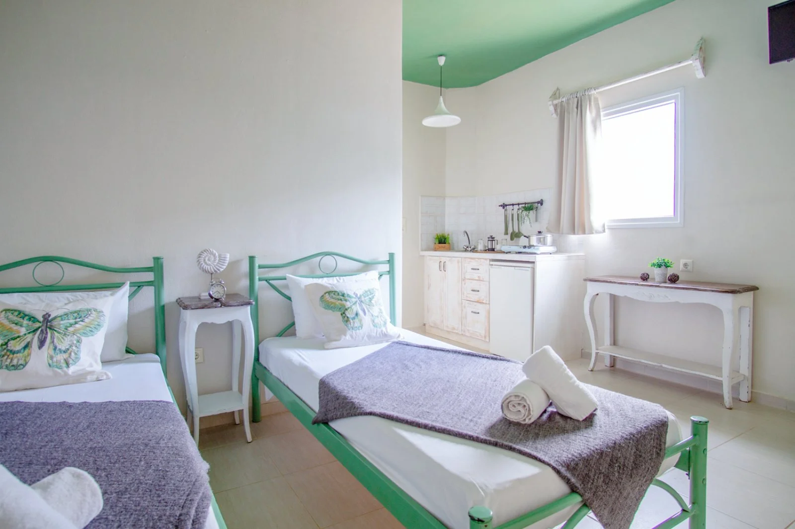Malia, a 400 m dal centro, 1,5 km dalla spiaggia, 7 da Hersonissos e 32 dall’aeroporto di Heraklion. Fermata del bus a 200 m.