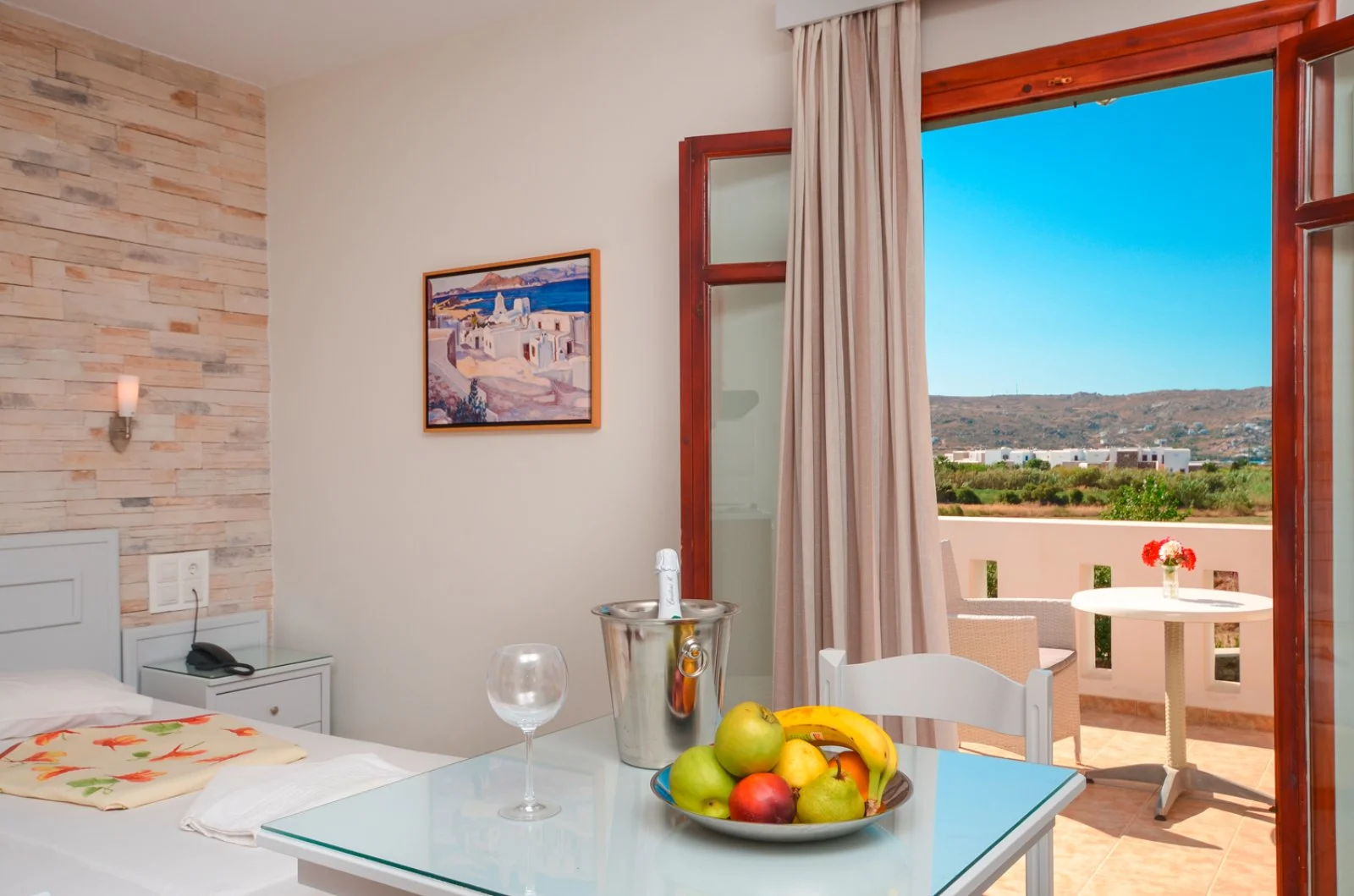 Plaka, a 200 m dalla spiaggia di Plaka, 4 km da quella di Agios Prokopios, 7,5 da Naxos città e dal suo porto. Fermata bus di fronte all’hotel.