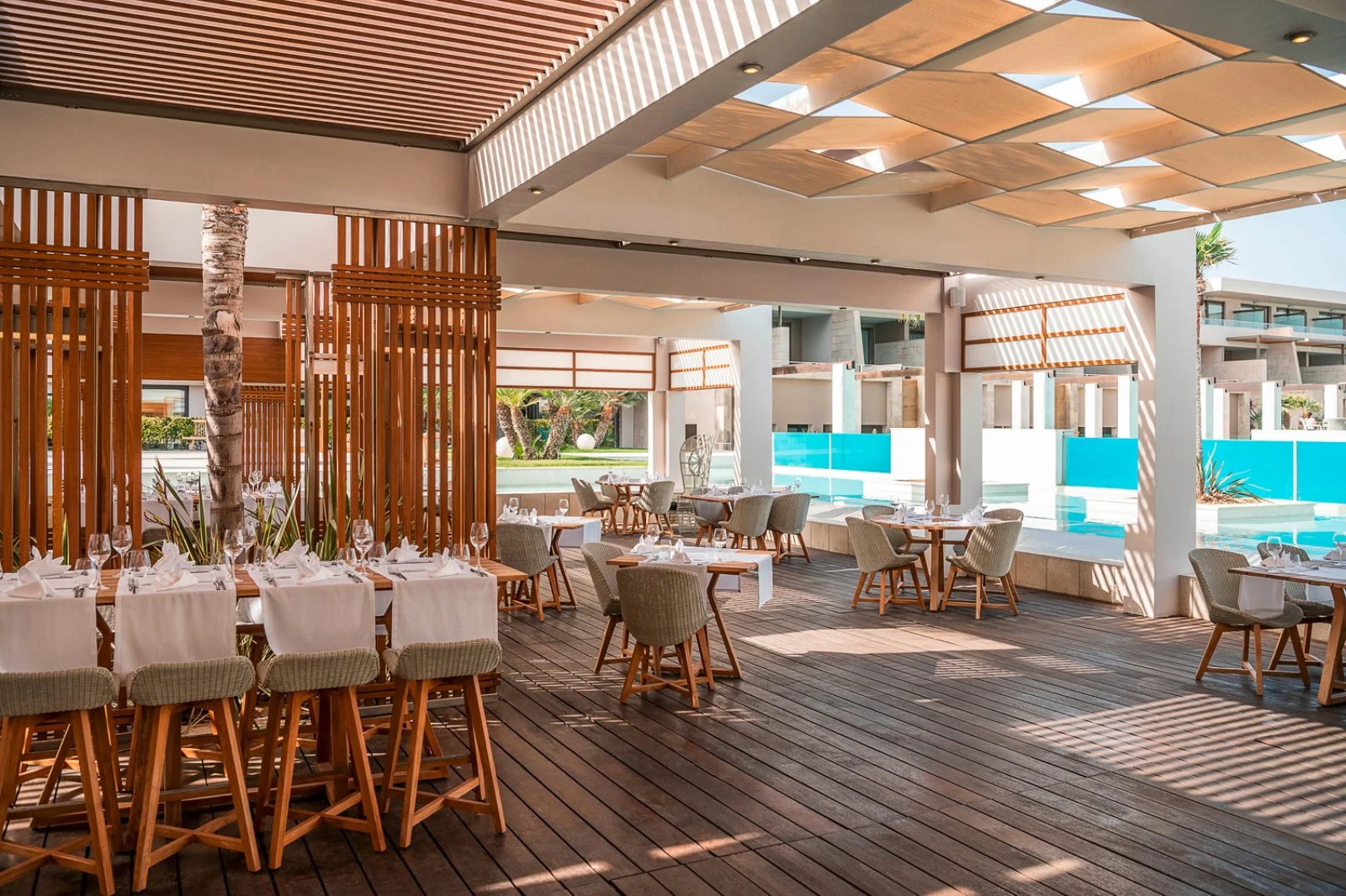 Raffinato ristorante principale, panoramico sulla piscina, che offre un ricco buffet di ottima qualità per la prima colazione e la cena, inoltre 3 ristoranti tematici à la carte (a pagamento) che propongono cucina italiana, mediterranea e cretese. La struttura dispone di 3 bar di cui uno molto scenografico a bordo piscina.