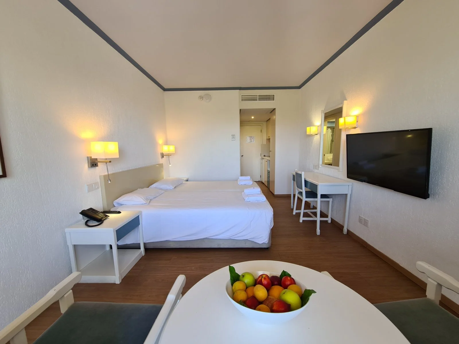 98 tra studio e appartamenti bilocali (65-75 m2) disposti in più edifici di 3 piani con servizi privati, asciugacapelli, aria condizionata, telefono con linea diretta, tv satellitare, connessione wi-fi, angolo cottura con minifrigo, forno, microonde, bollitore e alcuni con terrazza o balcone. A pagamento, cassetta di sicurezza. Cambio biancheria da letto e da bagno rispettivamente 1 e 3 volte a settimana.