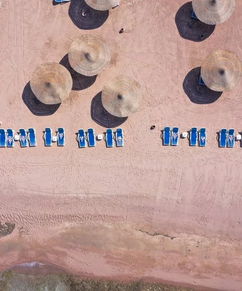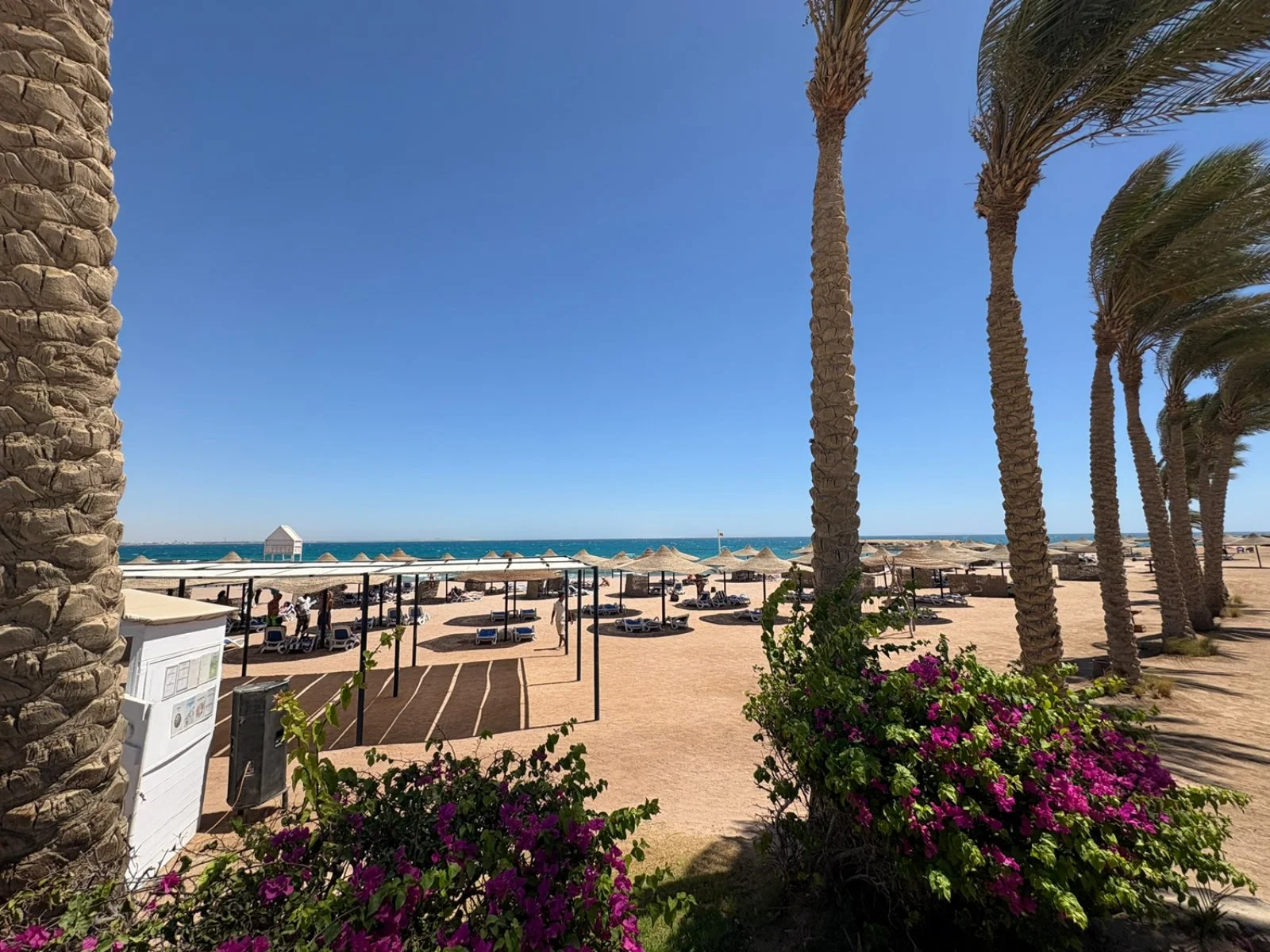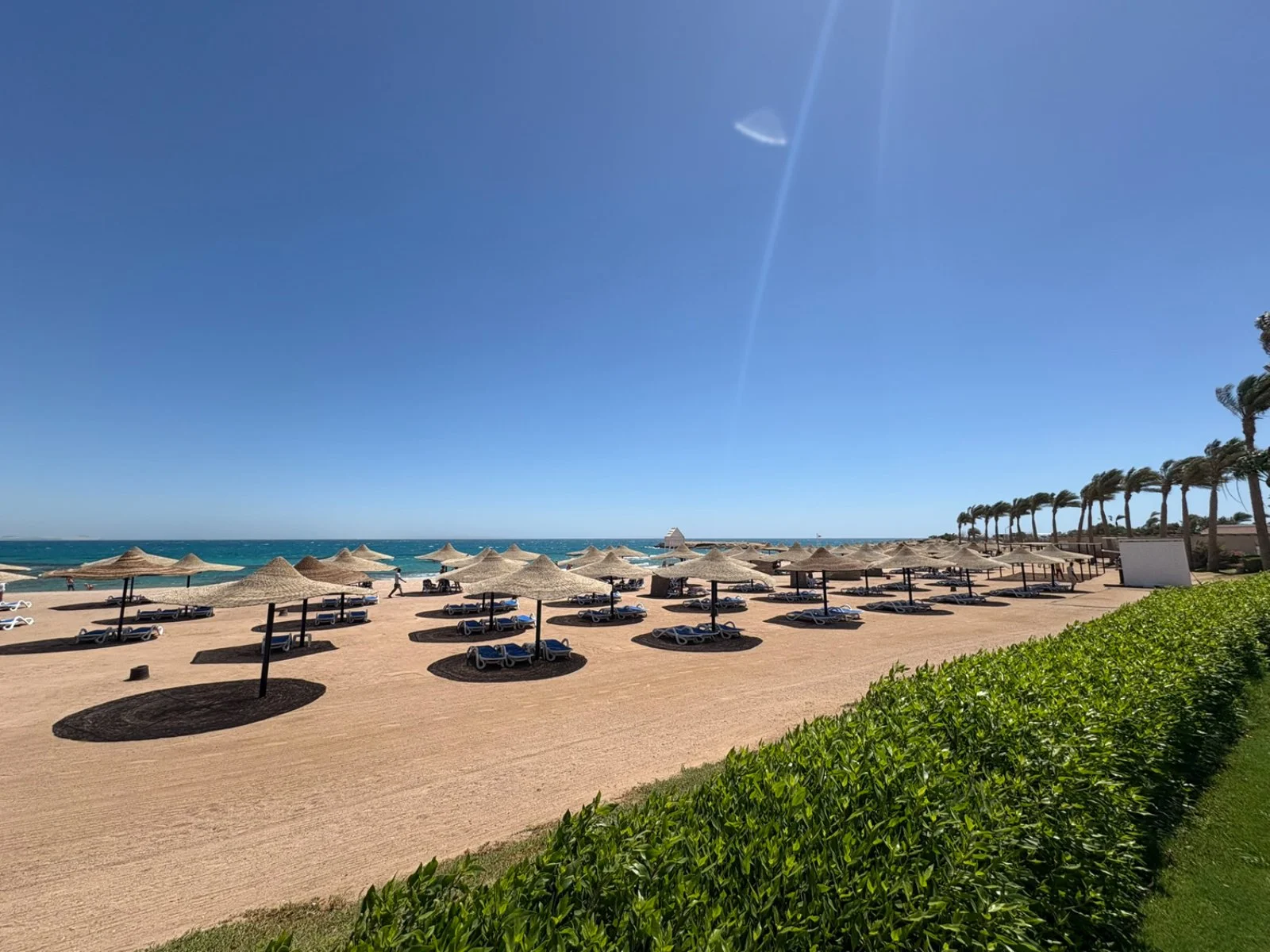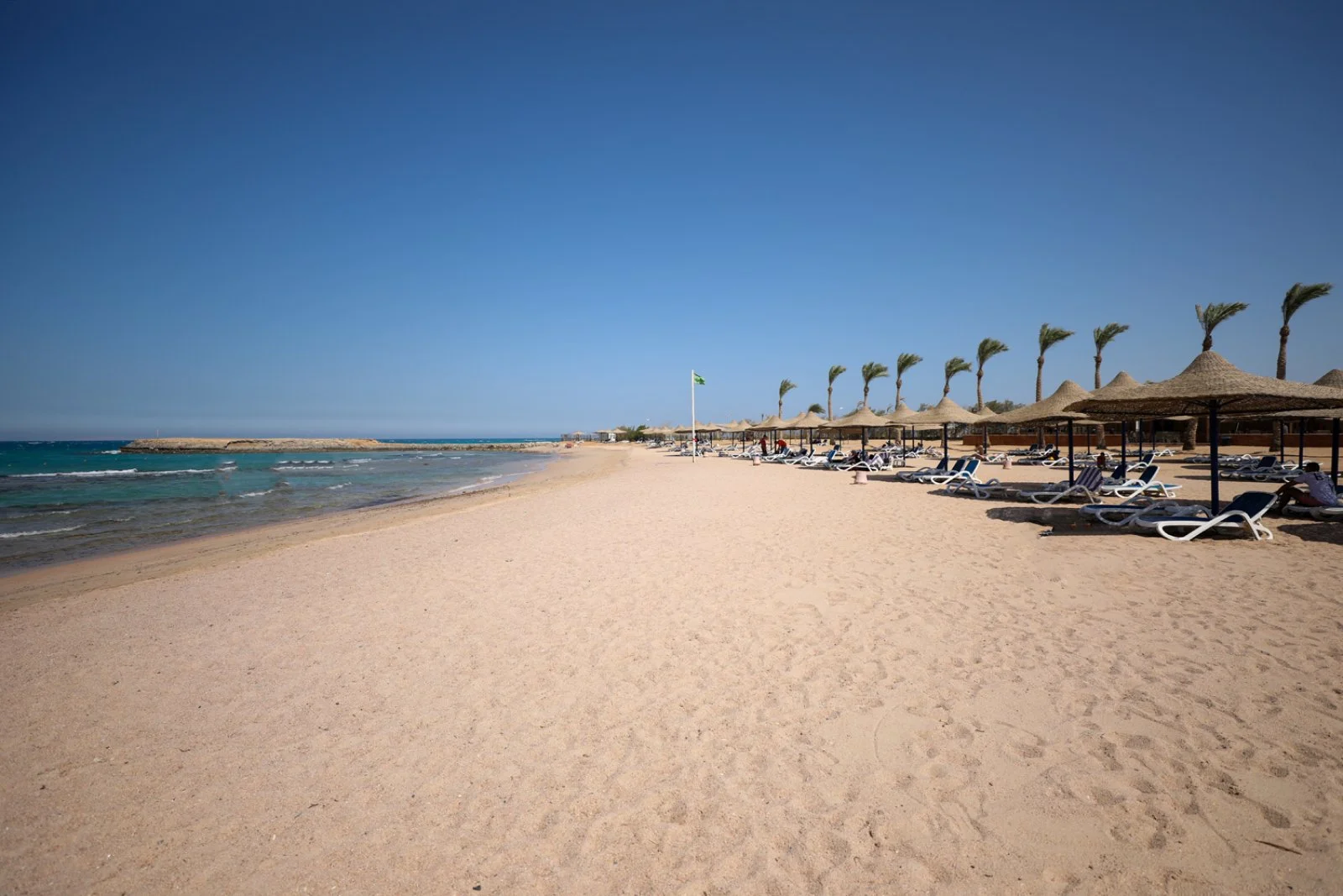 ampia baia, subito oltre il parco acquatico, lunga circa 1000 m, con ombrelloni, lettini e teli mare a disposizione. E’ formata da una zona con accesso sabbioso digradante e la barriera corallina è facilmente raggiungibile a nuoto (si consiglia l’uso delle apposite scarpette). Una navetta interna collega la reception con la spiaggia ogni 15 minuti.
