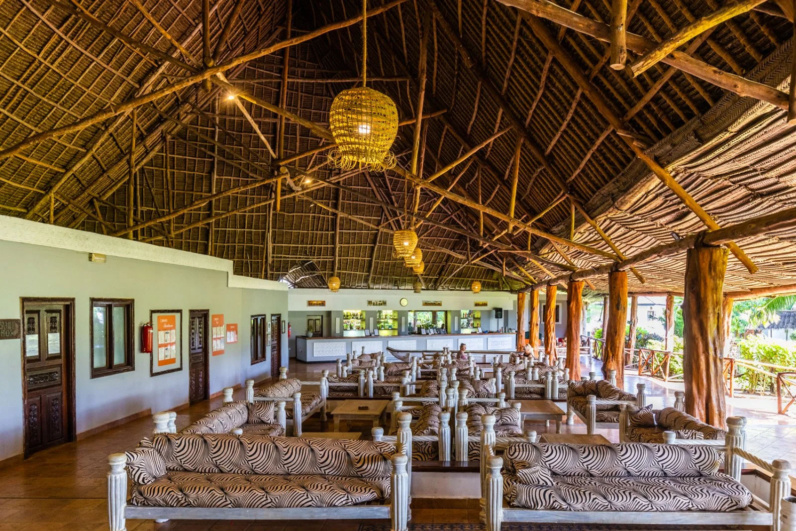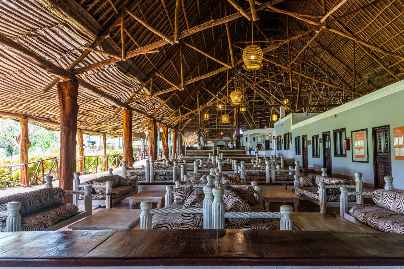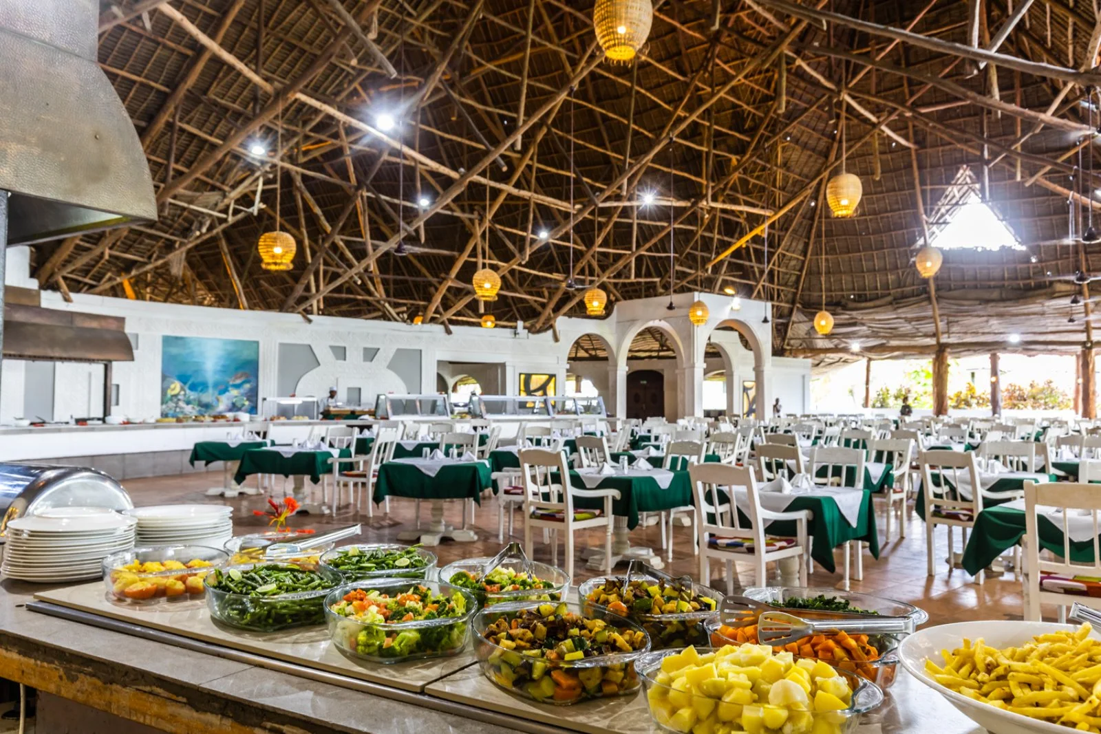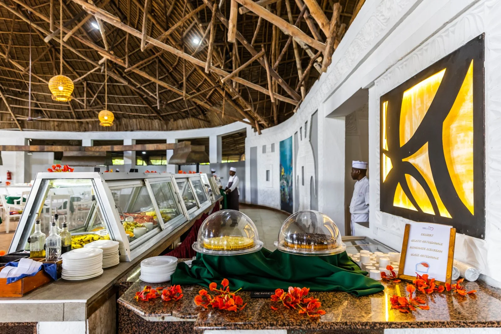La formula tutto incluso prevede pensione completa nel ristorante principale a buffet e griglia Ngalawa, con presenza di cuochi di scuola italiana, sinonimo di fantasia e qualità in cucina. Bevande incluse ai pasti: soft-drink, acqua minerale naturale, birra e vino locali serviti in bicchiere. Adiacente al ristorante principale, sorge la pizzeria Garden, apertura a discrezione della Direzione, immersa nel verde tropicale sotto le stelle di Zanzibar che offre, sempre in formula tutto incluso, la possibilità di gustare su prenotazione, il menù italiano con antipasto di salumi, verdure, pizza a scelta e dessert vari, anche in questo caso con bevande incluse. Su prenotazione a pagamento ci si può deliziare con una cena a base di aragosta. Sulla spiaggia e vicino alla piscina si trova il Baobab Beach Cafè snack bar ristorante e pizzeria con bevande alcoliche e analcoliche ad orari fissi, dove si potrà stuzzicare qualcosa durante la giornata e, dalle ore 13 alle ore 14.30, è aperto, su prenotazione, il ristorante pizzeria per un invitante pranzo a buffet o per una gustosa pizza cotta in forno a legna. I bar servono caffetteria, soft-drink e birra locale serviti in bicchiere, vino locale e alcolici nazionali fino alle ore 24 (Nanga Bar). A pagamento: caffè espresso, cappuccino, alcolici di importazione premium, bevande in bottiglia e le consumazioni prima delle 10 e dopo le ore 24.