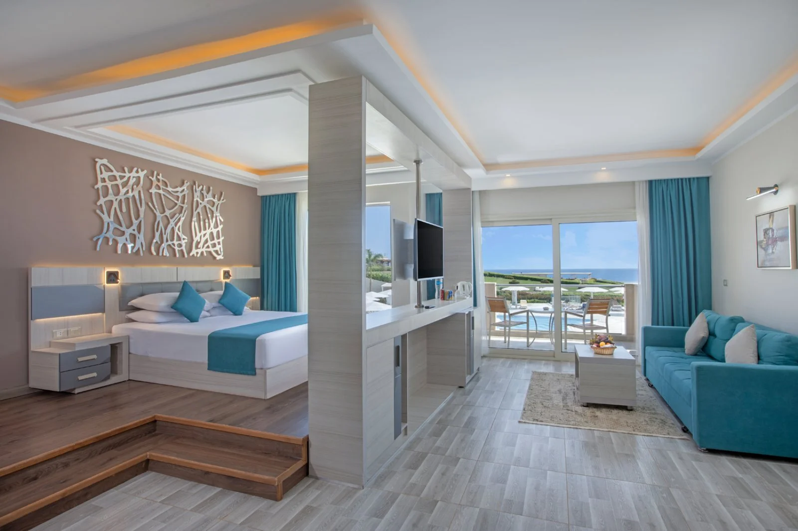 328 camere, suddivise in premium vista mare laterale, premium vista baia, premium lobby fronte mare, premium fronte mare (min. 14 anni) e junior suite fronte mare (min. 14 anni). Moderne e molto luminose, sono tutte dotate di servizi privati con asciugacapelli e specchio di cortesia, letto king-size e sofà bed per 2 persone, TV satellitare, aria condizionata con controllo individuale, cassetta di sicurezza, set per la preparazione di tè e caffè all’americana, balcone attrezzato con un tavolino e due sedie, minibar (primo rifornimento di acqua e soft-drink gratuito, una bottiglia grande di acqua minerale naturale al giorno), accappatoio e ciabatte da camera. Le junior suite fronte mare, riservate alla clientela adulta oltre i 14 anni, dispongono inoltre di ampia cabina armadio e di zona notte rialzata con pavimento in legno.