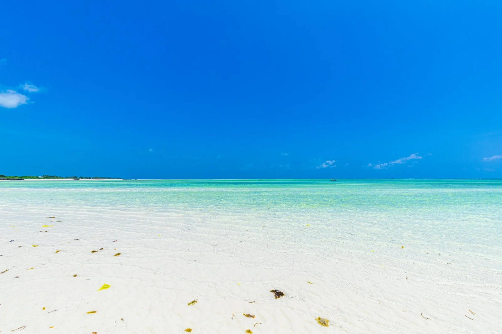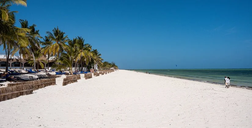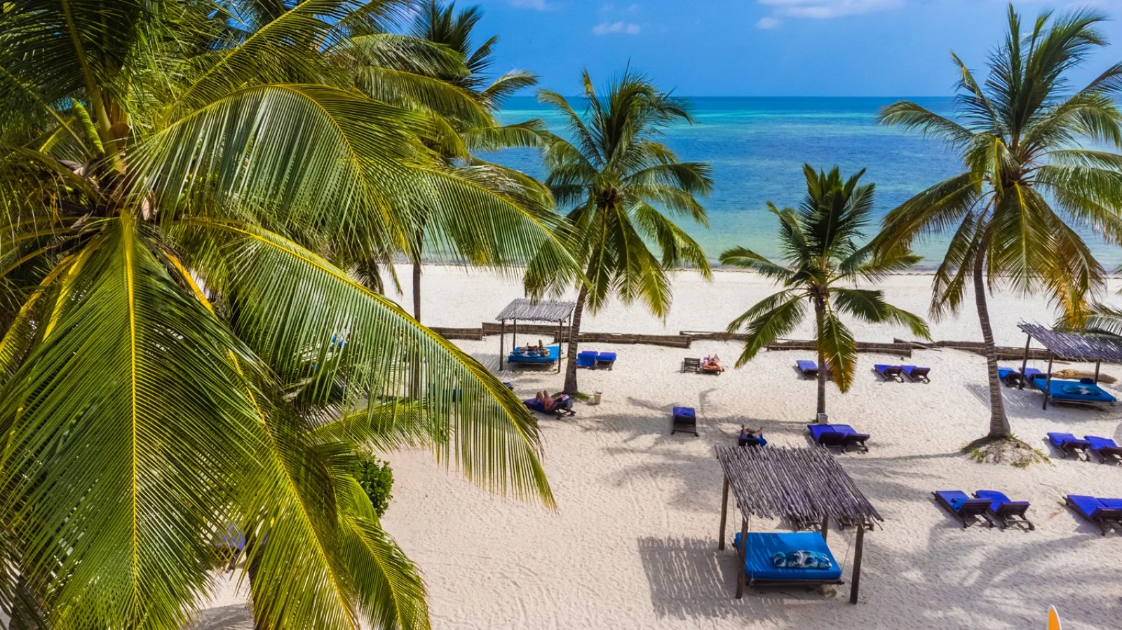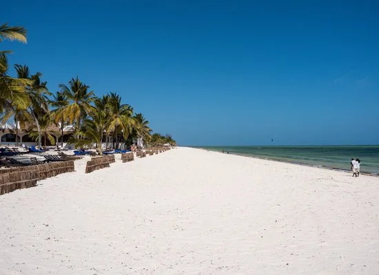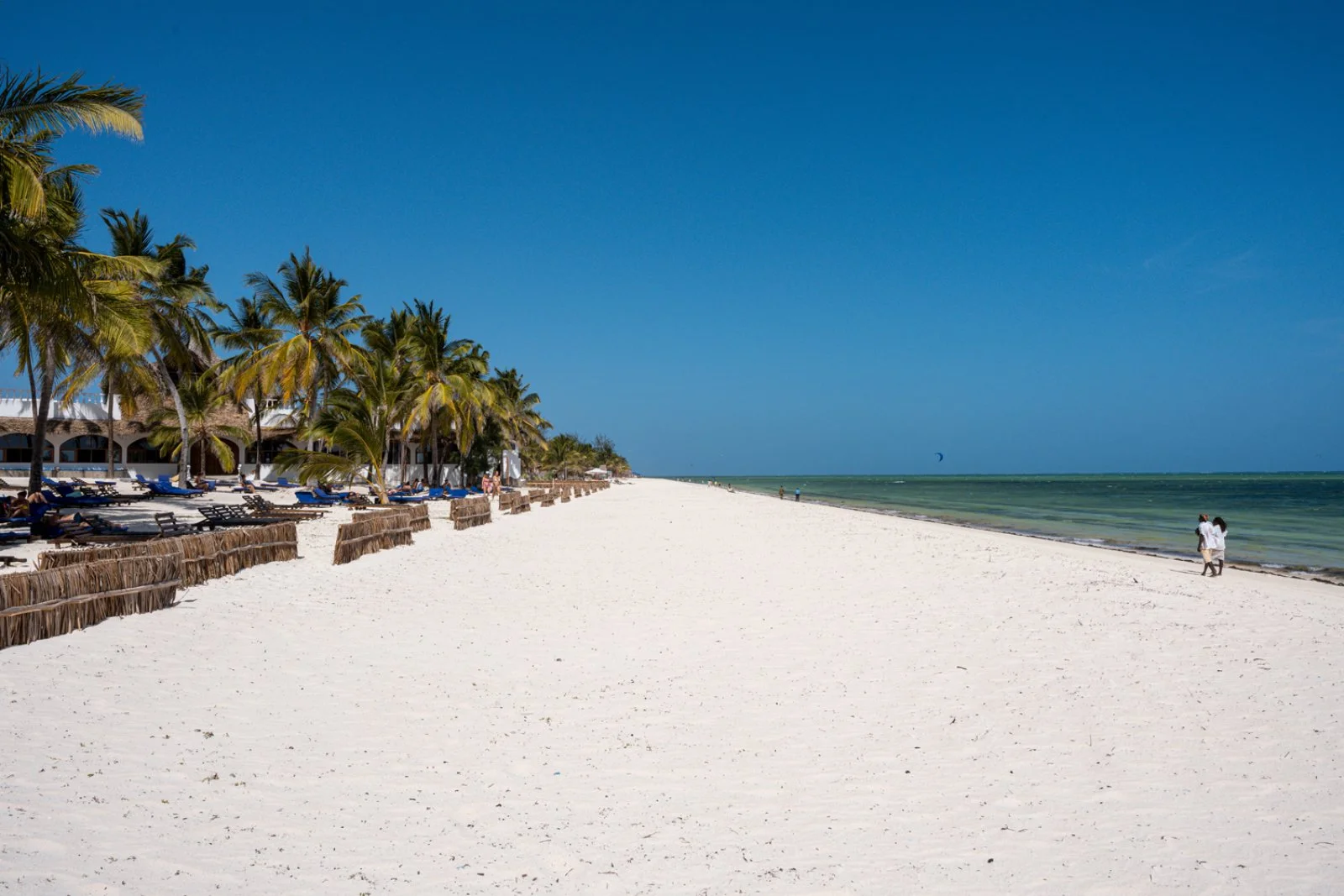 - Ampia spiaggia di sabbia bianca e finissima, bagnata dalle acque cristalline dell'oceano Indiano con sfumature dall'azzurro al verde, con lettini ombreggiati dalle palme