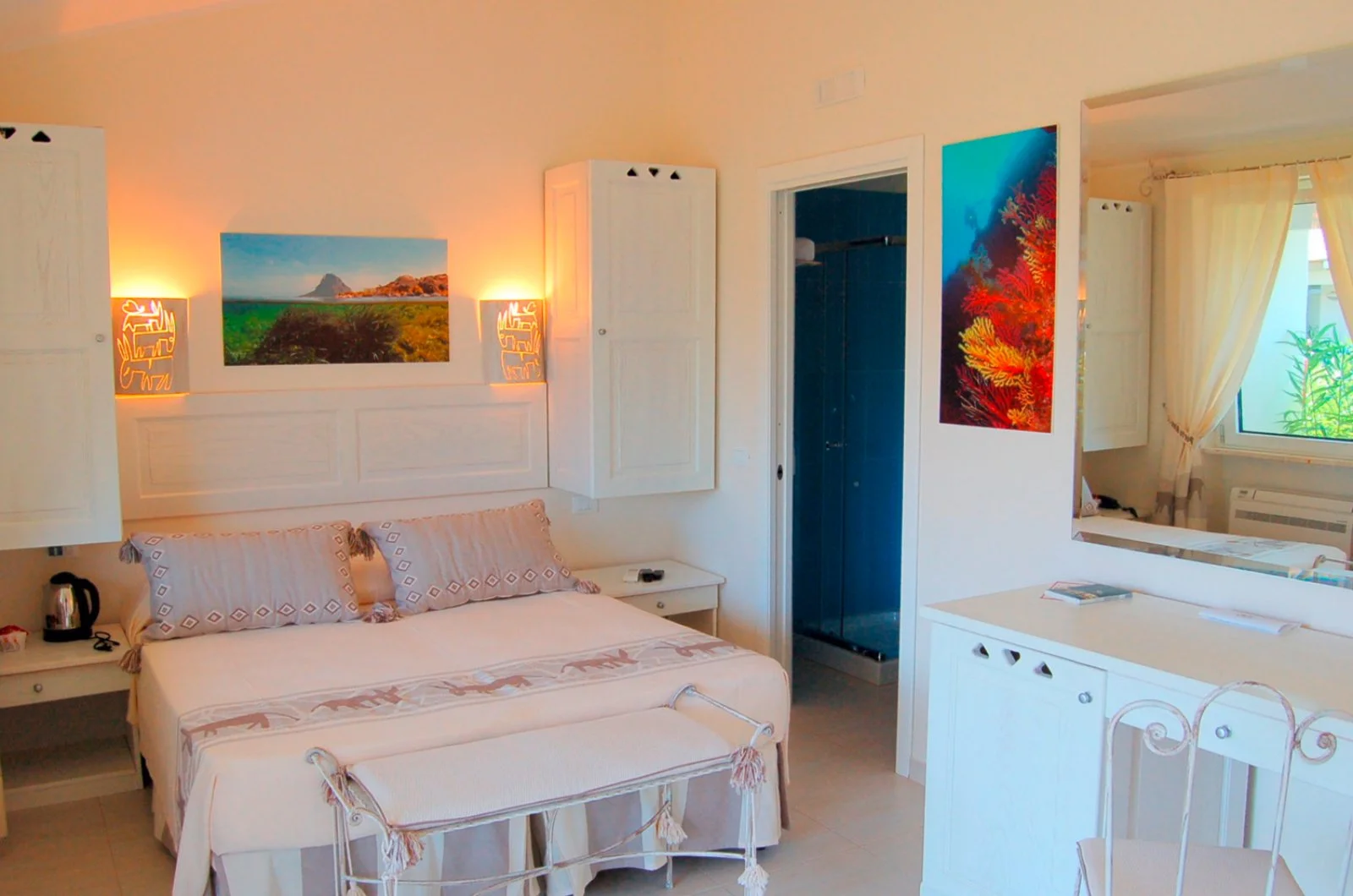 28 camere, disposte su di un unico livello e in grado di ospitare fino a 3 adulti in un letto matrimoniale e un divano letto o letto a castello, con servizi privati, asciugacapelli, tv, telefono, cassetta di sicurezza, aria condizionata e veranda. A pagamento, culla e minibar. Disponibili, con supplemento, camere classic con giardino privato. Connessione wi-fi gratuita nelle aree comuni.