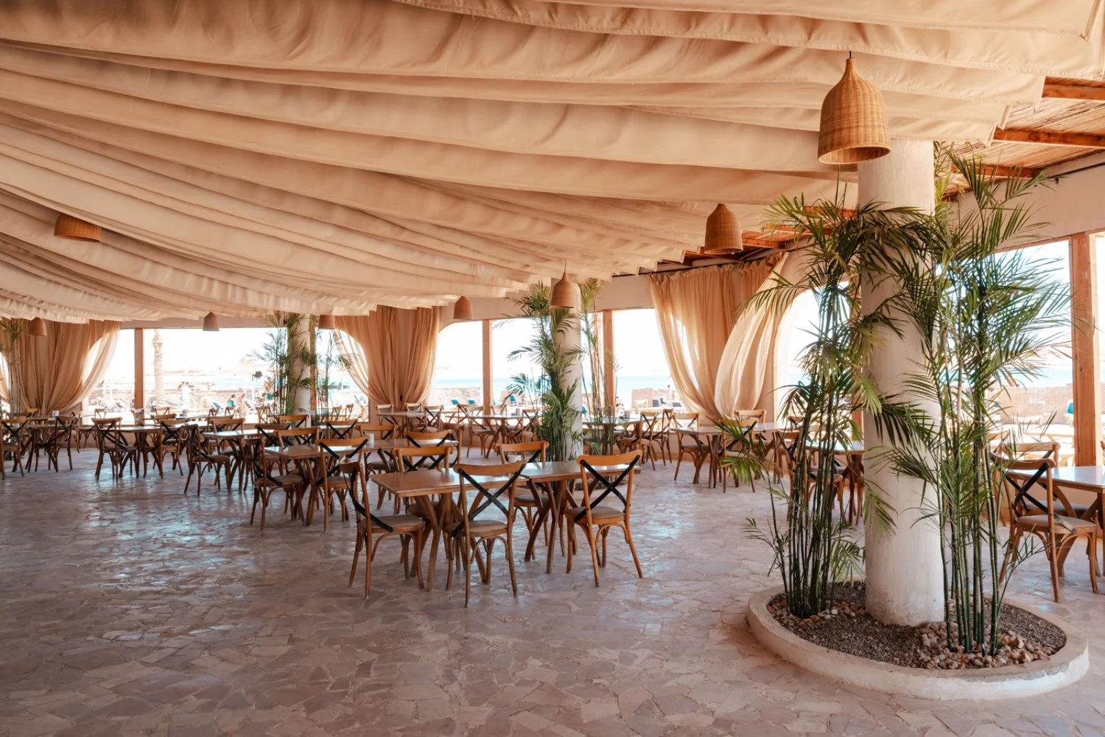 ampia baia, subito oltre il parco acquatico, lunga circa 1000 m, con ombrelloni, lettini e teli mare a disposizione. E’ formata da una zona con accesso sabbioso digradante e la barriera corallina è facilmente raggiungibile a nuoto (si consiglia l’uso delle apposite scarpette). Una navetta interna collega la reception con la spiaggia ogni 15 minuti.