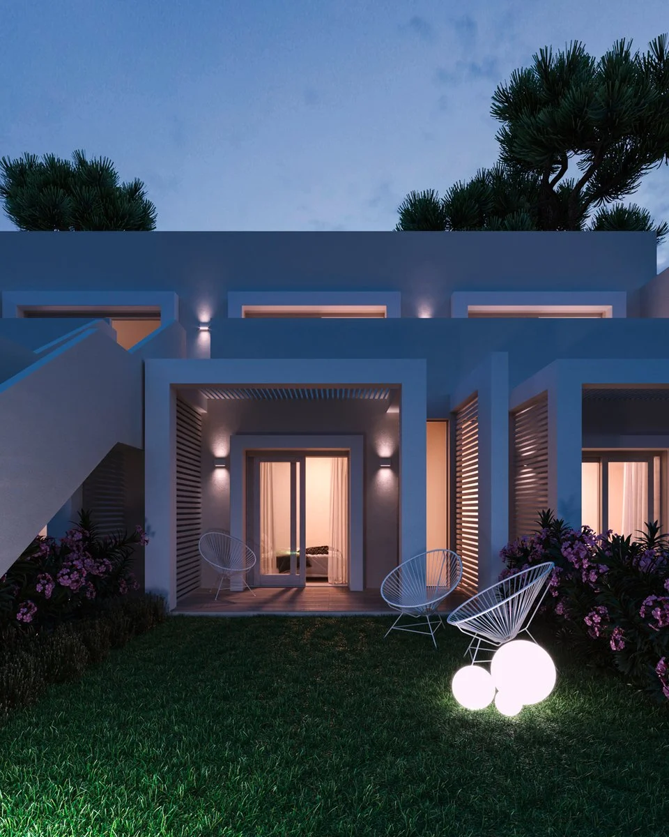 56, divisi in 5 gruppi abitativi circondati da giardini. Dal design contemporaneo, sono finemente arredati e dotati di ogni comfort, alcuni a piano terra con patio, altri al primo piano con terrazzo attrezzati con tavolo e sedie. Dispongono di aria condizionata, servizi con doccia e asciugacapelli, tv, connessione wi-fi ad uso parziale, angolo cottura, microonde, tostapane, bollitore e macchina da caffè con cialde o capsule.