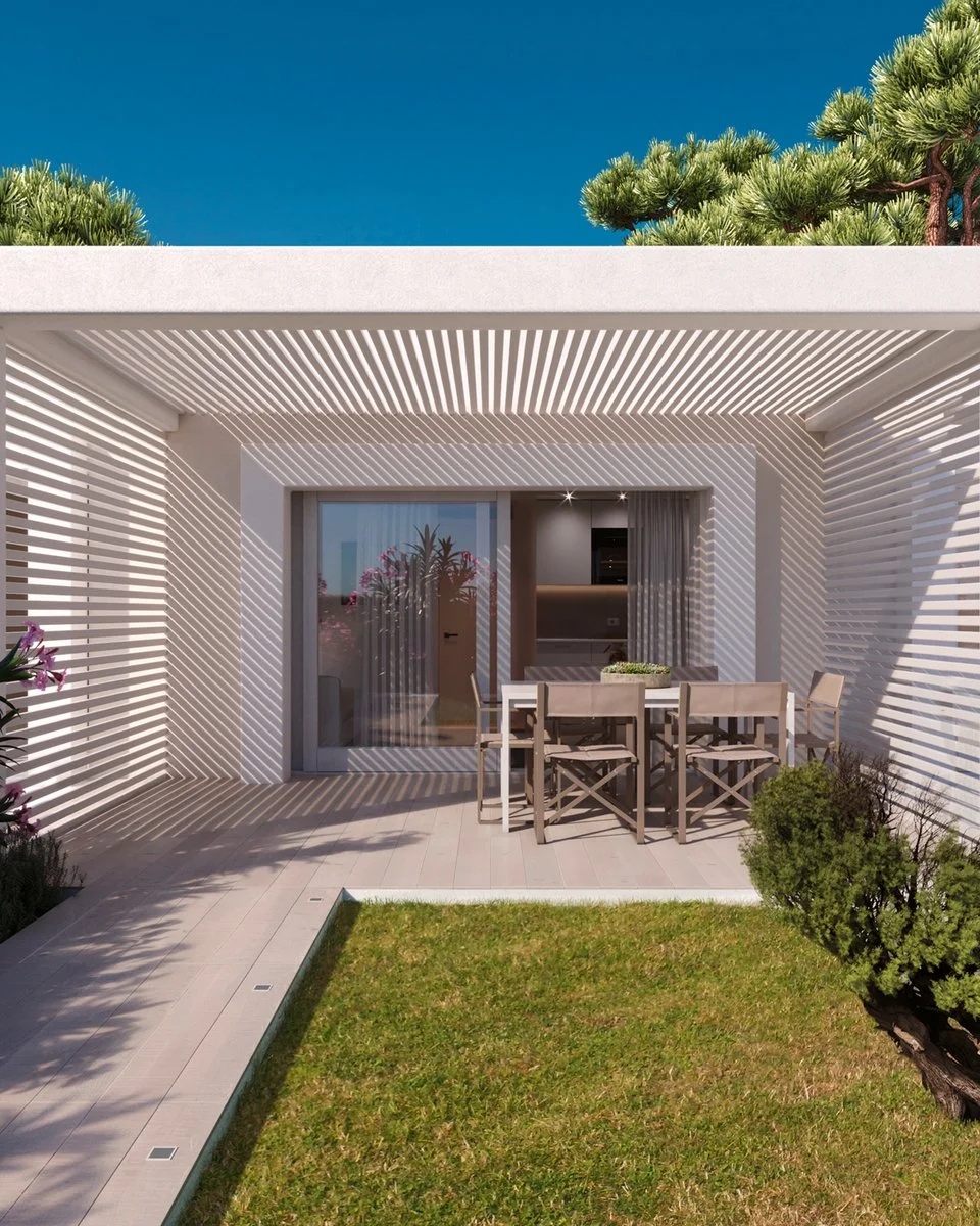 A pochi passi dalla spiaggia La Pelosa, il residence, dal design contemporaneo, dispone di appartamenti finemente arredati e dotati di ogni comfort divisi in 5 gruppi abitativi circondati da giardini.