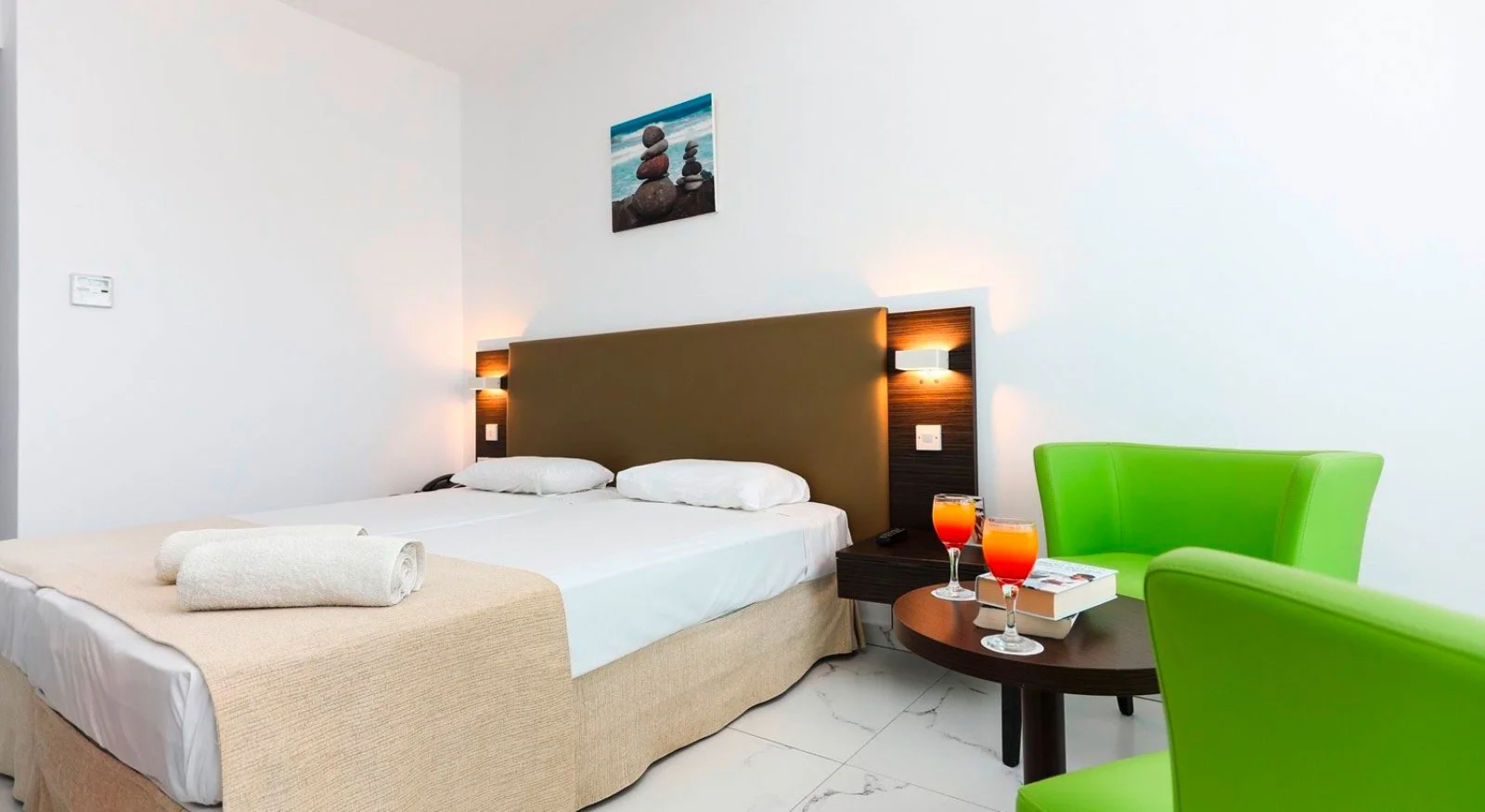189, tutte dotate di servizi privati, asciugacapelli, aria condizionata, telefono, TV satellitare, accesso internet Wi-Fi, cassetta di sicurezza, minifrigo, bollitore per tè o caffè, balcone. Le doppie standard, le doppie vista mare laterale, le vista mare e le deluxe queste ultime leggermente più spaziose, possono ospitare massimo 3 adulti. Dispone inoltre, di family superior vista mare laterale con ambiente unico, in grado di ospitare fino a 4 adulti.