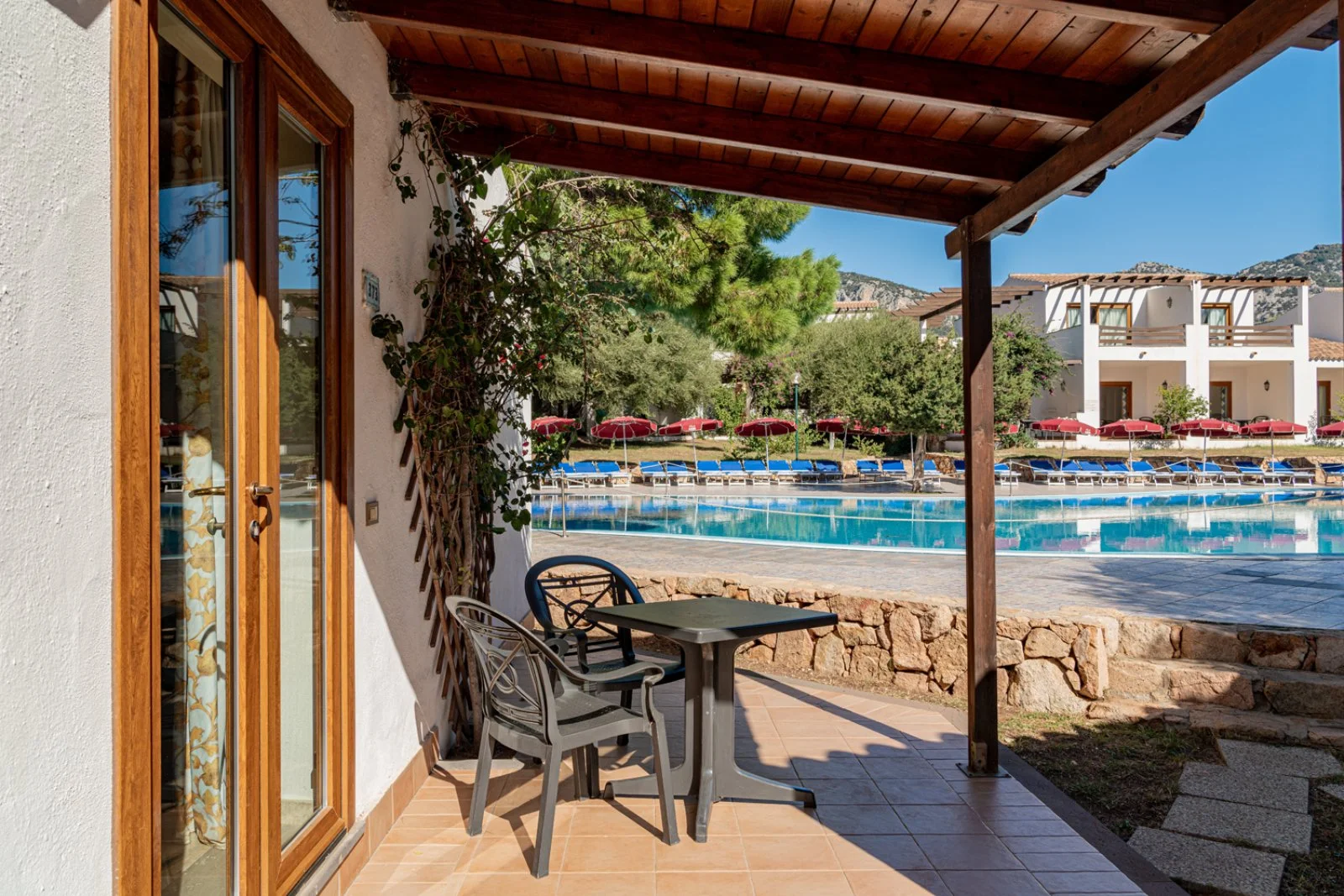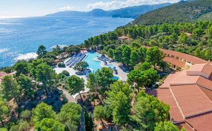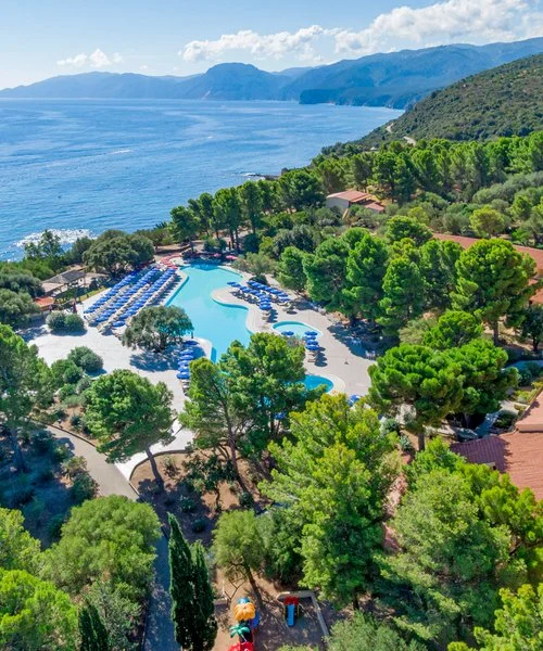 La struttura si suddivide in 2 distinte zone: Village con 350 camere tra corpo centrale e costruzioni distribuite nel parco, disponibili anche Family a doppio ambiente da 4 e 5 posti letto e un bagno; zona Borgo Exclusive con 73 camere in villette a due piani, intorno alla piscina riservata. Tutte le camere dispongono di terrazza o veranda, aria condizionata, tv, mini-frigo, telefono, asciugacapelli, cassetta di sicurezza, servizi con doccia. Singole, doppie, matrimoniali, triple, quadruple e quintuple (quintuple solo nella zona Village).
