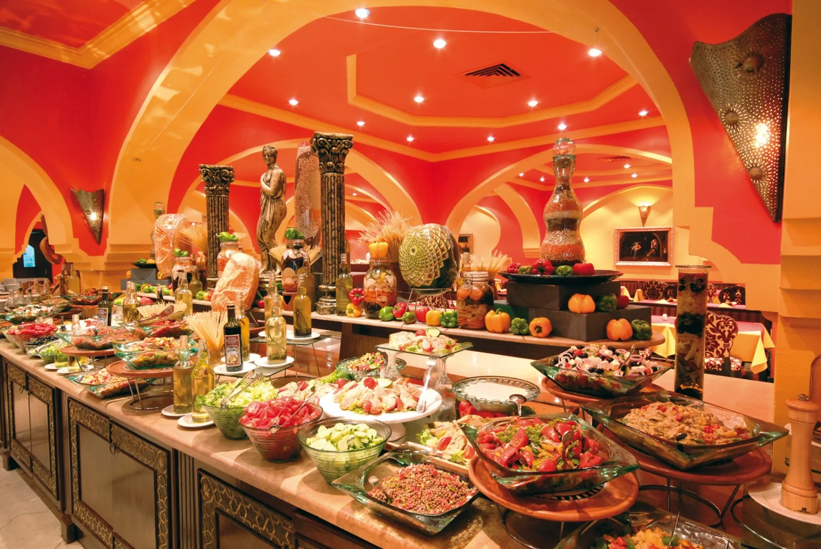 12 ristoranti. 3 a buffet, Il Giardino, Coral e Spices. 8 ristoranti à la carte a pagamento, il Plasirs dall’ambiente raffinato con cucina italiana, lo Steak House con specialità grill, La Piazzetta con specialità di pasta e pizza, The Beach sulla spiaggia, Alibaba con forno a legna per la pizza, Blue Lake sul Lago Salato, Prestige Beach Restaurant e La Cava, anche questo con tipiche ricette italiane. 13 bar fra cui 5 a pagamento e 8 compresi per i clienti Eden Viaggi, il Main Beach bar, il Main Pool Bar, il 56 Pool Bar, il Sultan Beach bar, il Bellavista Pool bar, l'Harem Pool bar, l'Harem Lobby bar e il Pergola bar.