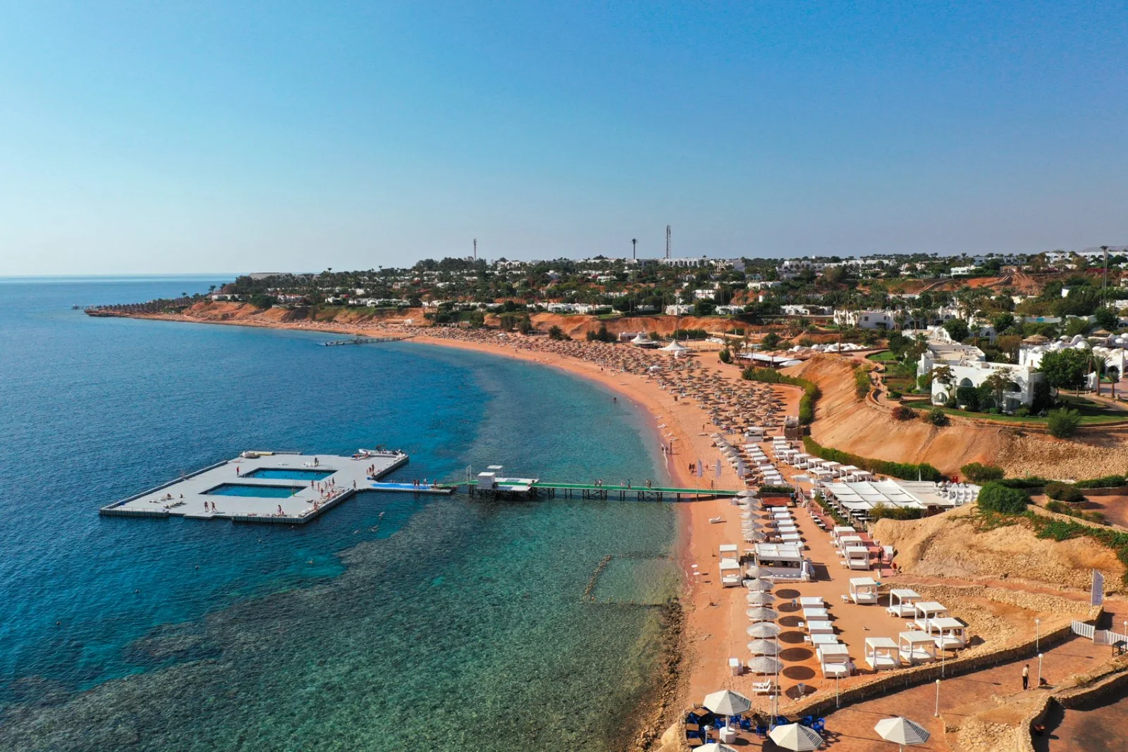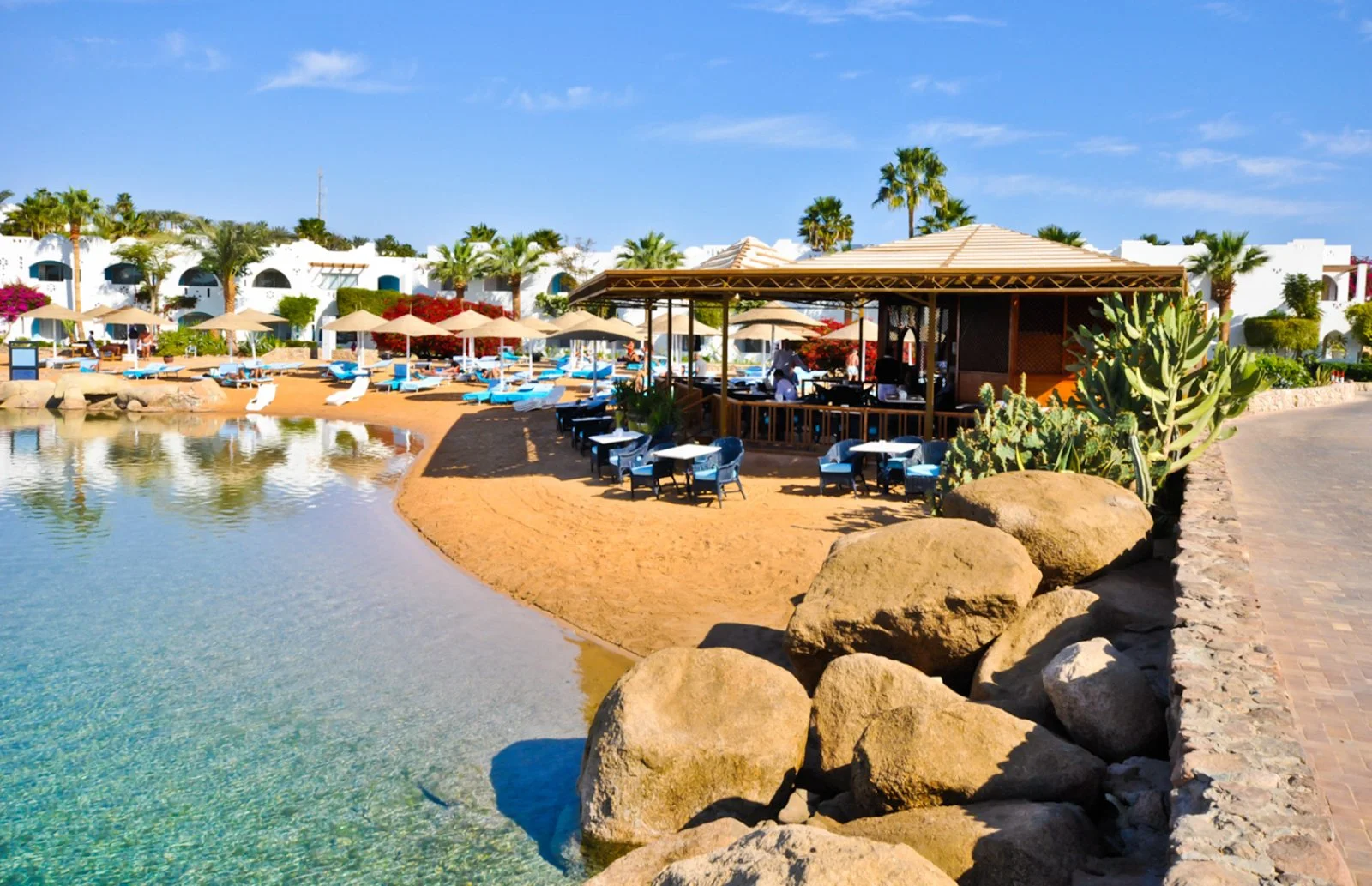 con bellissima vista sulla baia, in posizione isolata e tranquilla ma al tempo stesso ben collegata a tutte le aree e attività del complesso. I clienti hanno a disposizione la spiaggia principale della struttura, completamente attrezzata, quella stessa spiaggia che ha reso celebre il resort, con i suoi due chilometri di sabbia fine e la bellissima barriera corallina. L’accesso al mare è permesso da uno spettacolare e scenografico pontile, con spaziosa zona solarium e piscine galleggianti in mare aperto. La spiaggia si trova a circa 500 metri dall’Harem ma è facilmente raggiungibile anche grazie ad un servizio taf taf, che collega in servizio continuo tutte le zone del resort. L’ Harem è uno degli hotel di più recente costruzione all’interno del complesso, offre un’