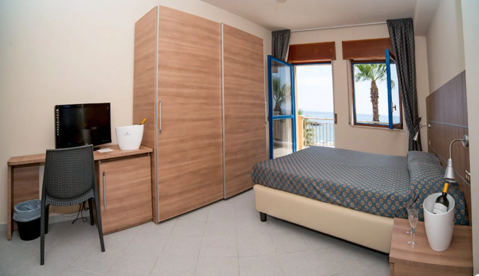 69, situate in tre diverse strutture con servizi privati, asciugacapelli, aria condizionata, riscaldamento, tv satellitare, cassaforte, frigobar. Si dividono in standard con affaccio sul retro distaccate dal corpo centrale e senza ascensore, alcune sono al piano terra e dispongono di finestra e terrazzo attrezzato con vista interna, altre situate al primo o al secondo piano e dispongono di balcone con vista interna, attrezzato con sedie e tavolino; standard in palazzina lato mare, staccate dal corpo centrale e senza ascensore, alcune al piano terra e dispongono di finestra e terrazzo attrezzato, altre al primo o al secondo piano e dispongono di balcone vista mare, attrezzato con sedie e tavolino; superior nell'edificio principale, sono di recente costruzione, e sono dotate di un'ampia terrazza fronte mare, attrezzata con poltrone e tavolino.