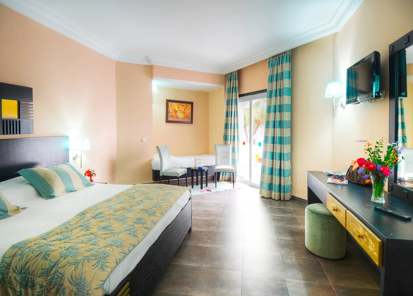378 camere (20 m², max 3 adulti o 2+2), in 15 blocchi o nel corpo centrale, tutte con balcone o terrazza, TV satellitare, asciugacapelli, aria condizionata (15/6 - 15/9), telefono, cassetta di sicurezza, connessione Wi-Fi gratuita, minifrigo (rifornito giornalmente d’acqua e soft drink). A pagamento, minibar. Le camere quadruple (27 m²) sono formate da una camera con letto matrimoniale con letto a castello. Con supplemento, family (35 m², max 4+1), con due camere da letto e un bagno.