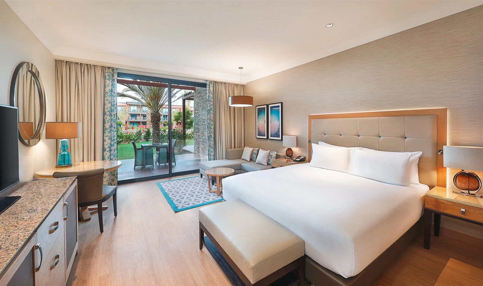 Dispone in totale di 240 camere, suddivise in guest room, con due letti queen (occupazione massima 4 adulti) o con letto king-size (occupazione massima 3 adulti e 1 infant), superior vista piscina, con un letto king-size (occupazione massima 3 adulti) o due letti queen (occupazione massima 4 adulti), e deluxe (occupazione massima 3 adulti e 1 infant). Tutte le camere, moderne e confortevoli, dispongono di telefono, Wi-Fi gratuito, aria condizionata, minibar, bollitore per la preparazione di caffè e tisane, TV satellitare a schermo piatto, cassaforte, balcone o terrazzo.