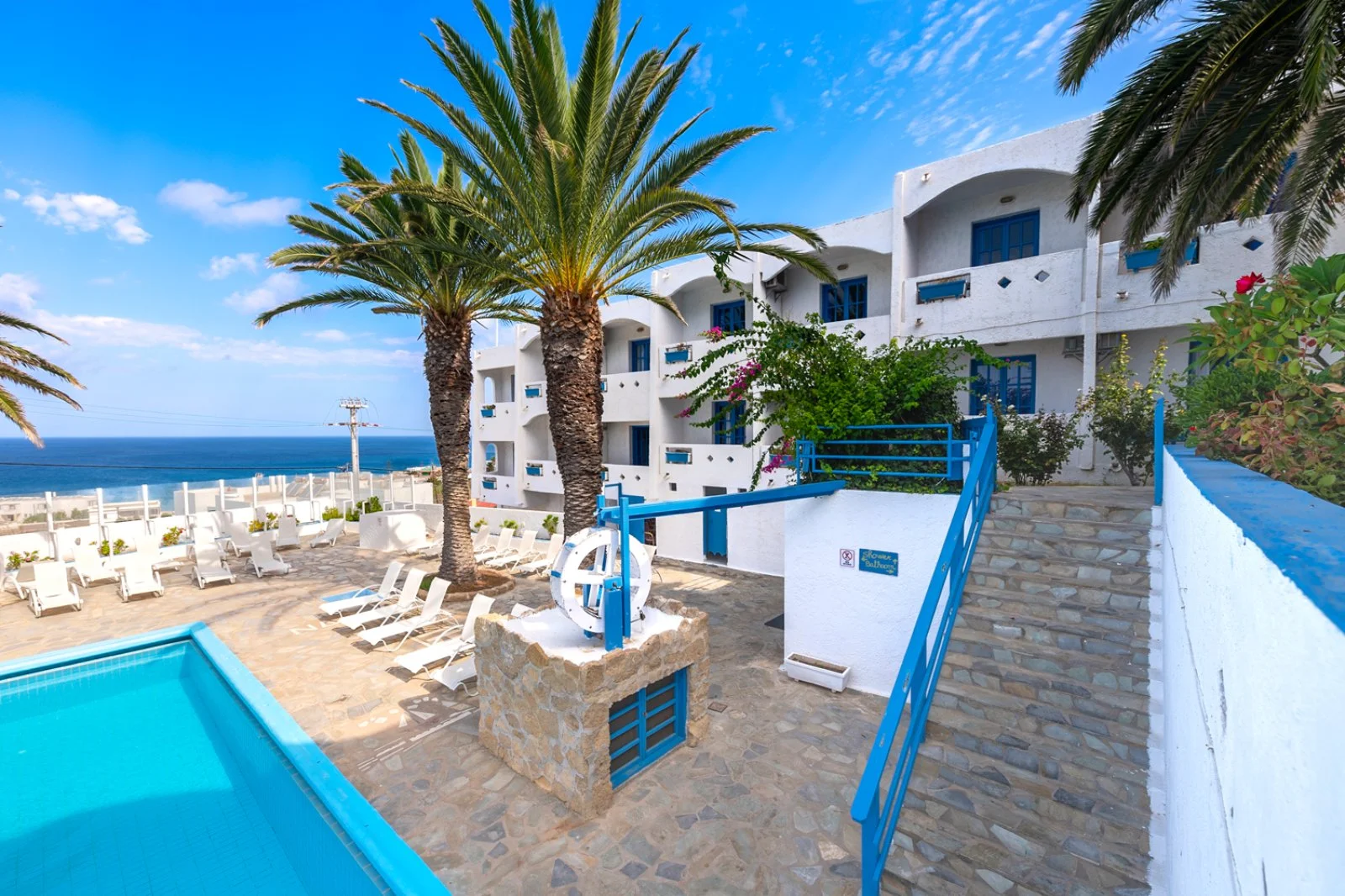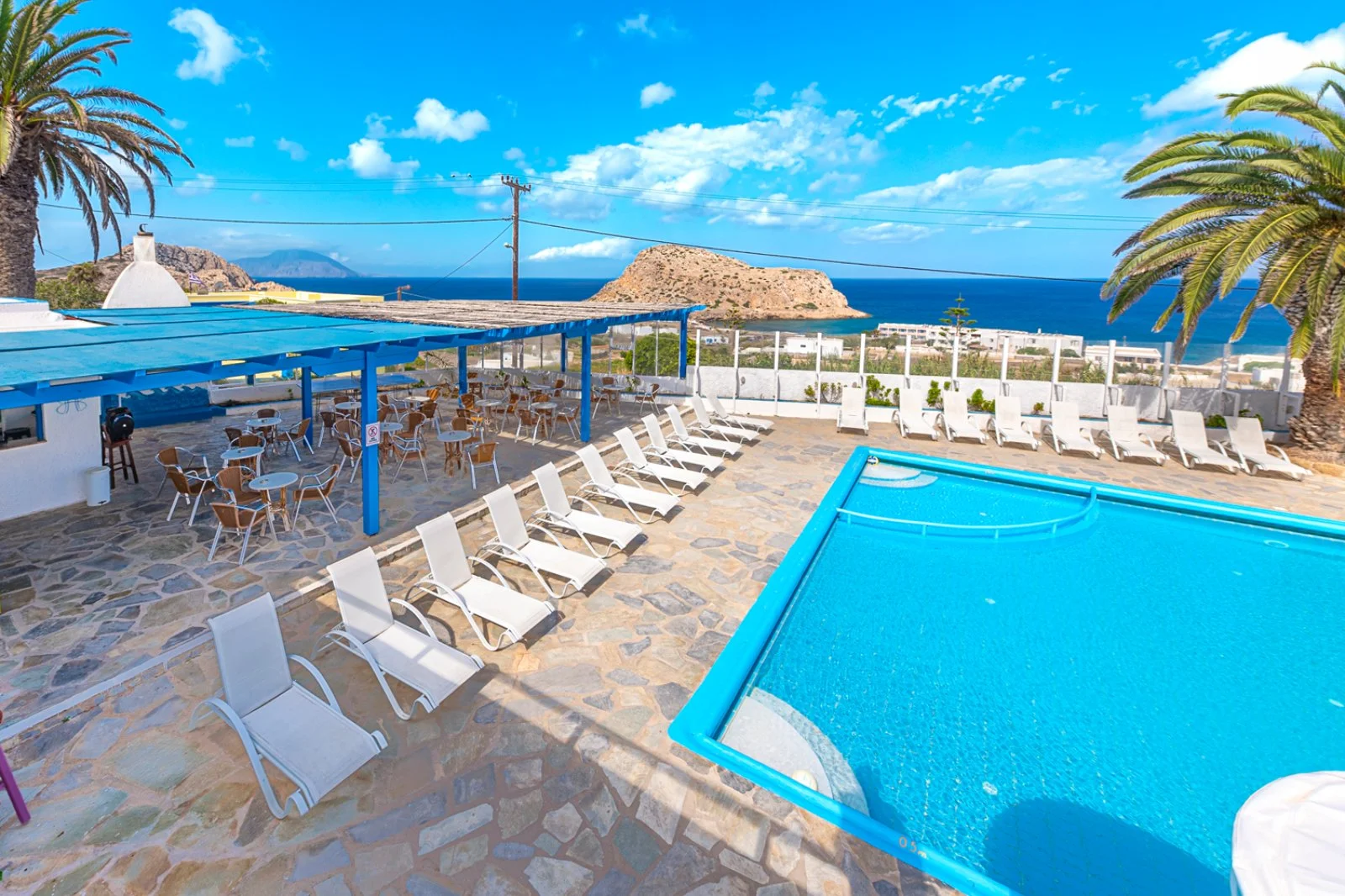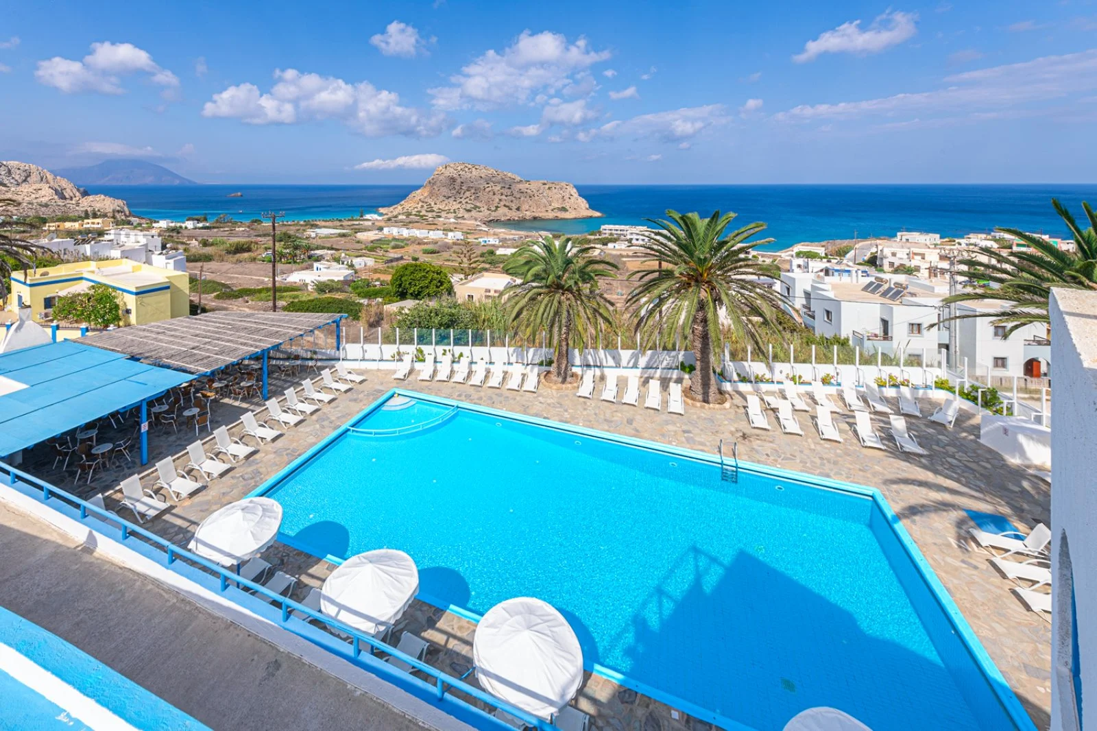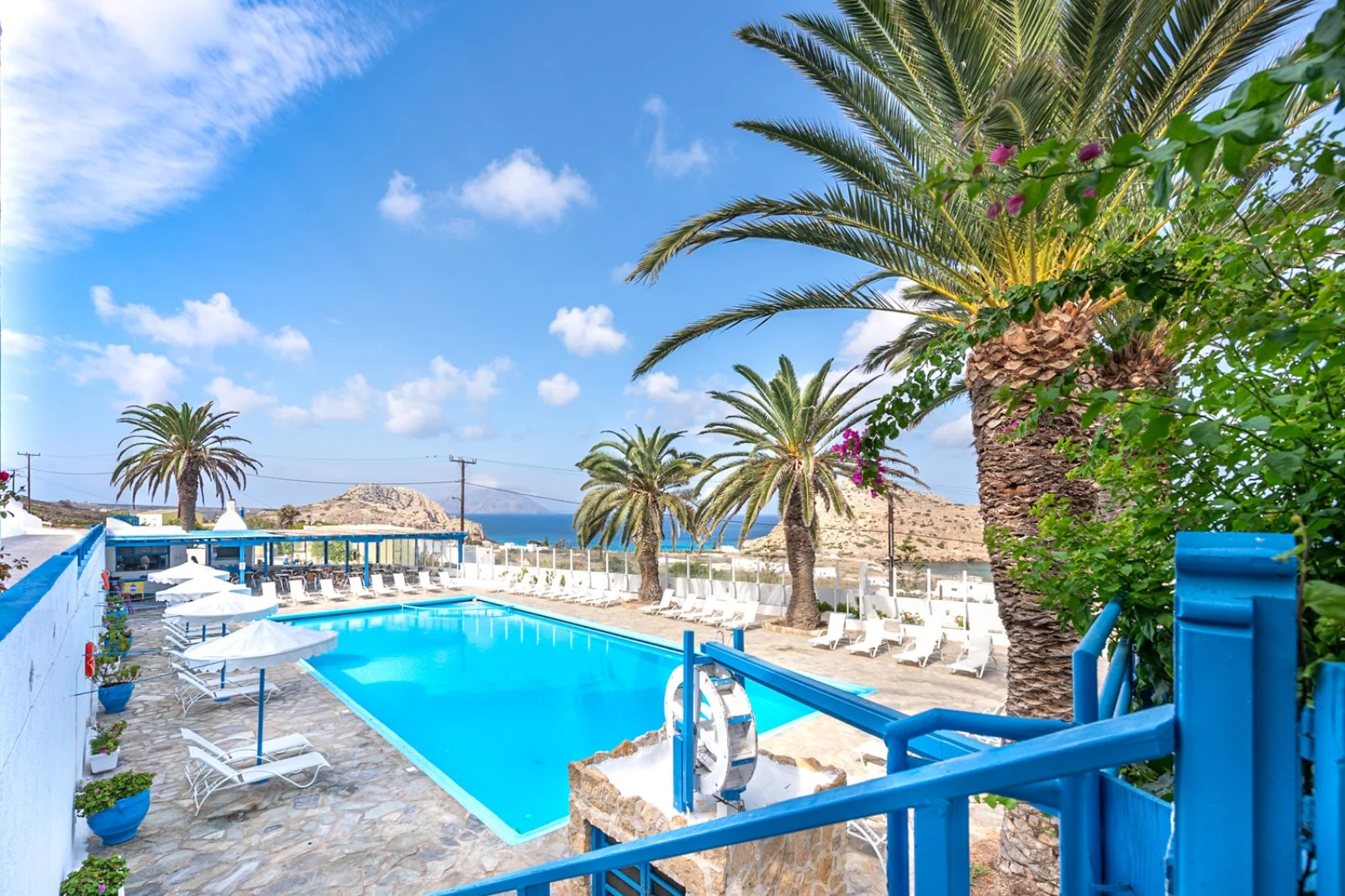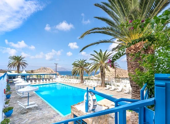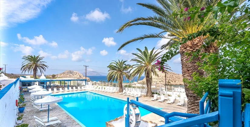 Semplice ed essenziale nelle sue linee, la struttura è tipicamente greca, con i suoi colori bianchi ed azzurri; in alcune parti riproduce gli antichi mulini con le sue vele; un servizio navetta permette di raggiungere la spiaggia agevolmente e una fermata del bus permette di spostarsi sull’isola. Inutile dire che con un noleggio auto o scooter è un ottimo punto di partenza per esplorare questa bellissima isola, che offre tipologie di paesaggio veramente inaspettate. Il centro dell’isola è tipicamente montano, come se ci trovassimo in tutt’altro posto, da cui si scorgono le bellissime baie e calette dai colori cristallini. Per gli amanti della cultura, a solo 1 km dall’hotel si trova il paese di Arkasa con il suo museo folkloristico, mentre a 3 km Finiki, il caratteristico villaggio dei pescatori.