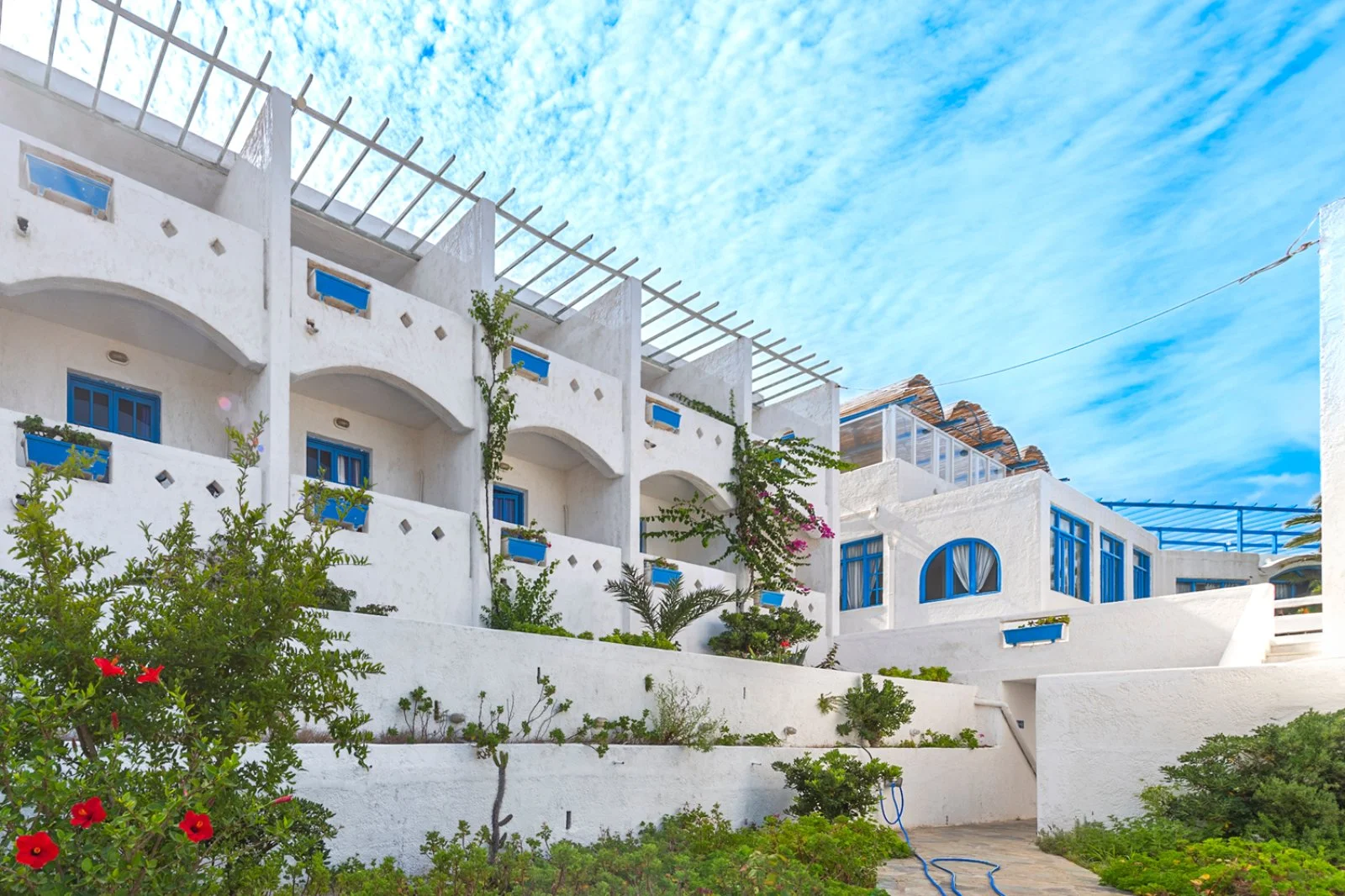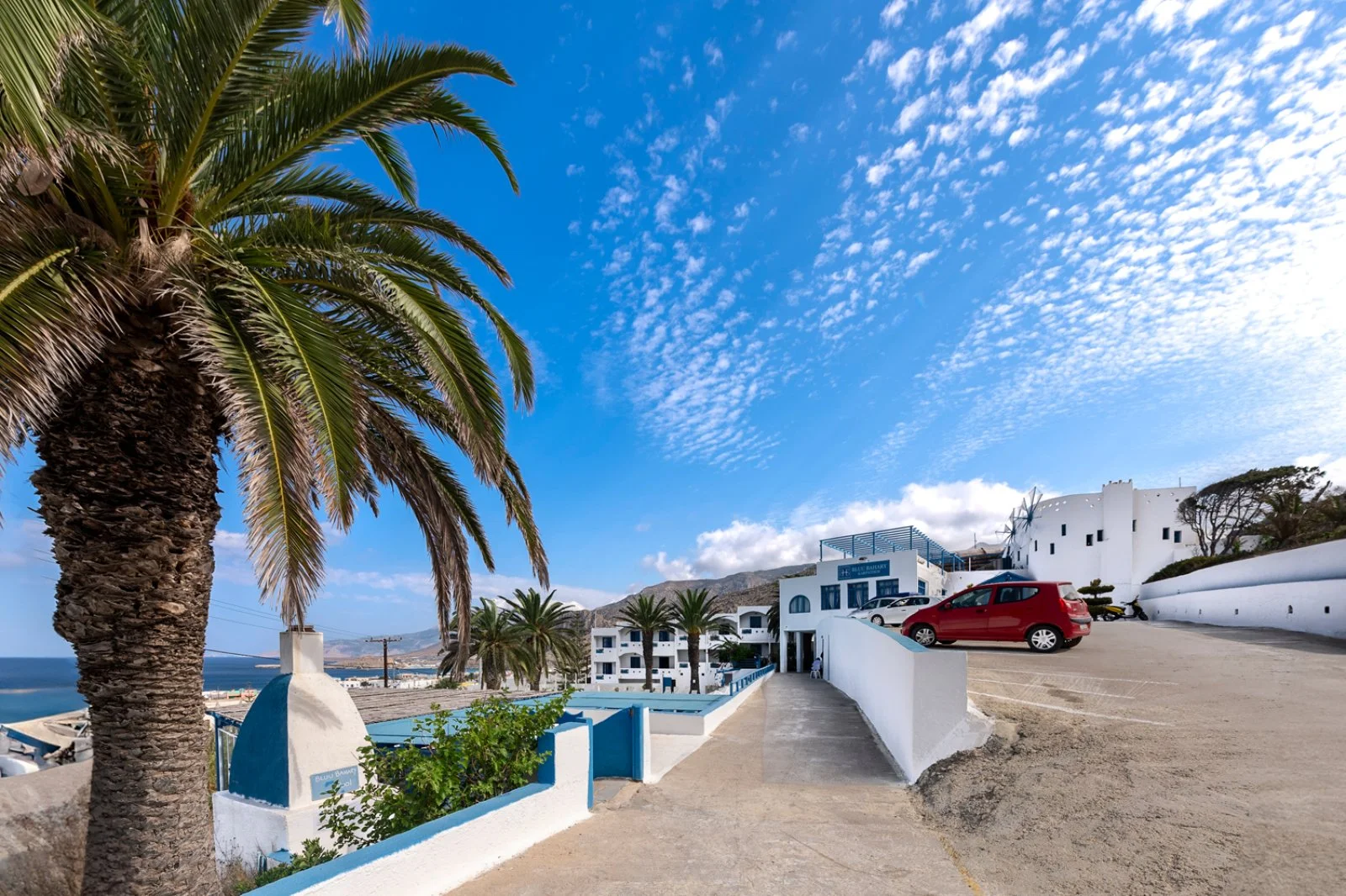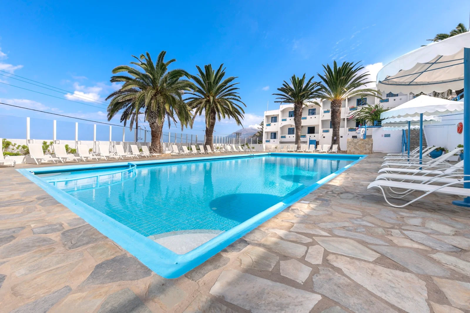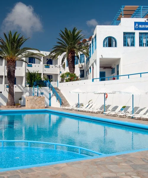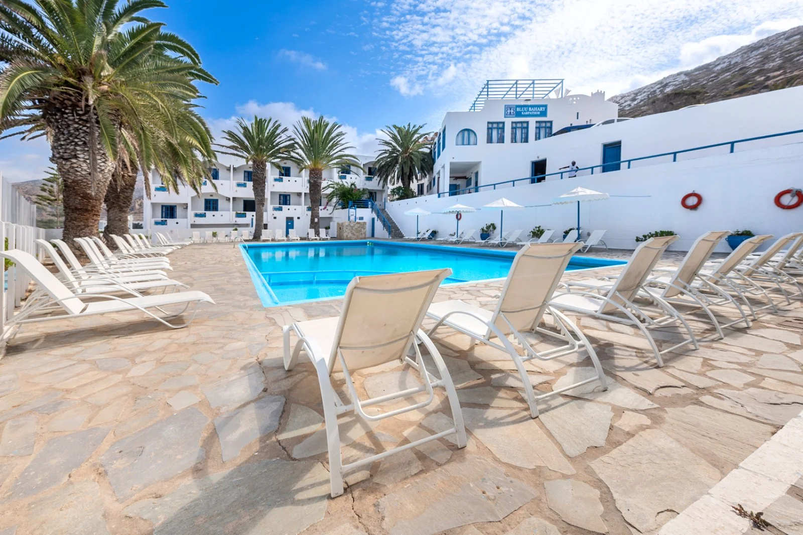 Semplice ed essenziale nelle sue linee, la struttura è tipicamente greca, con i suoi colori bianchi ed azzurri; in alcune parti riproduce gli antichi mulini con le sue vele; un servizio navetta permette di raggiungere la spiaggia agevolmente e una fermata del bus permette di spostarsi sull’isola. Inutile dire che con un noleggio auto o scooter è un ottimo punto di partenza per esplorare questa bellissima isola, che offre tipologie di paesaggio veramente inaspettate. Il centro dell’isola è tipicamente montano, come se ci trovassimo in tutt’altro posto, da cui si scorgono le bellissime baie e calette dai colori cristallini. Per gli amanti della cultura, a solo 1 km dall’hotel si trova il paese di Arkasa con il suo museo folkloristico, mentre a 3 km Finiki, il caratteristico villaggio dei pescatori.